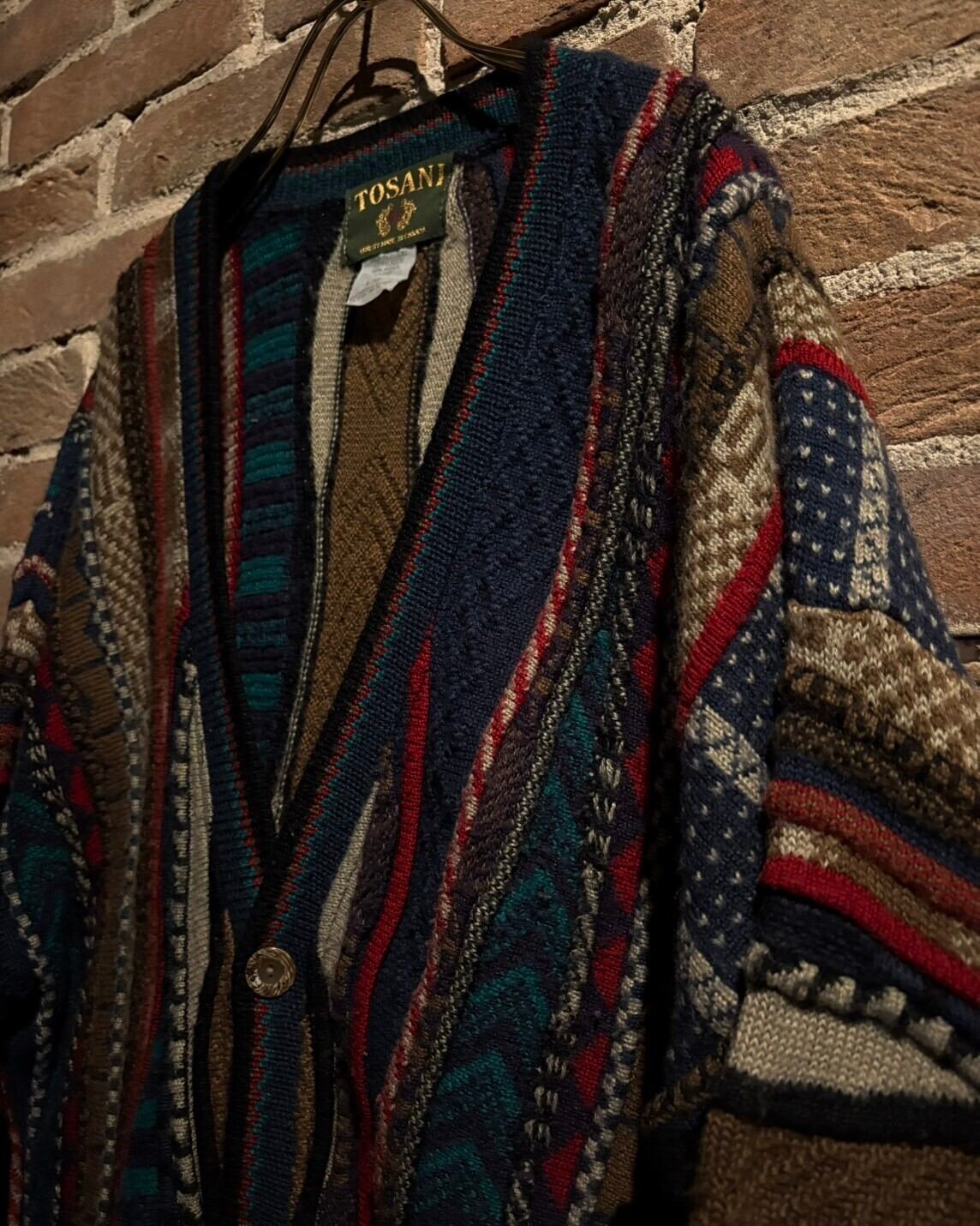 緻密で繊細なニッティングによって生まれたうねりの効いた立体感が美しい3Dニットのカーディガン。アクリルxウールの混合。柔らかなテクスチャーに引を取らぬ上質な保温力を持つニット素材で着心地も抜群。COOGIやTUNDRAにもブランドの趣向がある色味ですが”TOSANI“の配色もめっちゃくちゃ良い…