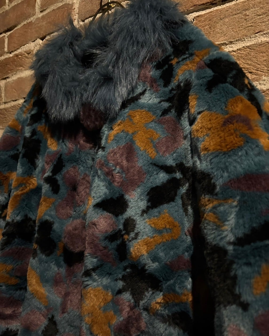 フワッと柔らかなフェイクファーを用いたボディに、多彩なカラーリングで抽象柄を載せたファーポンチョ。
