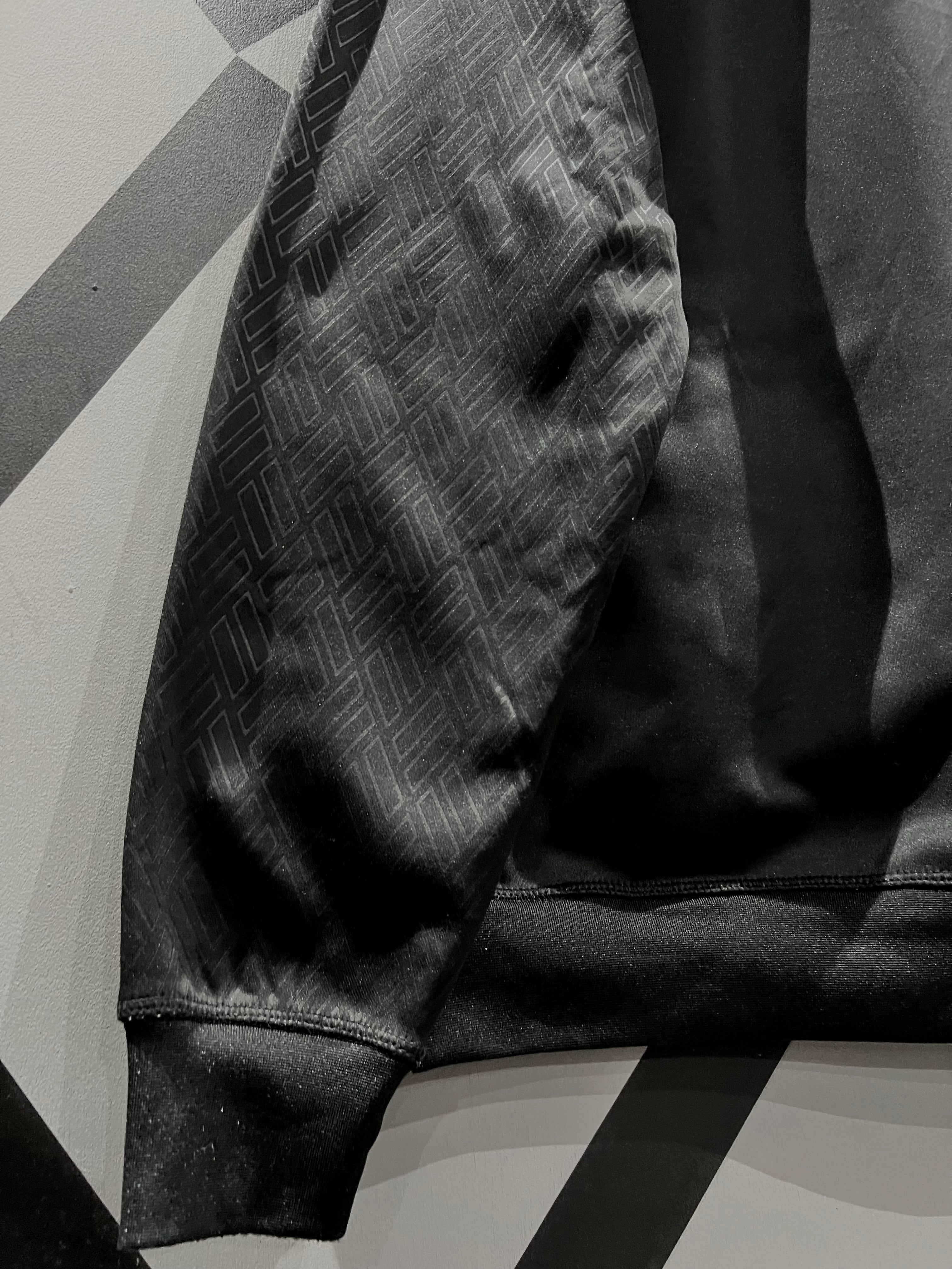 いわゆるスウェット生地ではなく、トラックジャケットに用いられるジャージの様な生地を用いており、モノトーンのデザインも相まってスポーティかつモードな仕上がりに。