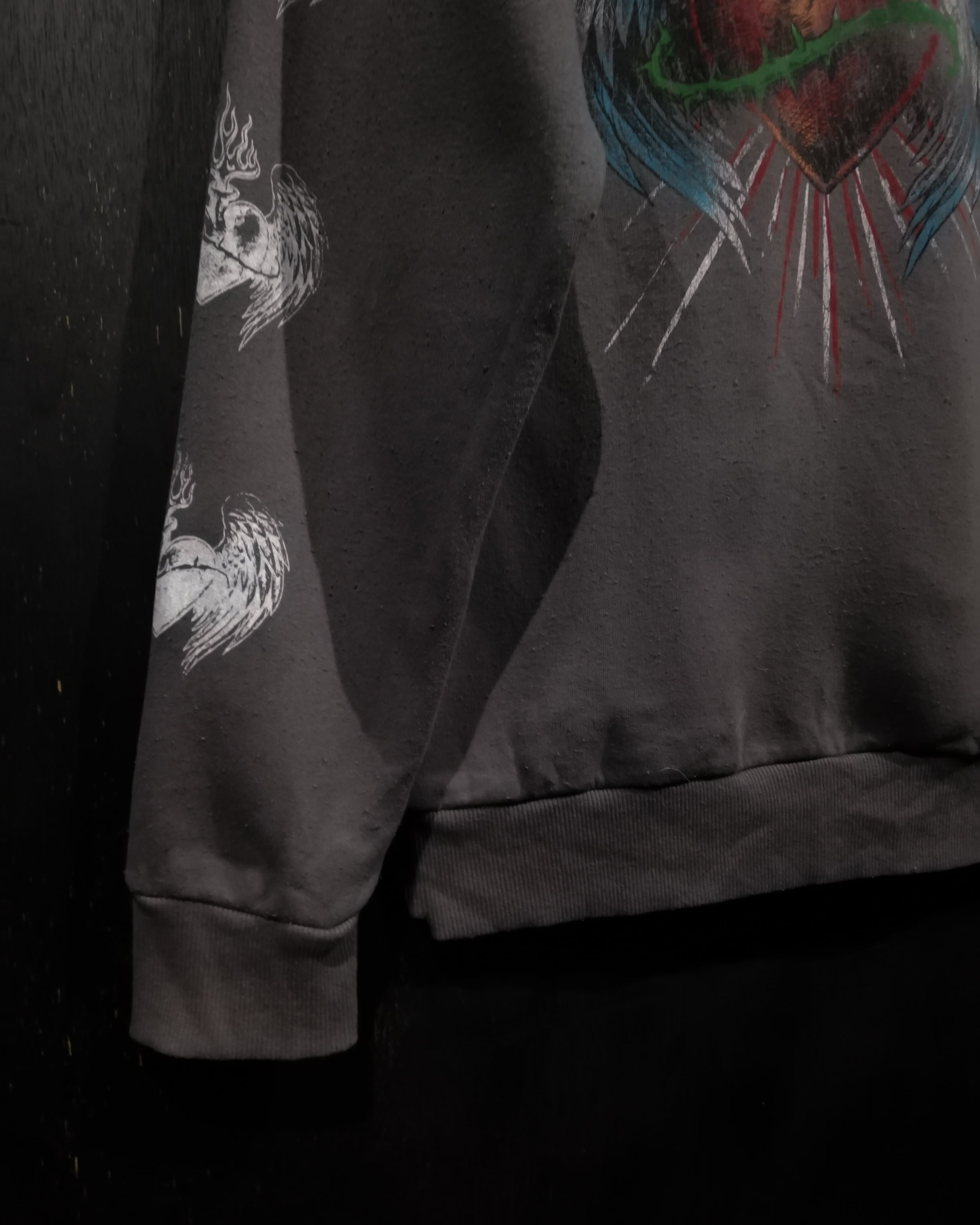 グレーのボディをベースに、アメリカントラディショナルなタトゥーモチーフのプリントを載せたジップアップフーディ。