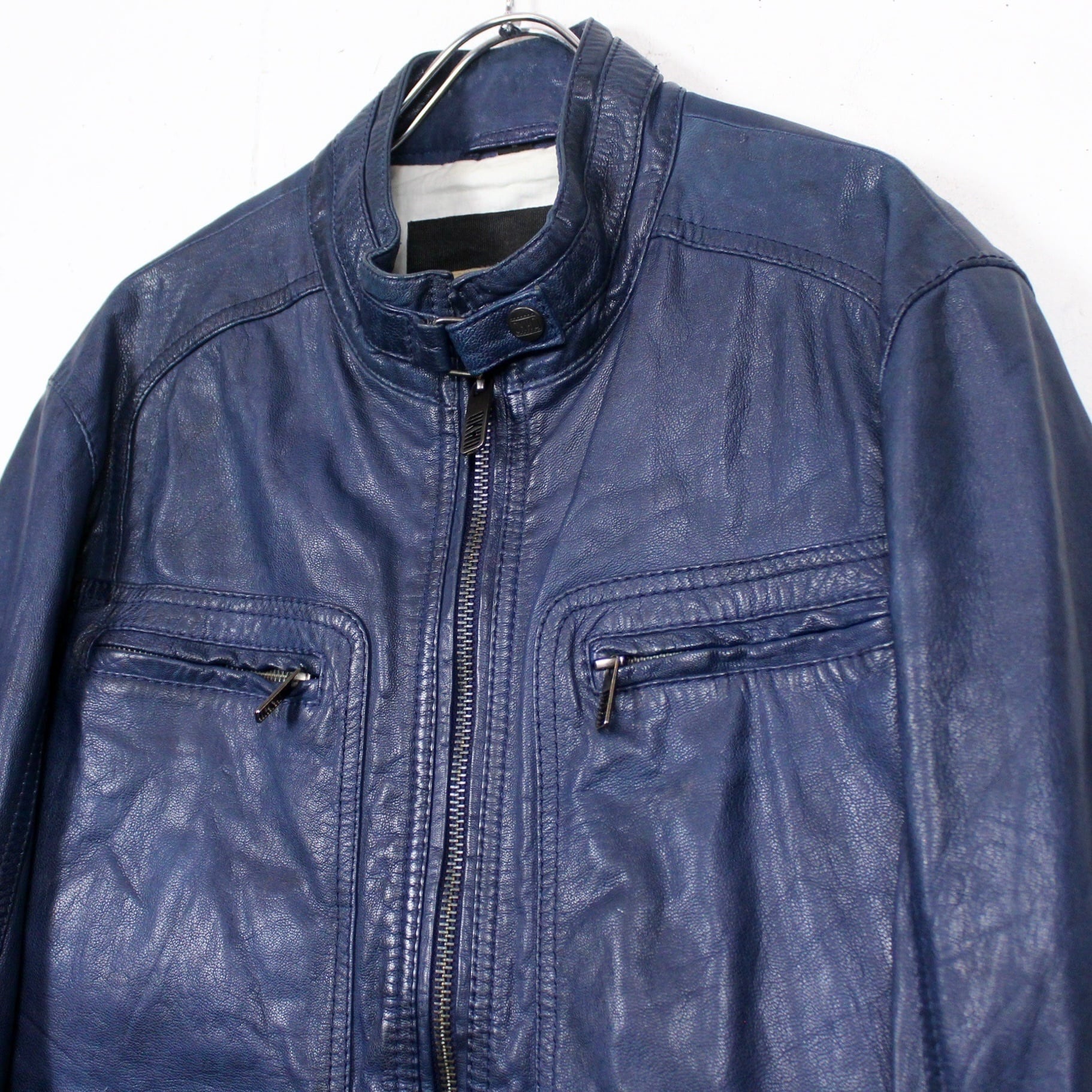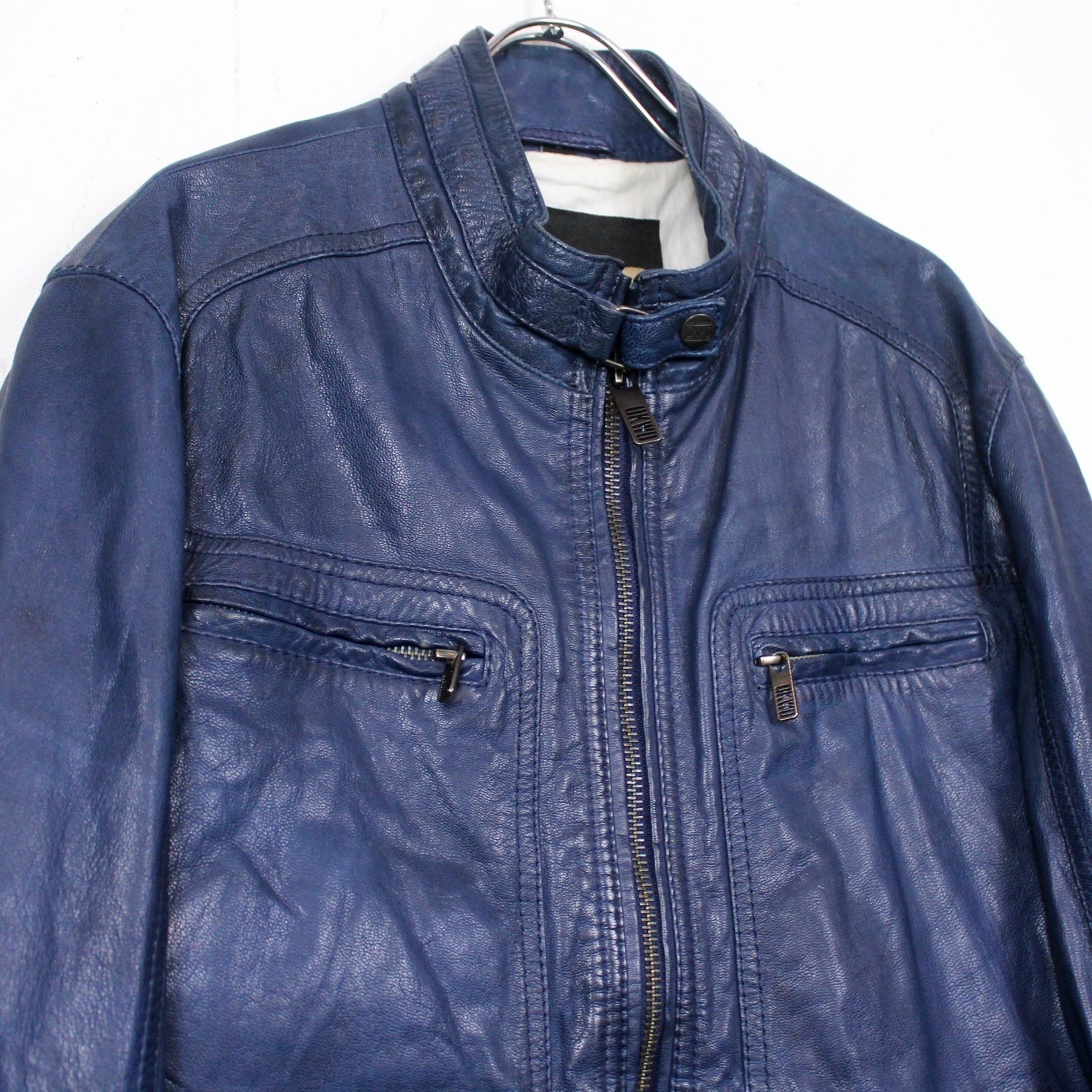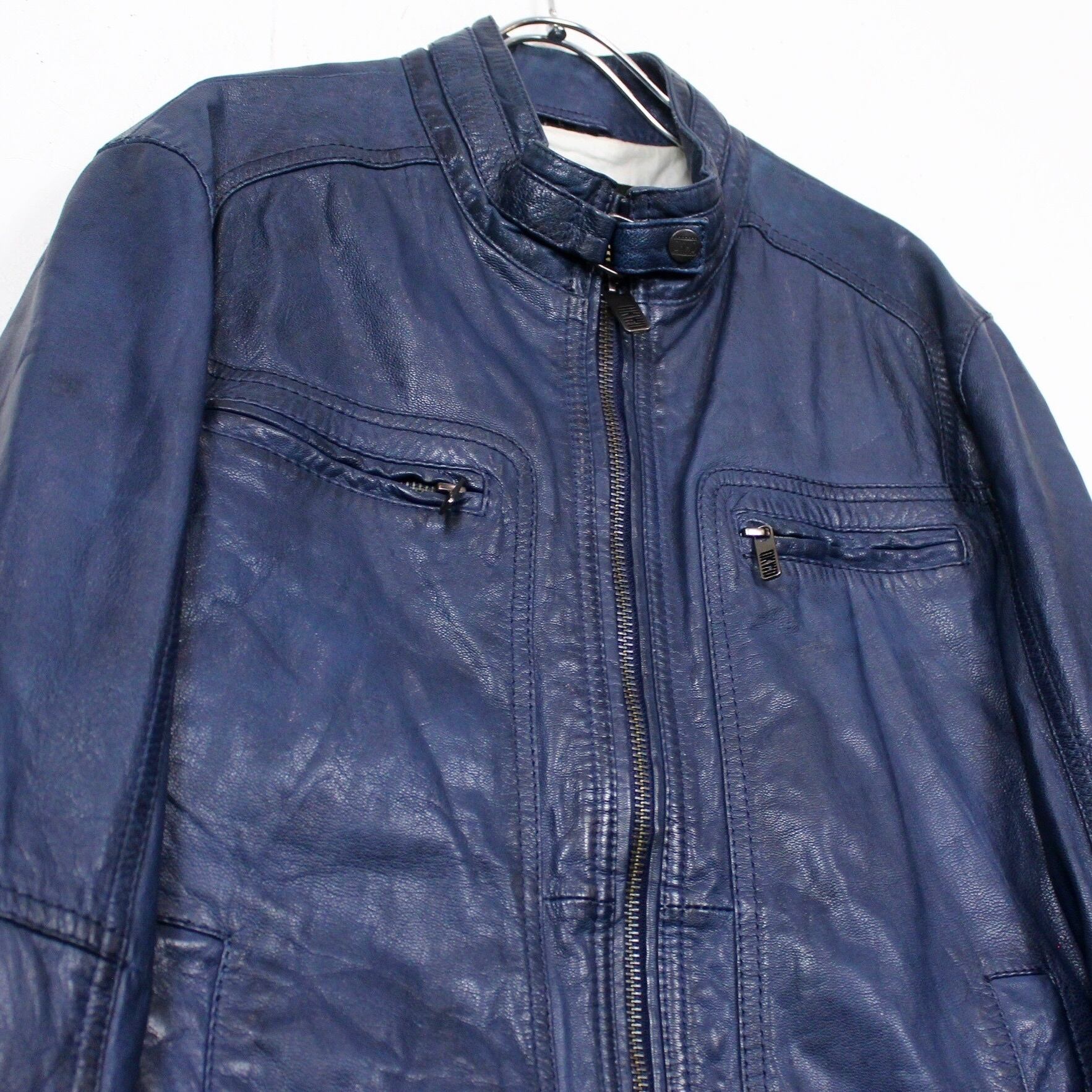濃く深い青のカラーリングで仕上げた上質なレザーを使用したレザージャケット。色残りも良く状態も非常に良い…