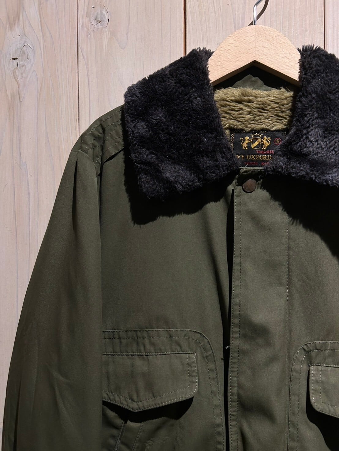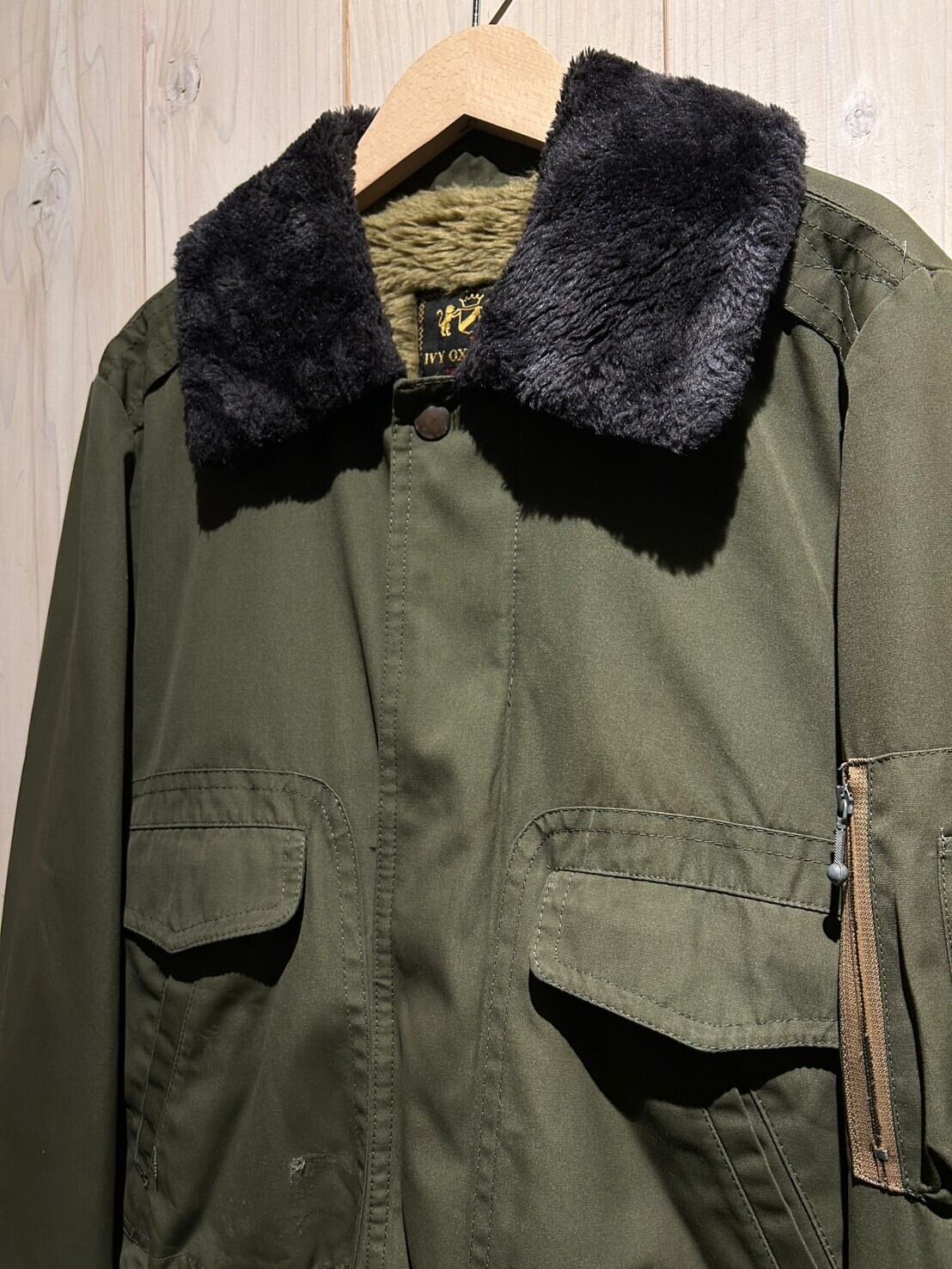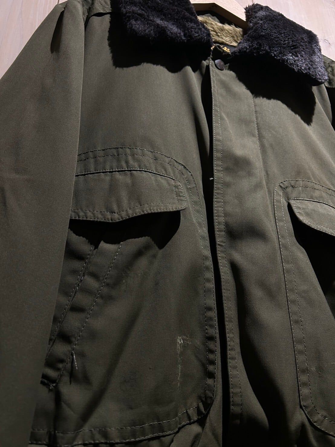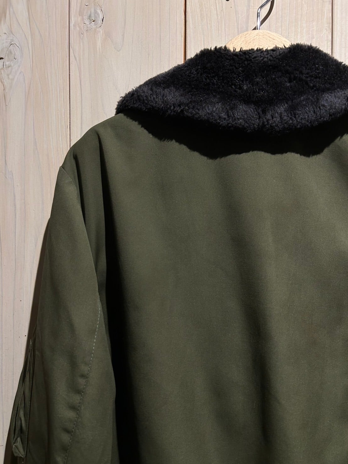 独特の鈍い光沢を帯びた、深い風合いを漂わせるミリタリーカーキのボディに、両サイドに配された大判なフラップポケット、比翼仕立てのフロント、袖口や裾に施されたリブなど、フライトジャケットのディテールを落とし込んだボアジャケット。