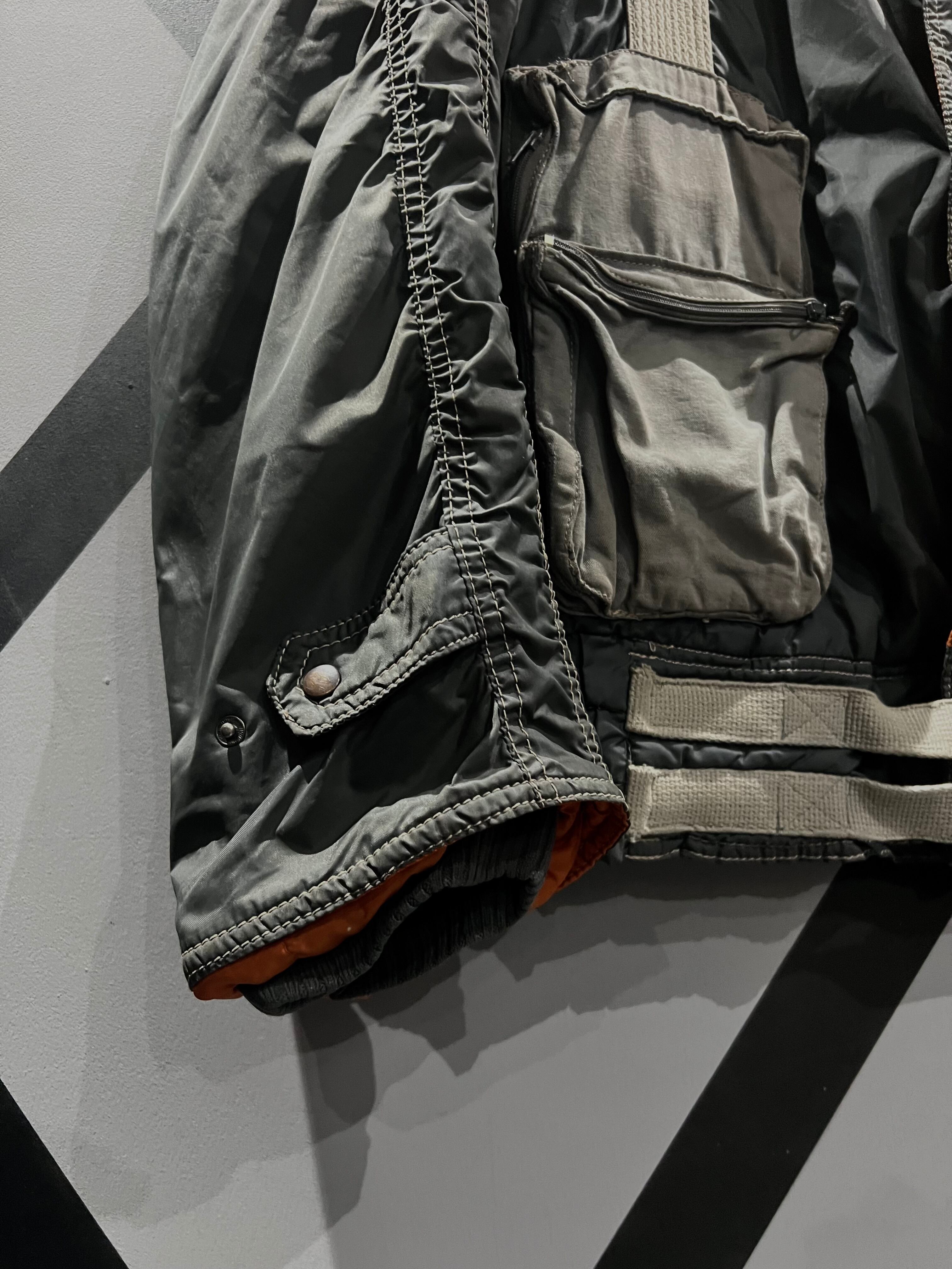 特有の光沢を持つグレーのナイロンボディに、トーンを変えたグレーのコットン素材で胸ポケット、両サイドのジップポケットを施したジャケット。