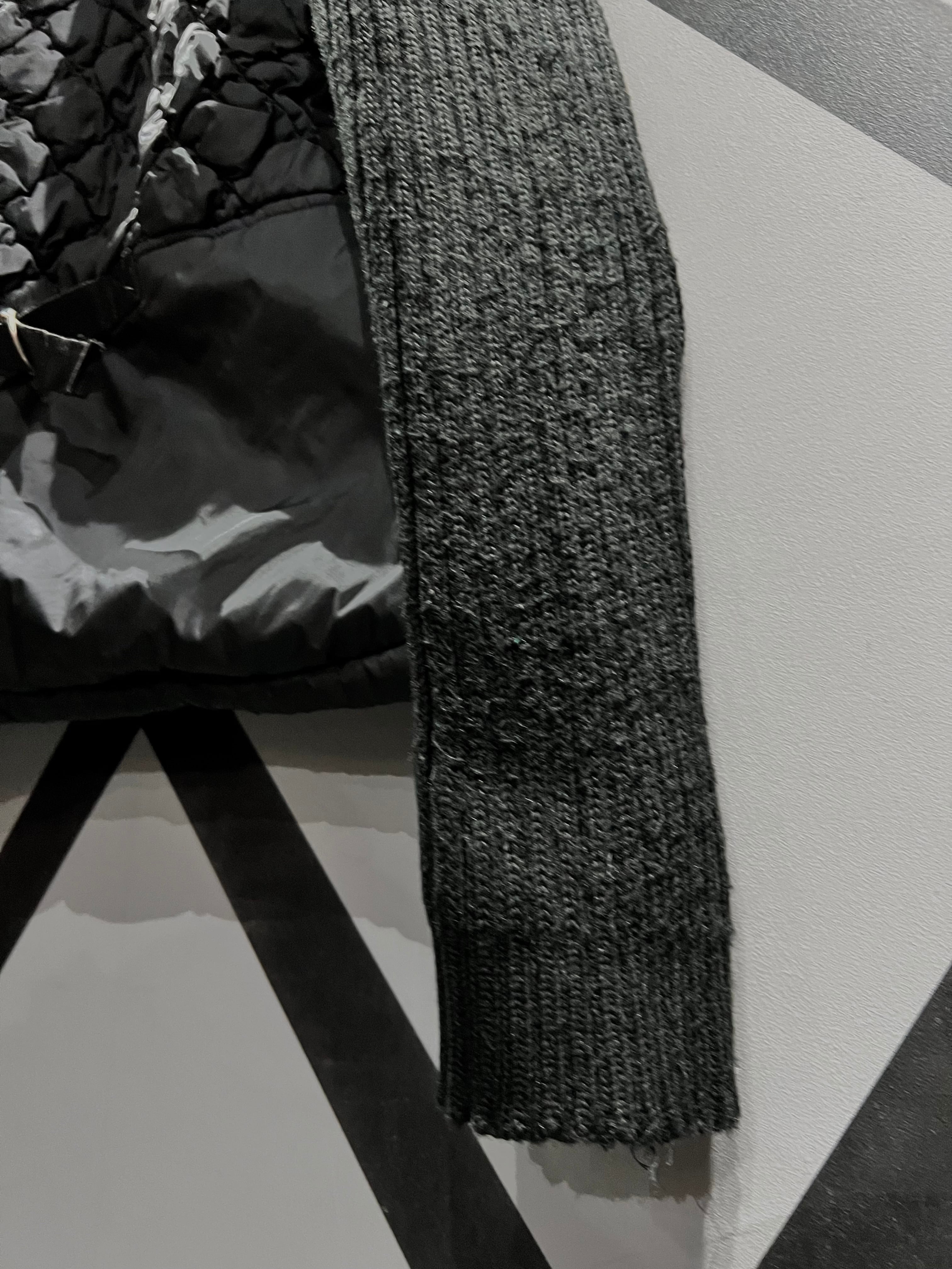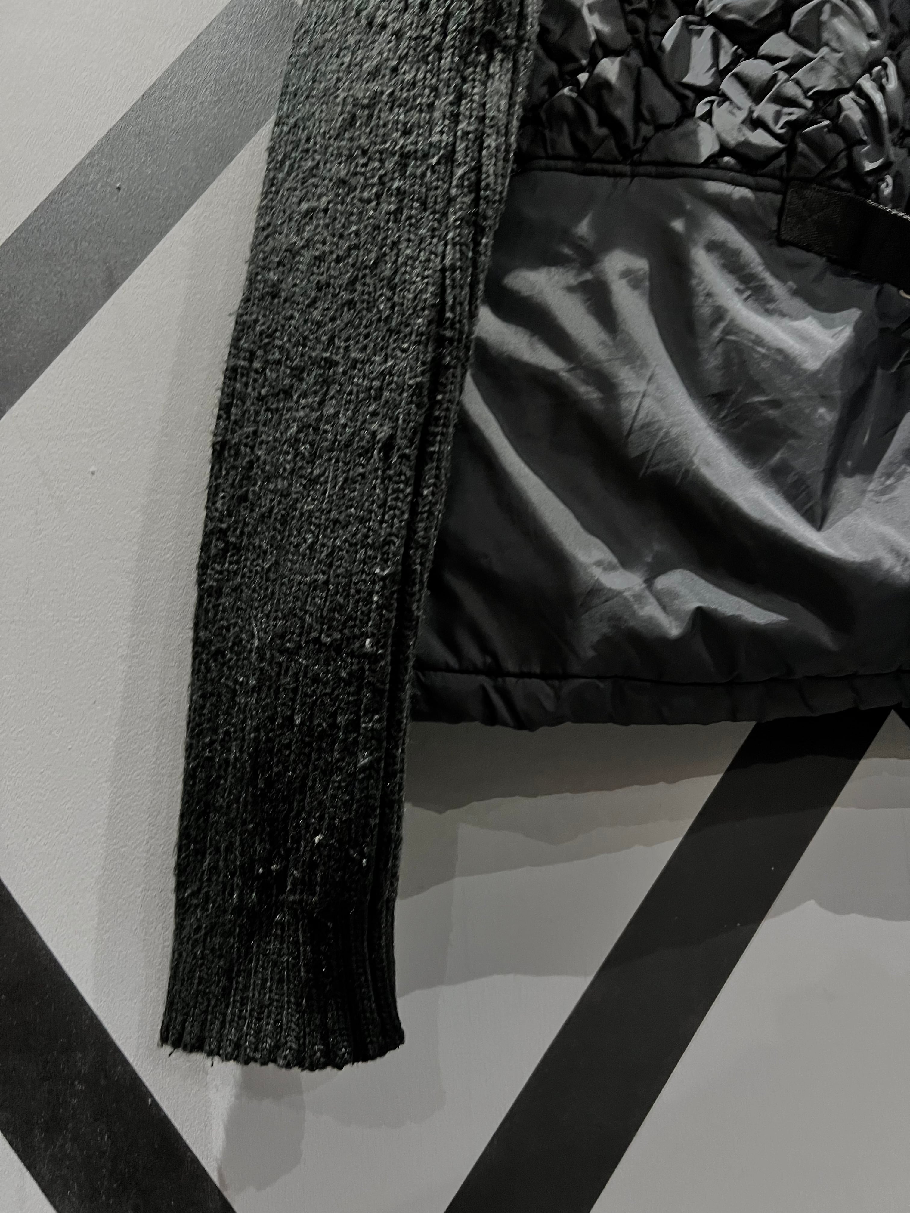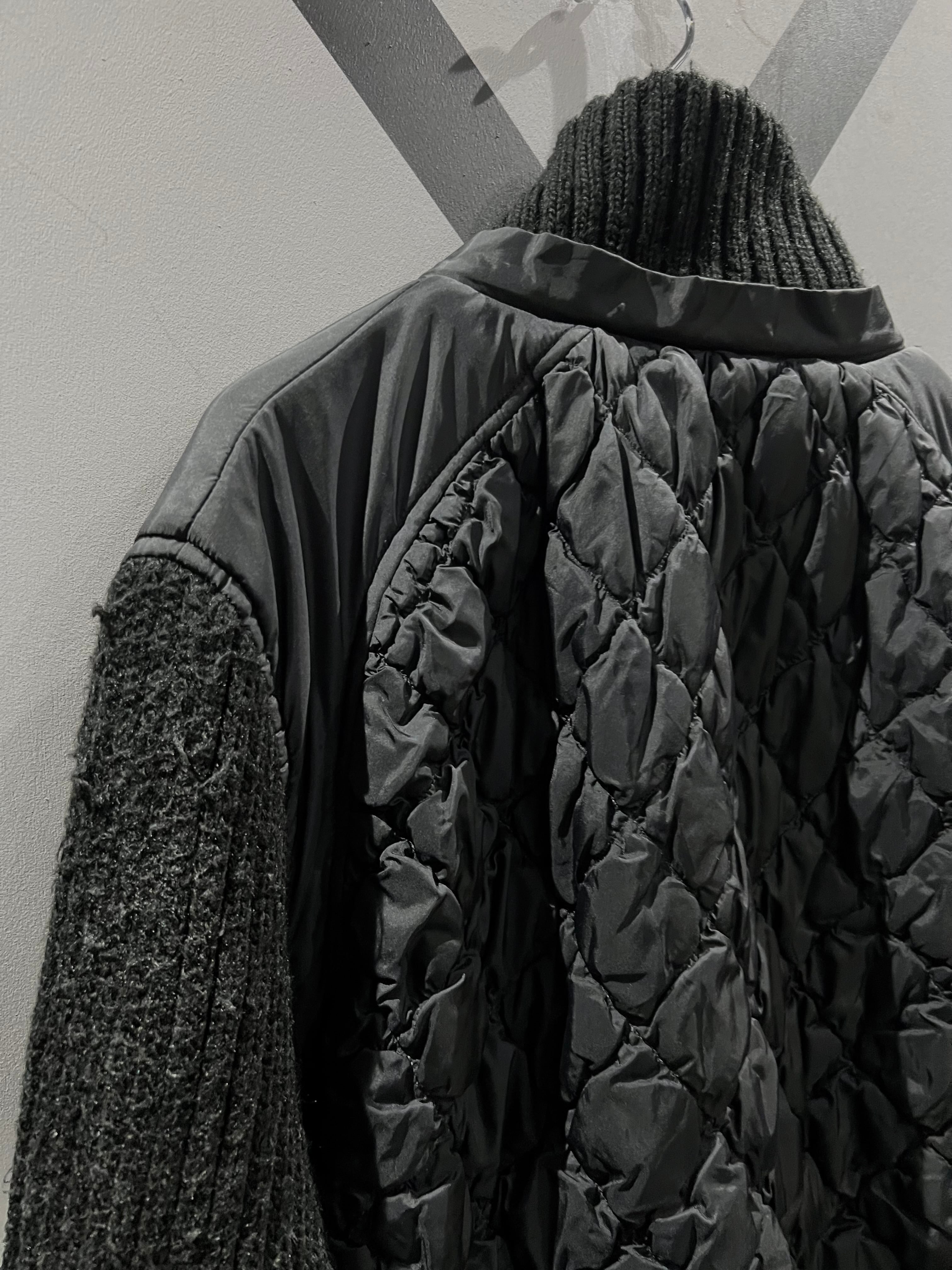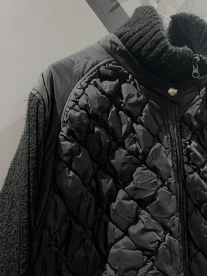 ブラックのナイロン素材のキルティングを身頃に配し、アーム、襟に肉感のあるブラックのニットを切り替えたドライバーズニット。