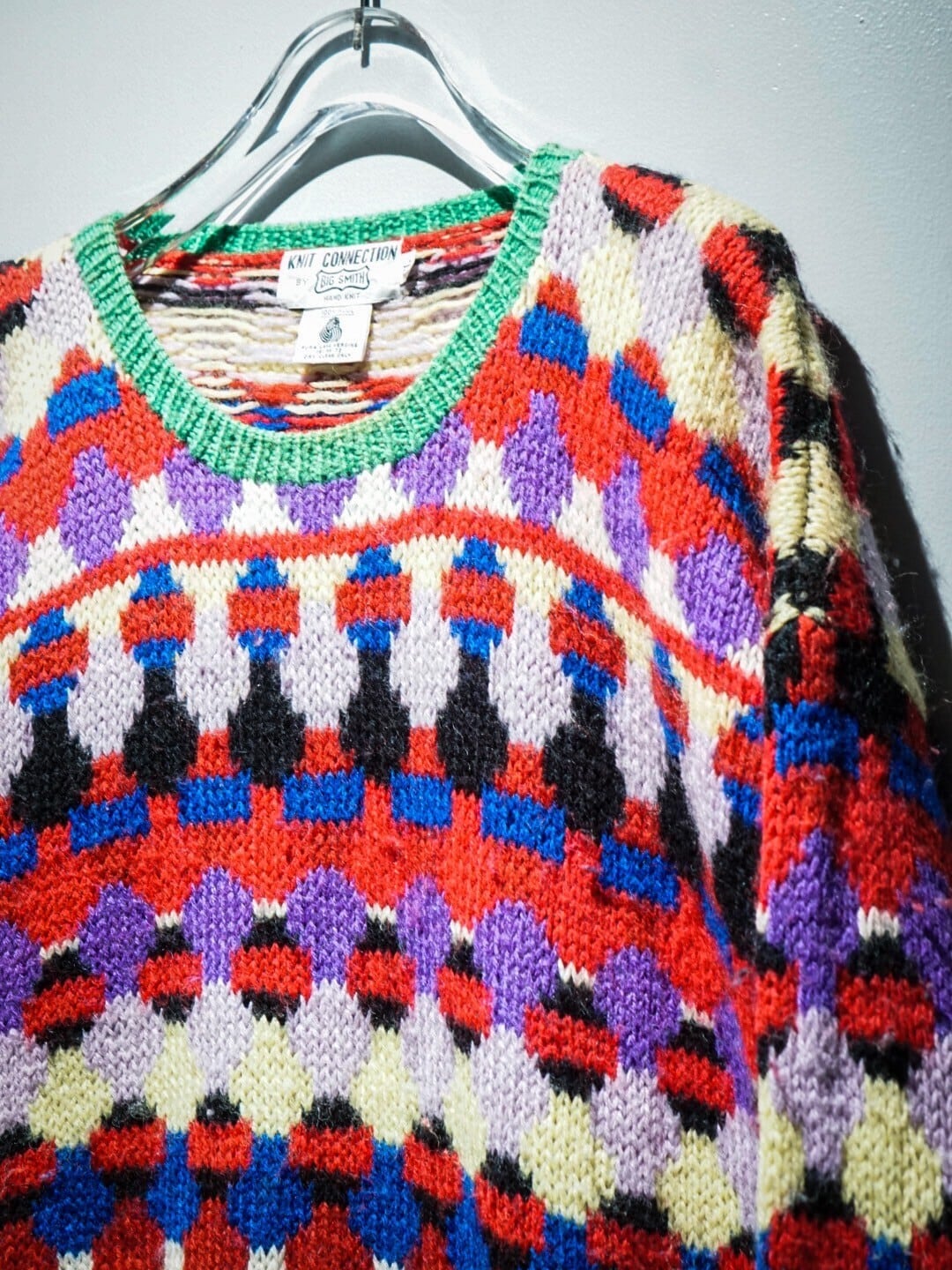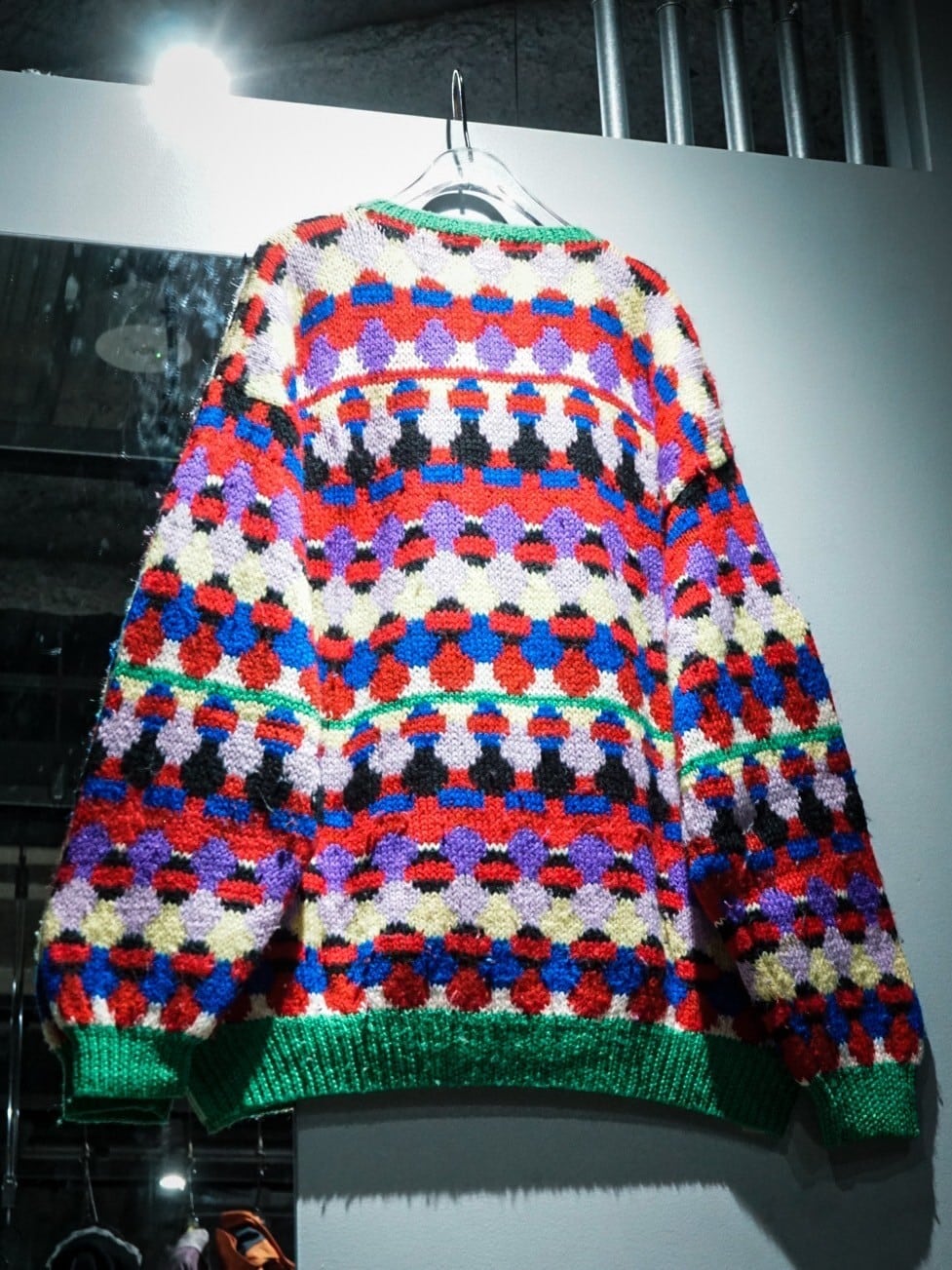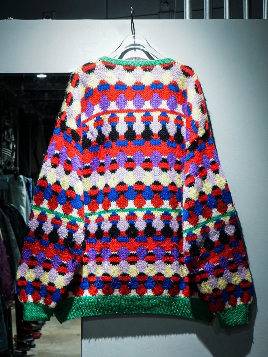 鮮やかなマルチなカラーリングで、全面に柄を配したプルオーバーニット。非常に鮮やかで目を惹きますよね。