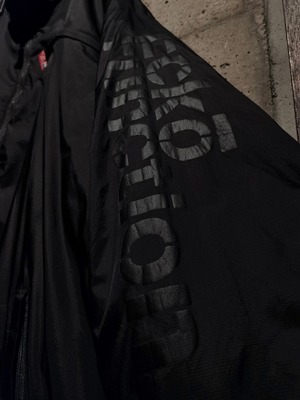 片面はグレーと赤のフリース素材を切り替え、胸には刺繍によってブランドネームを、背面にはラバーのブランドワッペンを施したフリースジャケット。ガバッと裏返すとブラックのナイロンボディに、左胸にはジップポケット、袖にブランドネームをプリントし、背面には片面同様のラバーワッペンを施した、両面デザイン性に富んだジャケット。