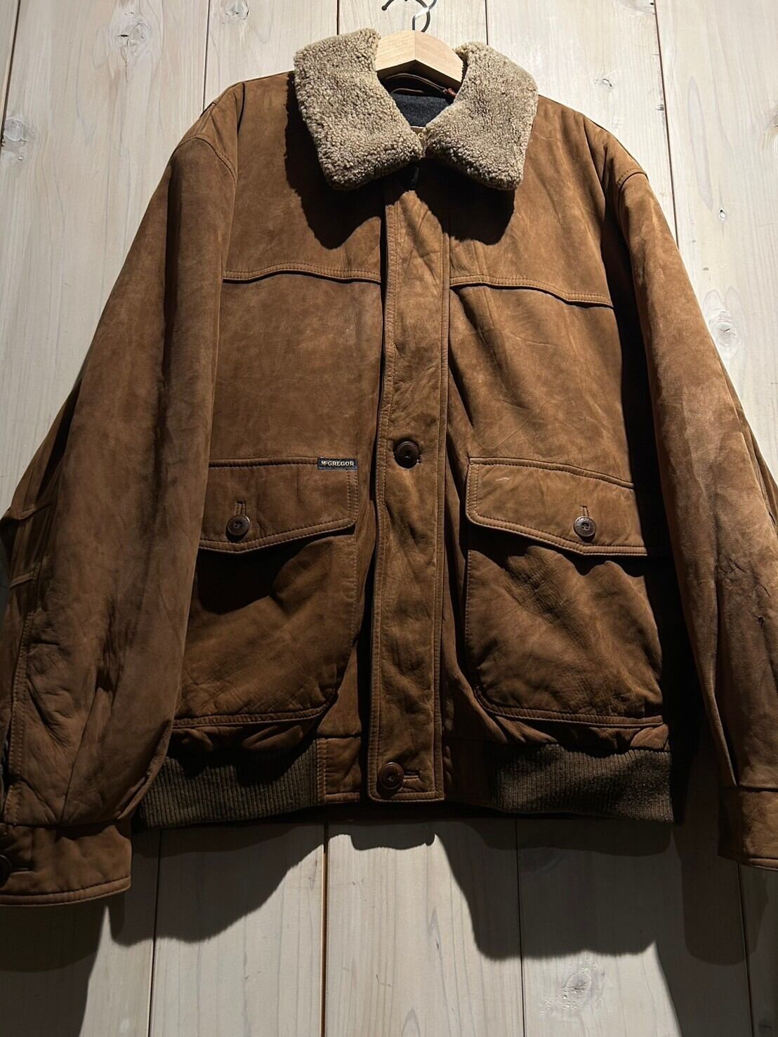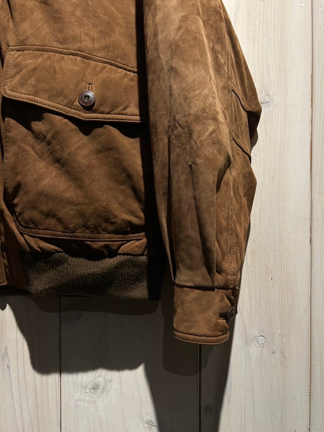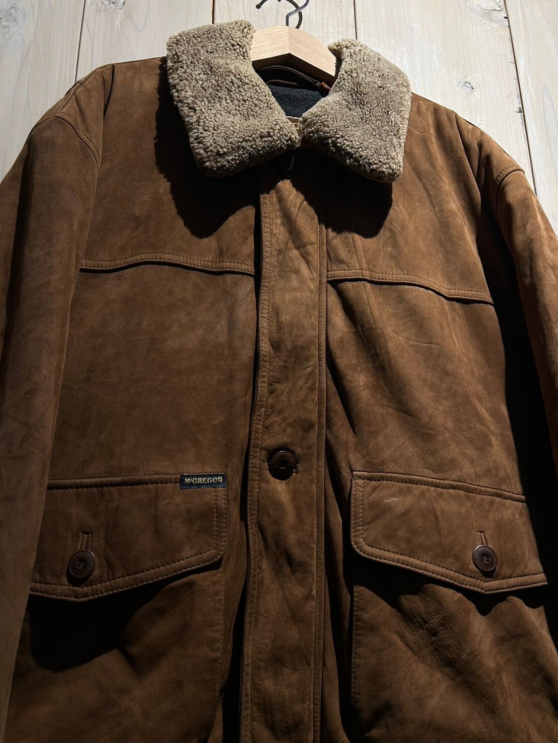 上質なブラウンのスエードレザーを用いて、襟にはボアを切り替え、大きめのフラップポケットを配した、洗練されたデザインに仕上げられた1着。