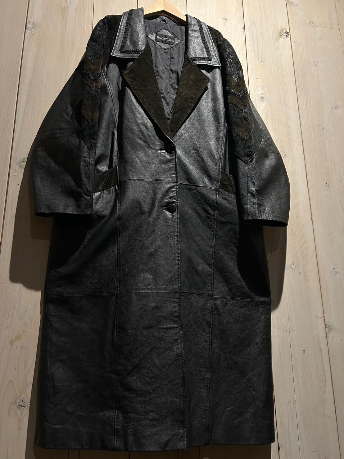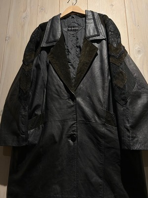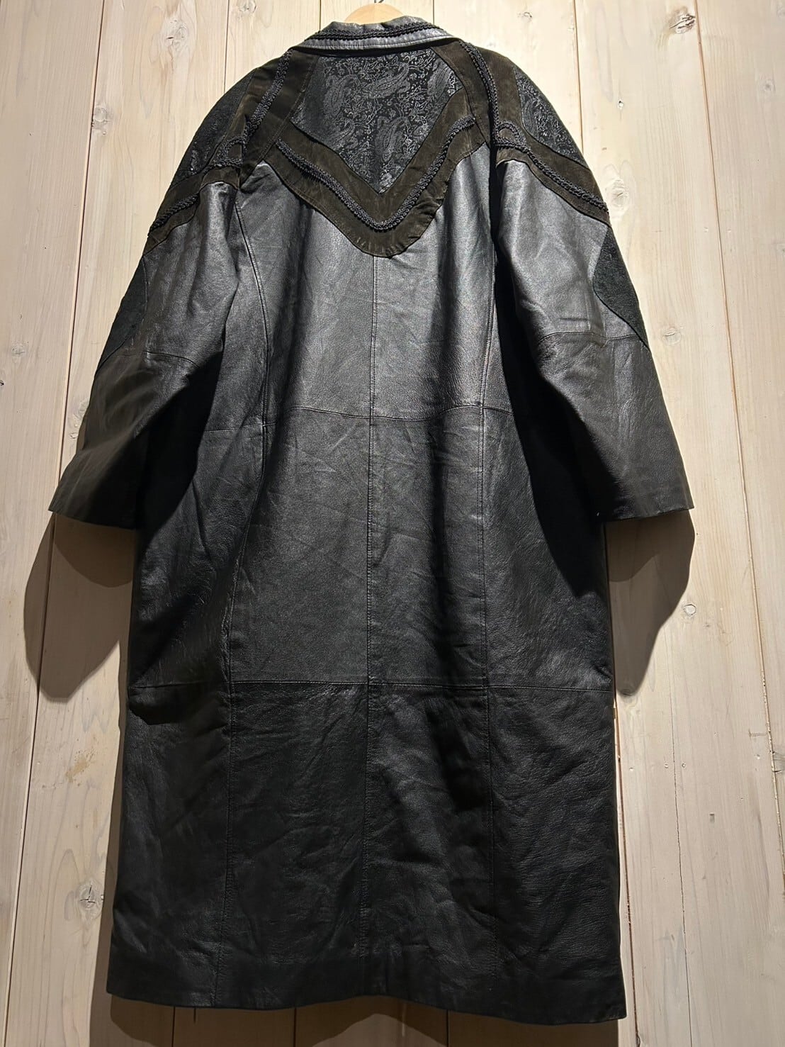 上質なブラックスムースレザーに、異種のスエードレザー切り替えをあしらい、その上からペイズリー柄を載せたレザーコート。