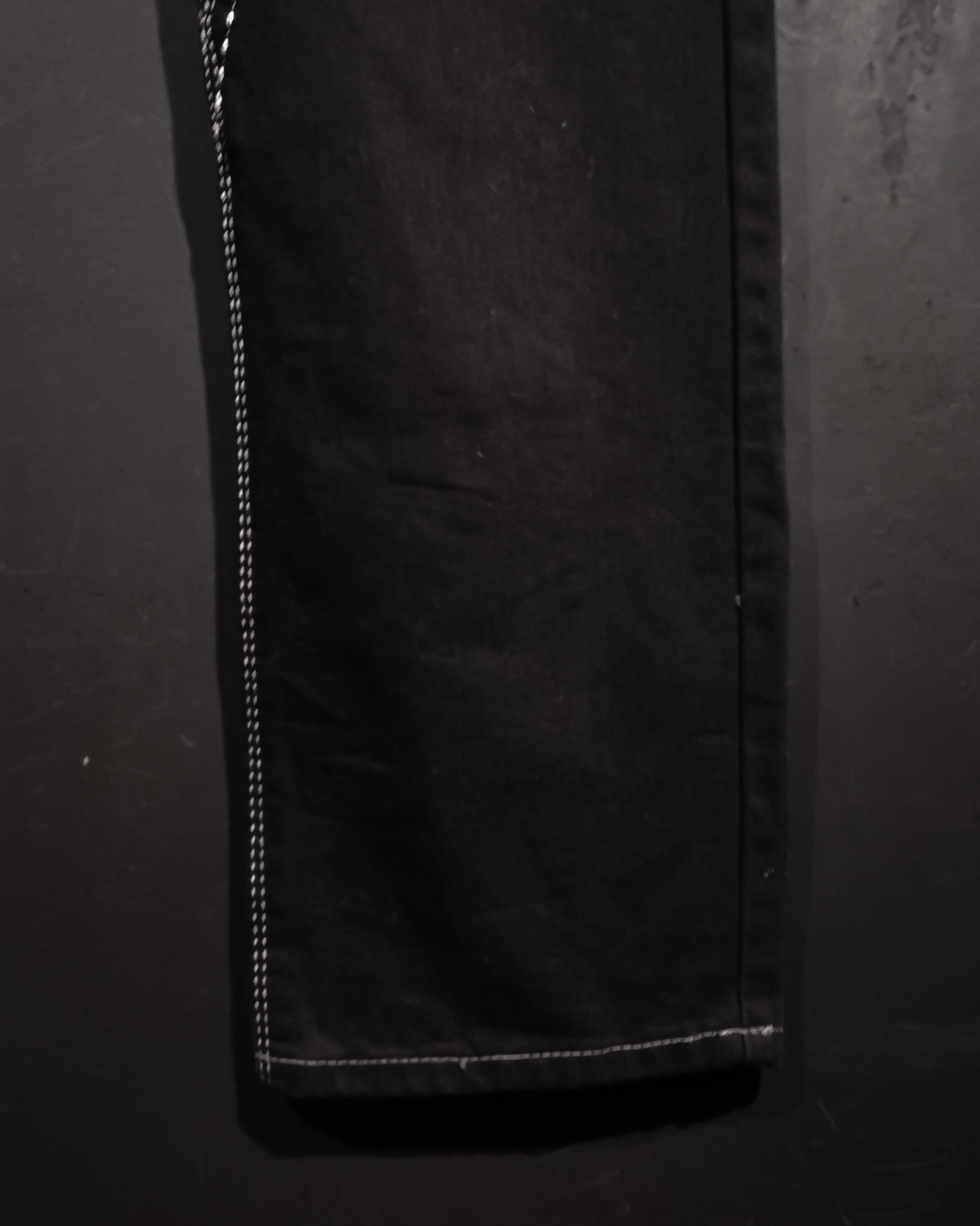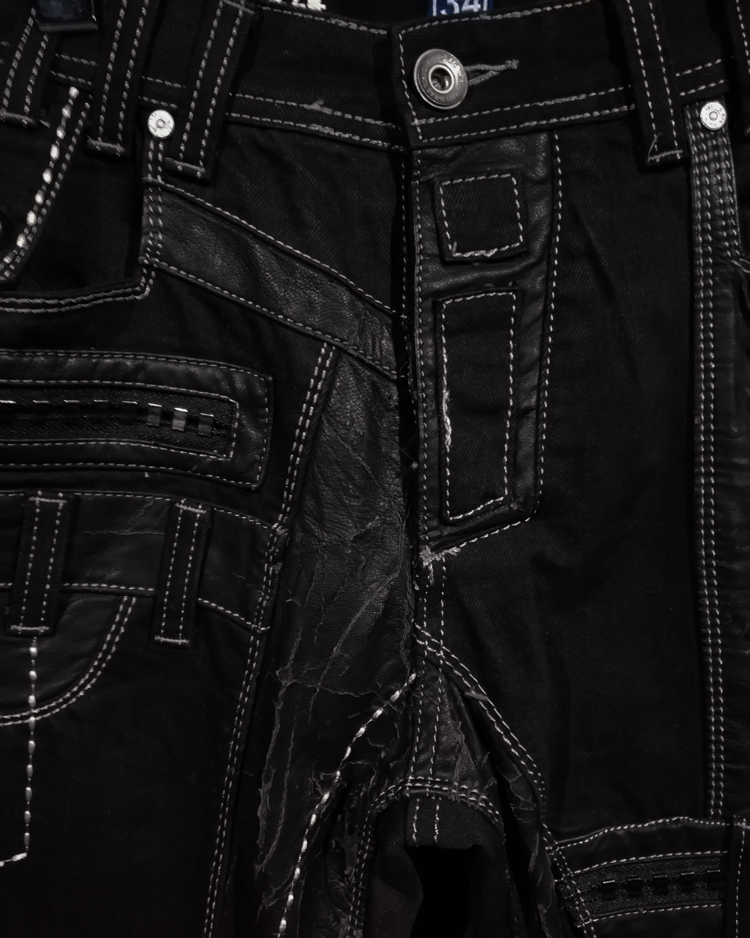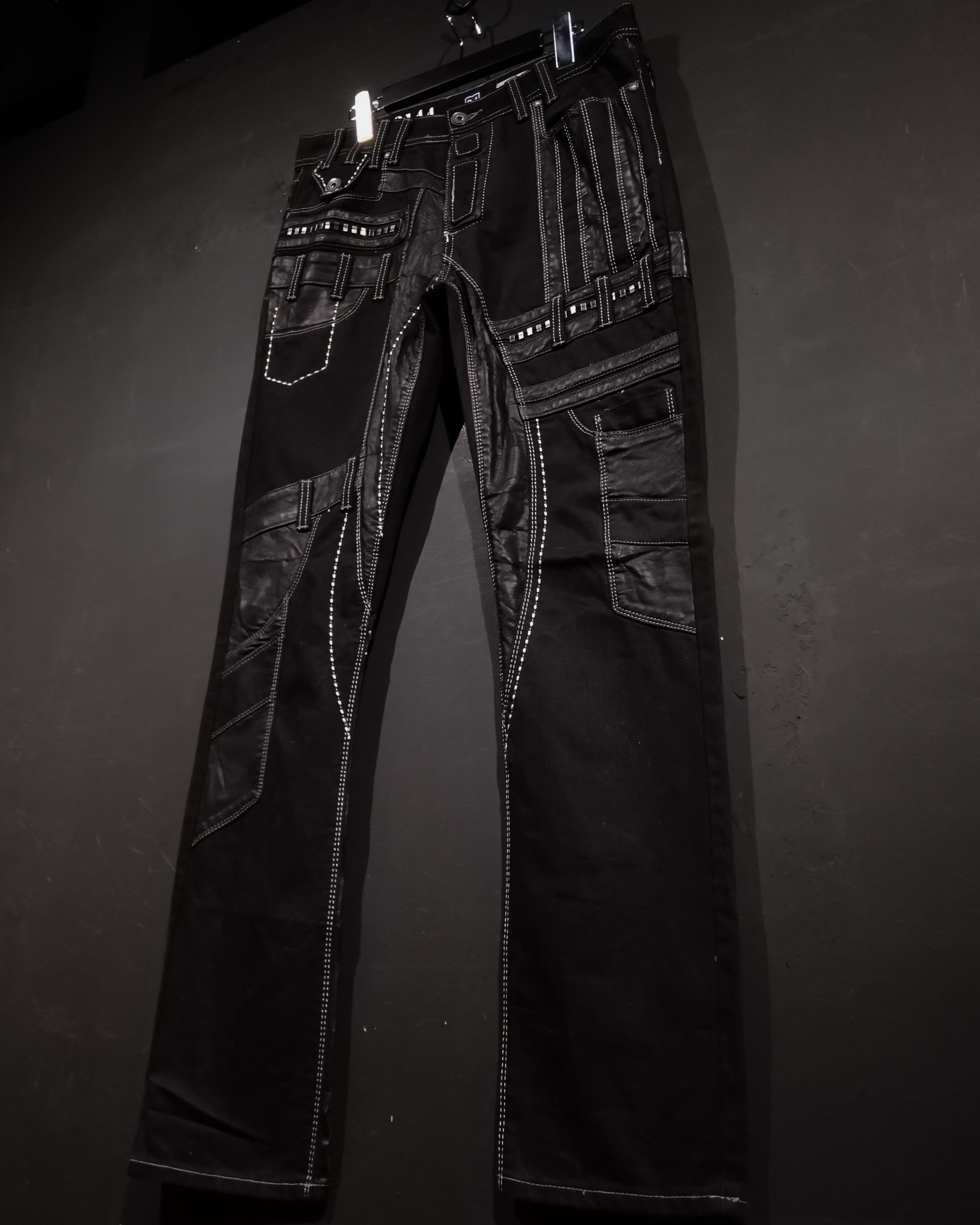 ブラックのデニムボディをベースに、随所にフェイクレザーによる様々な切り替えやスタッズデザインを施した1本。