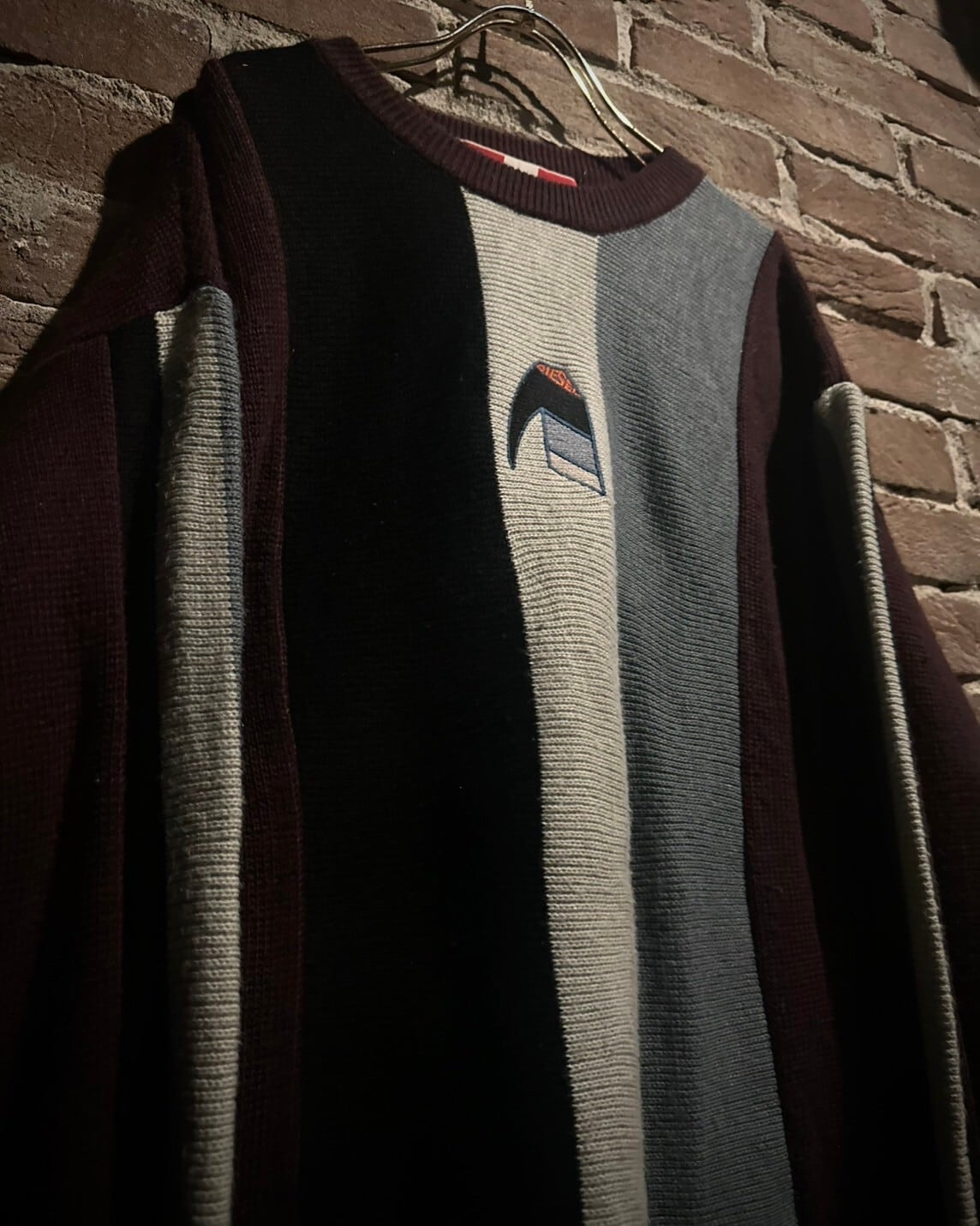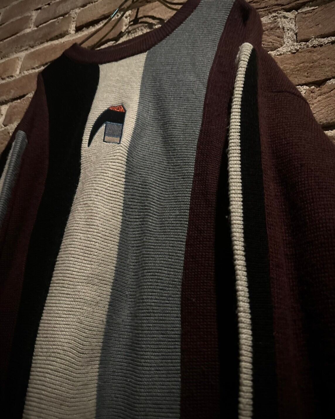 ボルドー、グレー、白のどこかレトロさが感じられるカラーリングでストライプが載せられたニット。