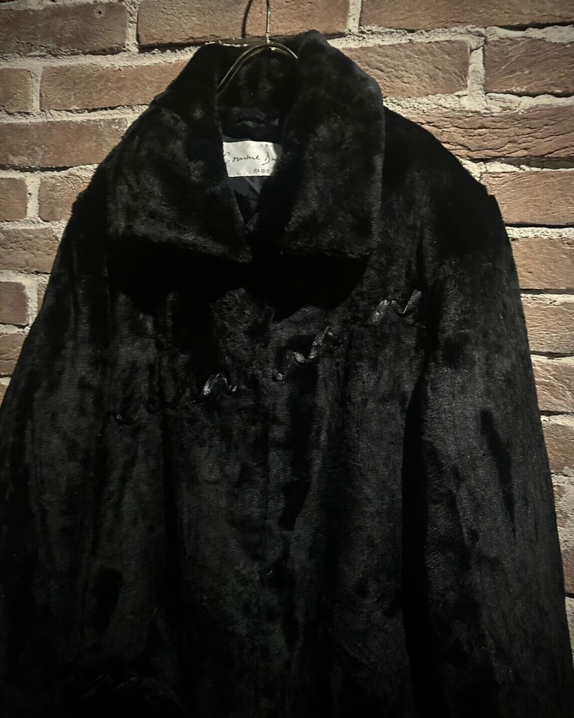 上品な艶が非常に美しいフェイクファーを用いたボディに、フェイクレザーでラインのデザインを載せたフレンチヴィンテージのファーコート。