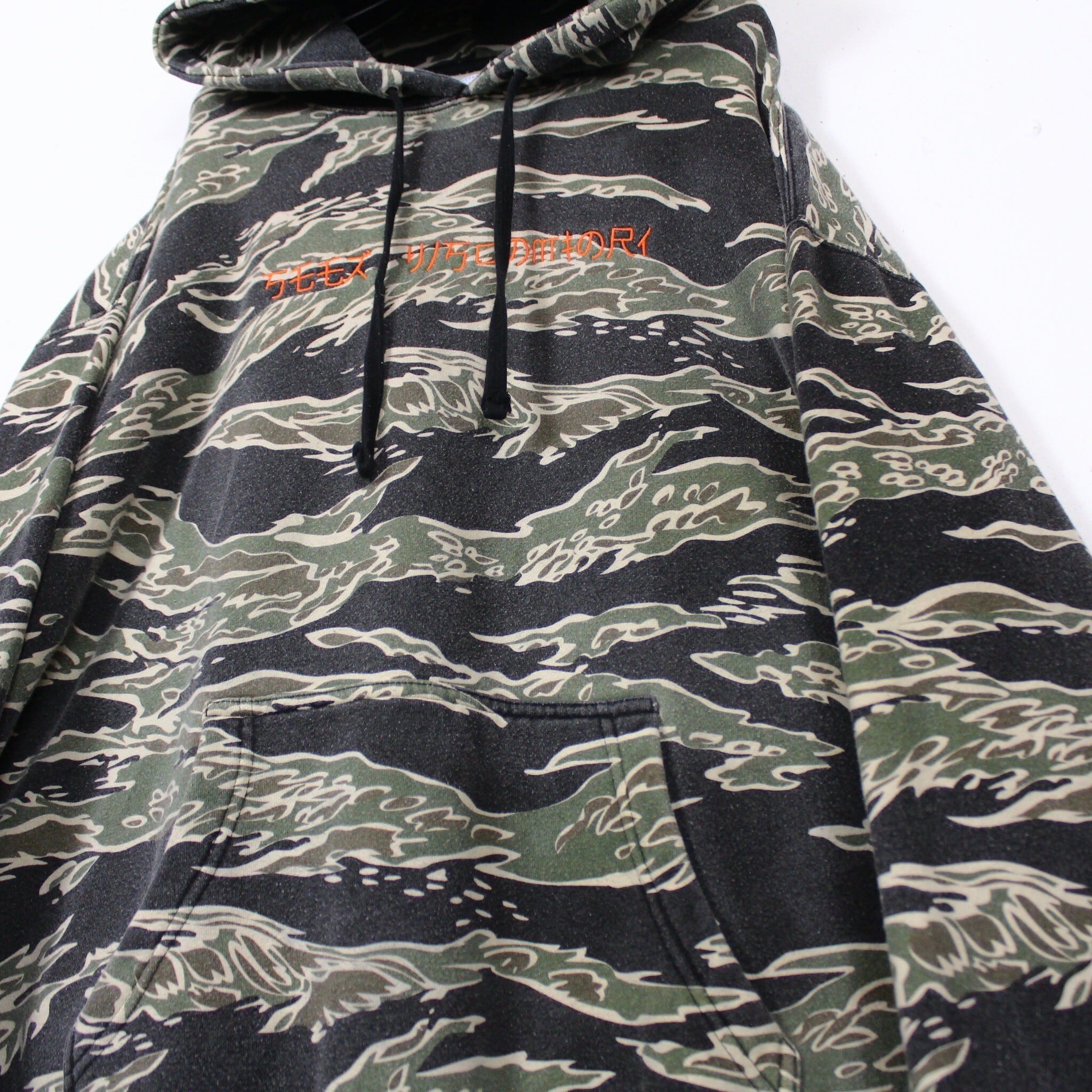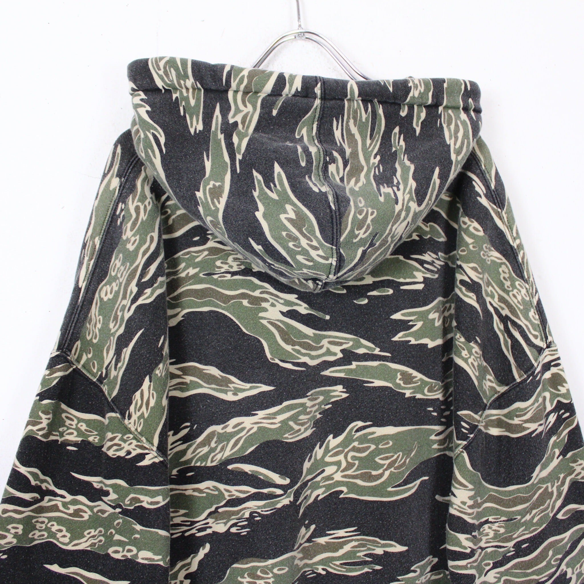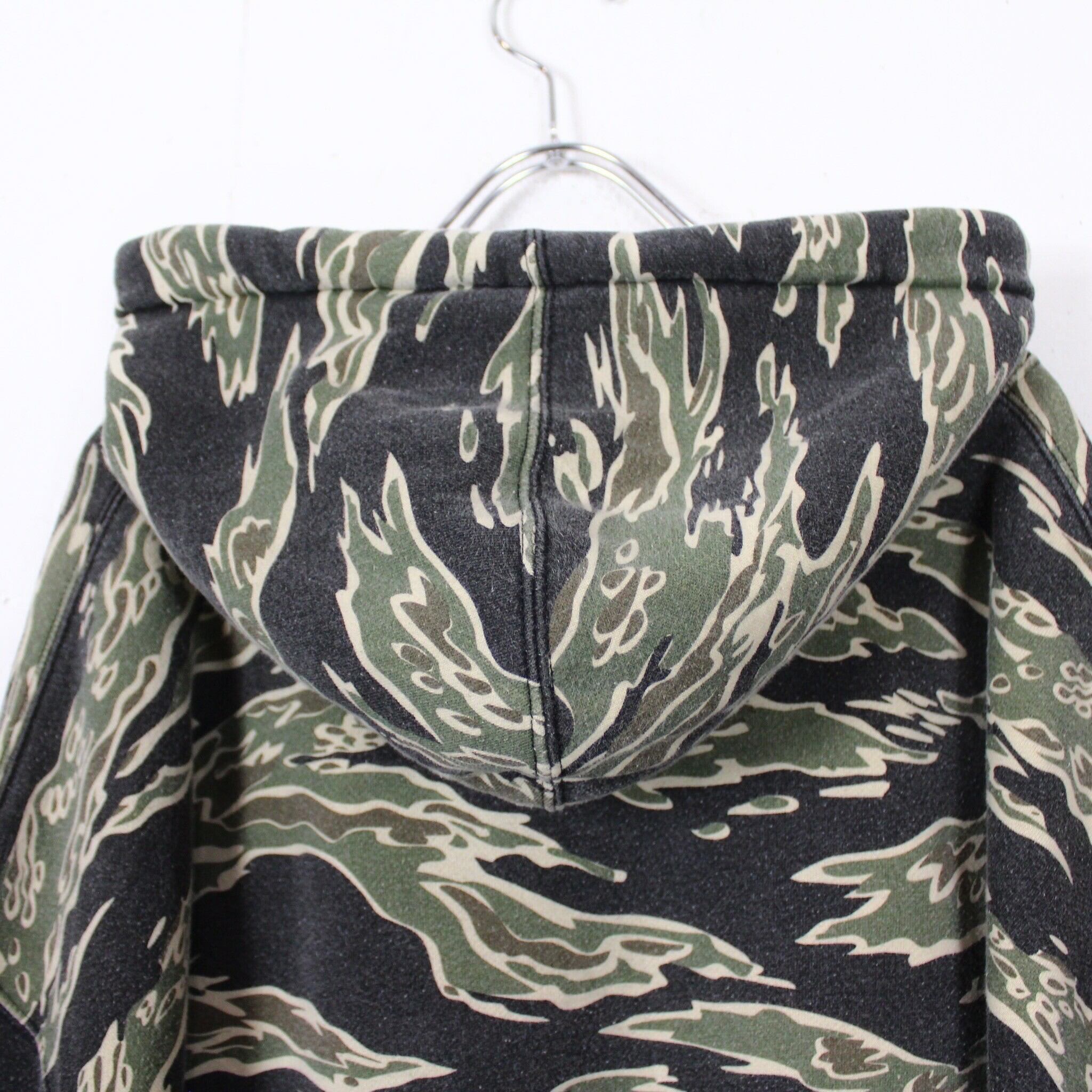 アメリカ軍で使用されていた、ヘビのようにうねった野性的なパターンが特徴的なタイガーストライプ柄を全面に配したスウェットフーディー。