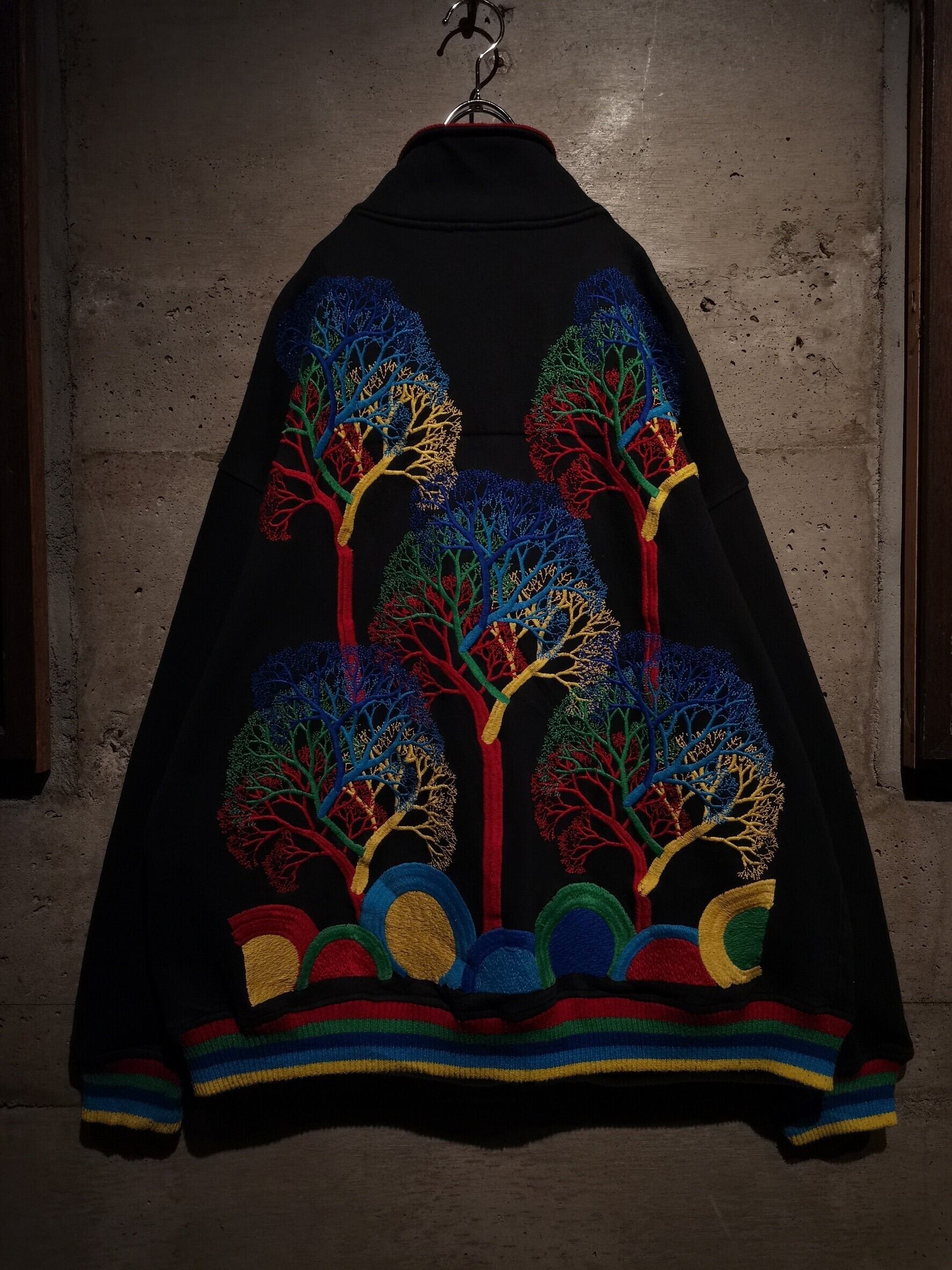 ブラックのコットン素材をベースに、背面にパキッとしたマルチカラーで木々の刺繍デザインを施した、ストリートブランドらしいデザインらしいサイケデリックなカラーリングが 目を惹くトラックジャケット。
