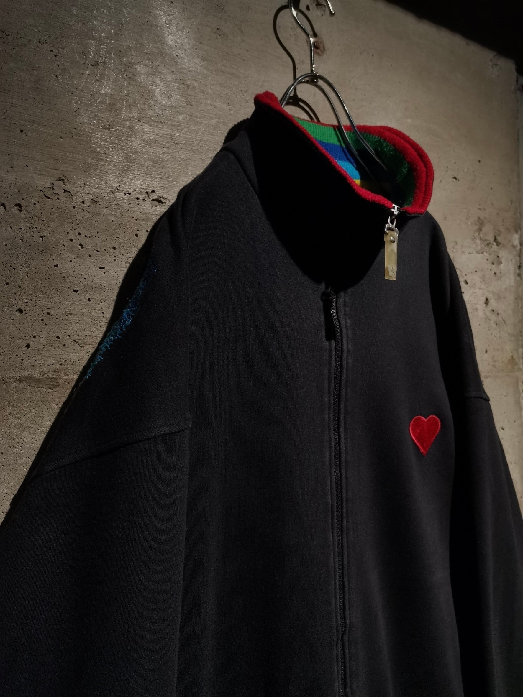 左胸にはハートの刺繍パッチ、袖口や裾のリブ、襟の内側には上記同カラーのラインが配された細部までデザイン性に溢れた1着に仕上がっています。
