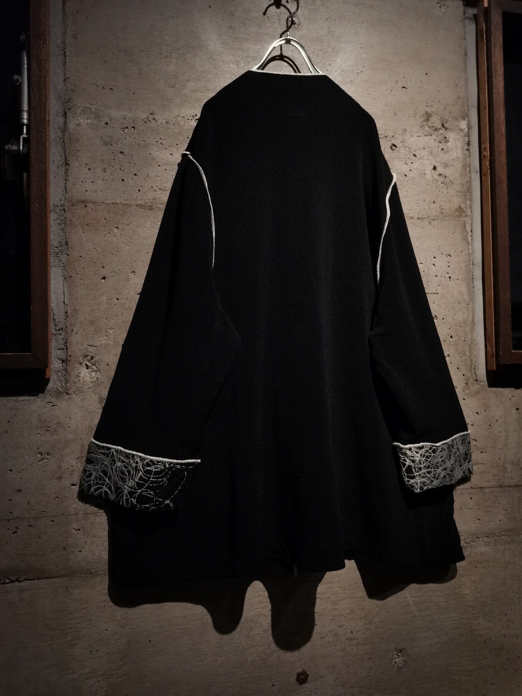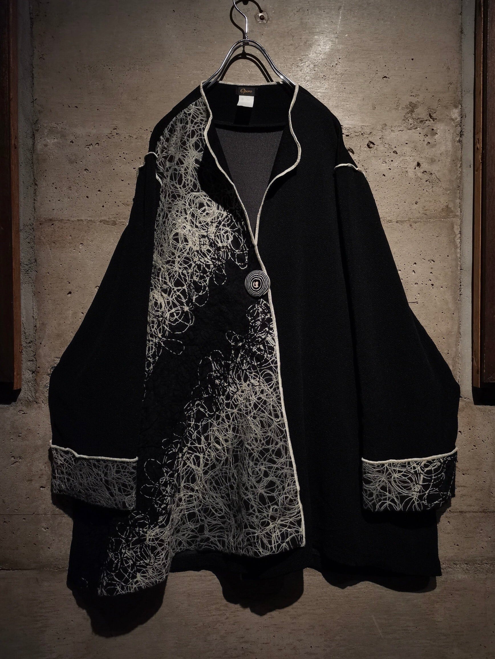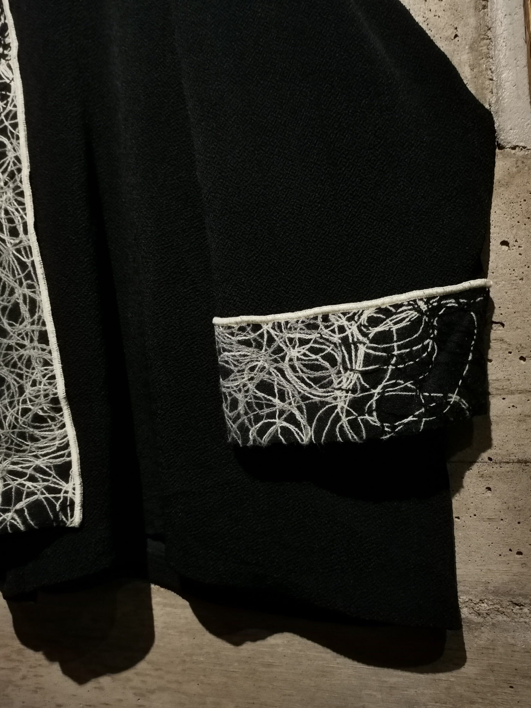 薄手のブラックのボディをベースに、白、黒、グレーのモノトーンの毛糸で不規則なラインのデザインを載せた稀有なデザインを載せたジャケット。