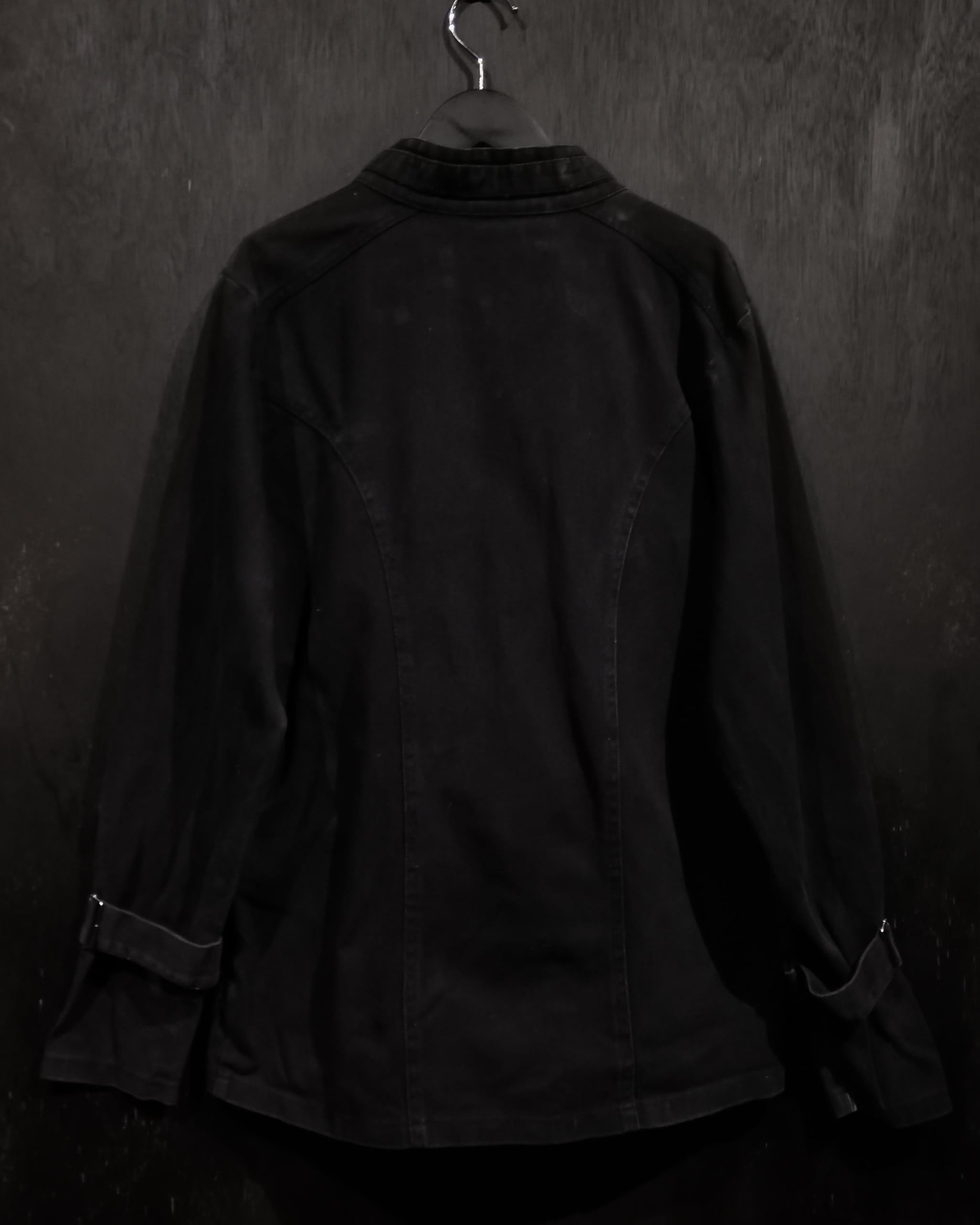 ハリ、コシのあるブラックのボディに、フロントにはボンテージをインソースにしたであろうベルトのギミックを載せたジャケット。