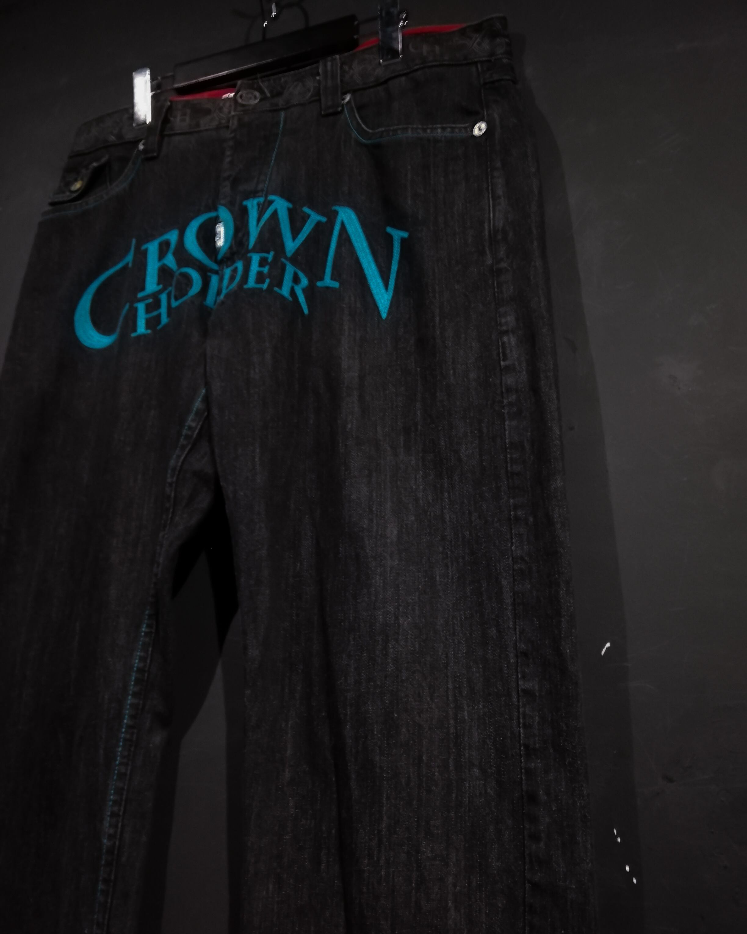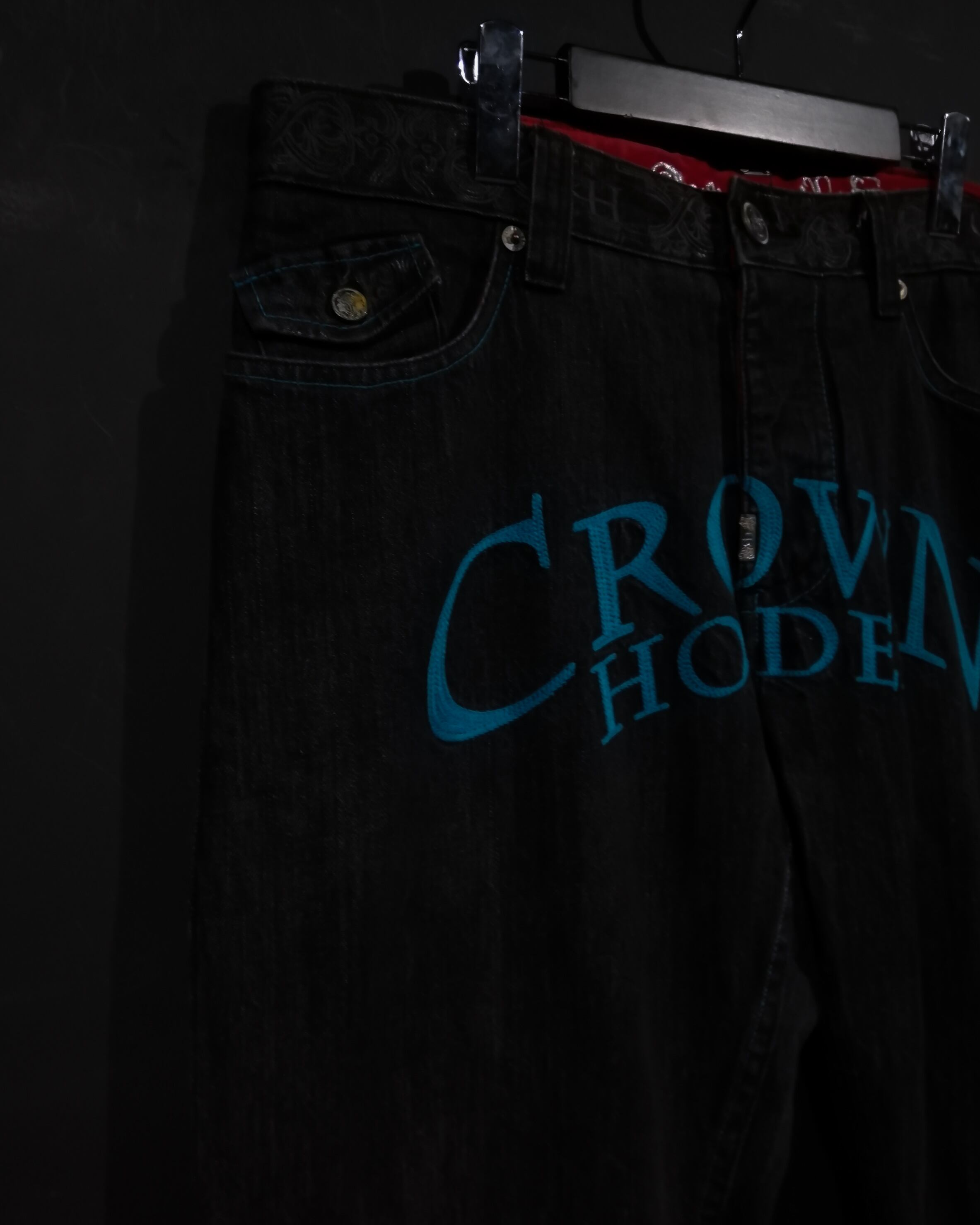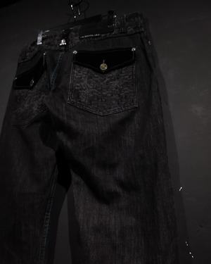 古着業界では稀少なブラックデニムのボディに、フロントにはブランドネームのパッチを載せ、ウエスト周りやポケットにゴシックな柄模様をプリントしたバギーデニムパンツ。