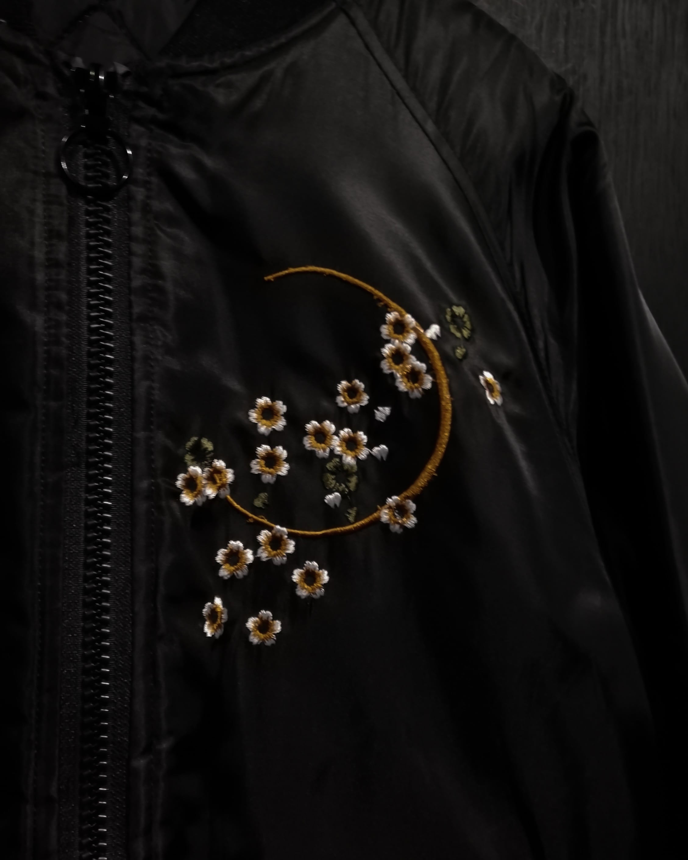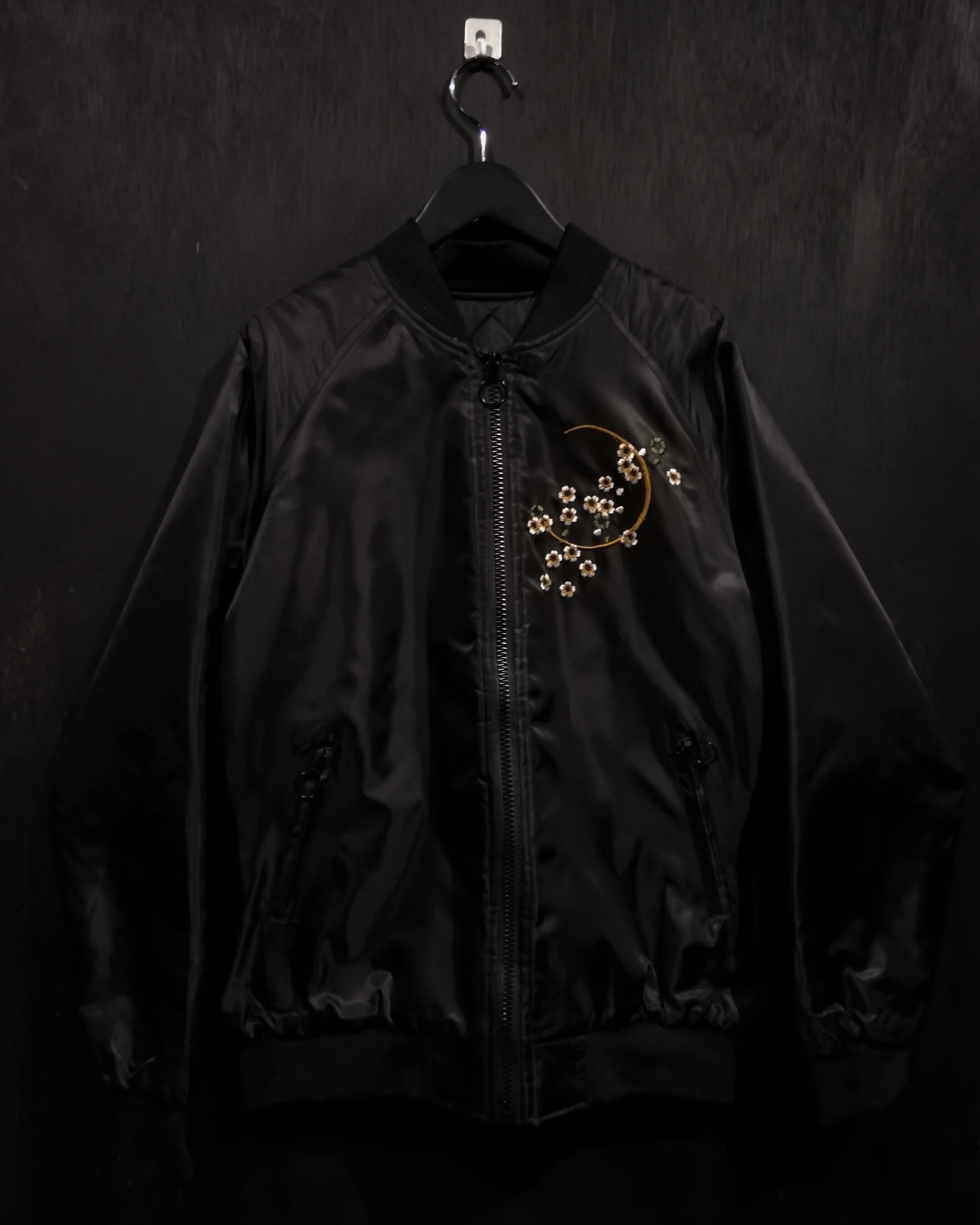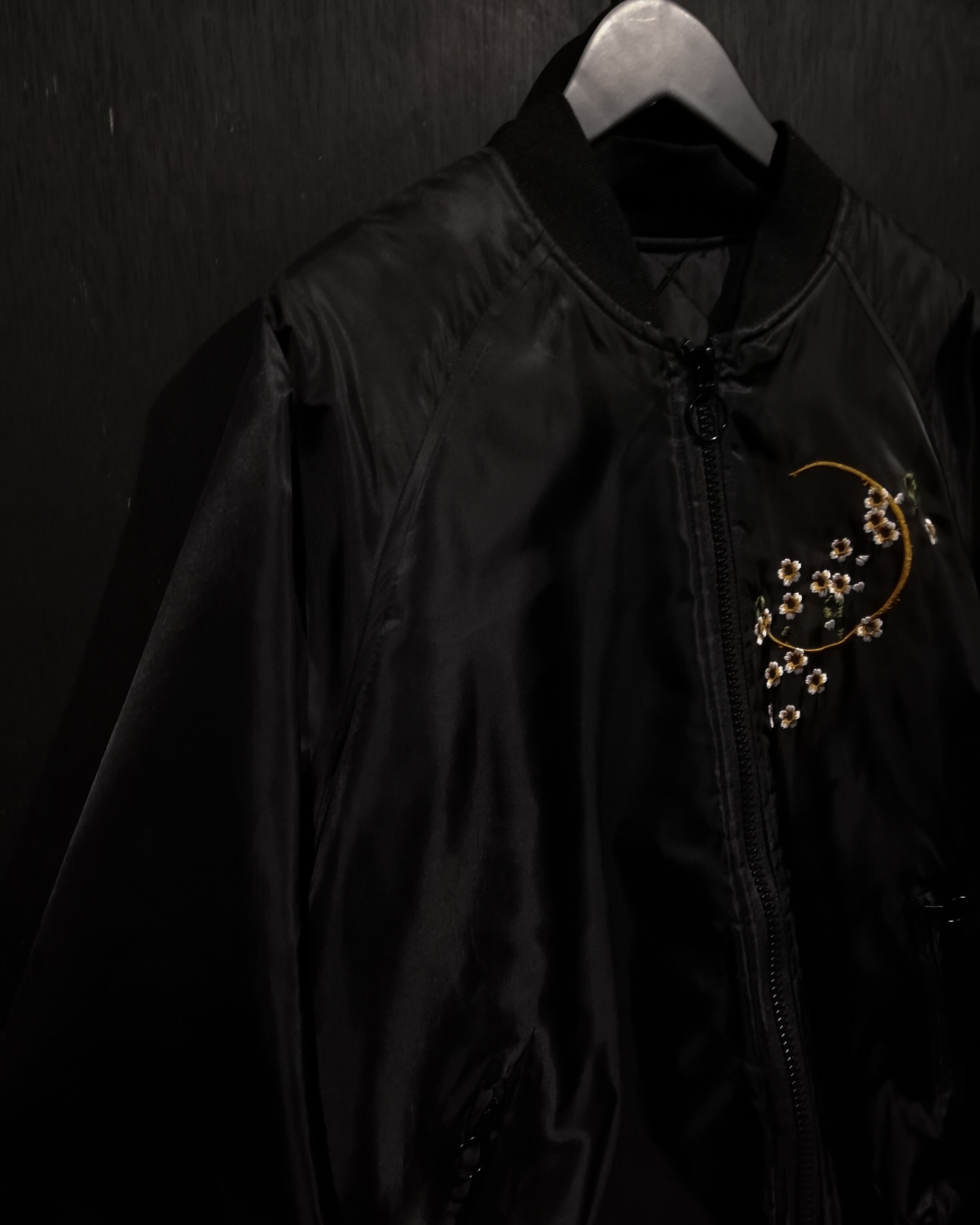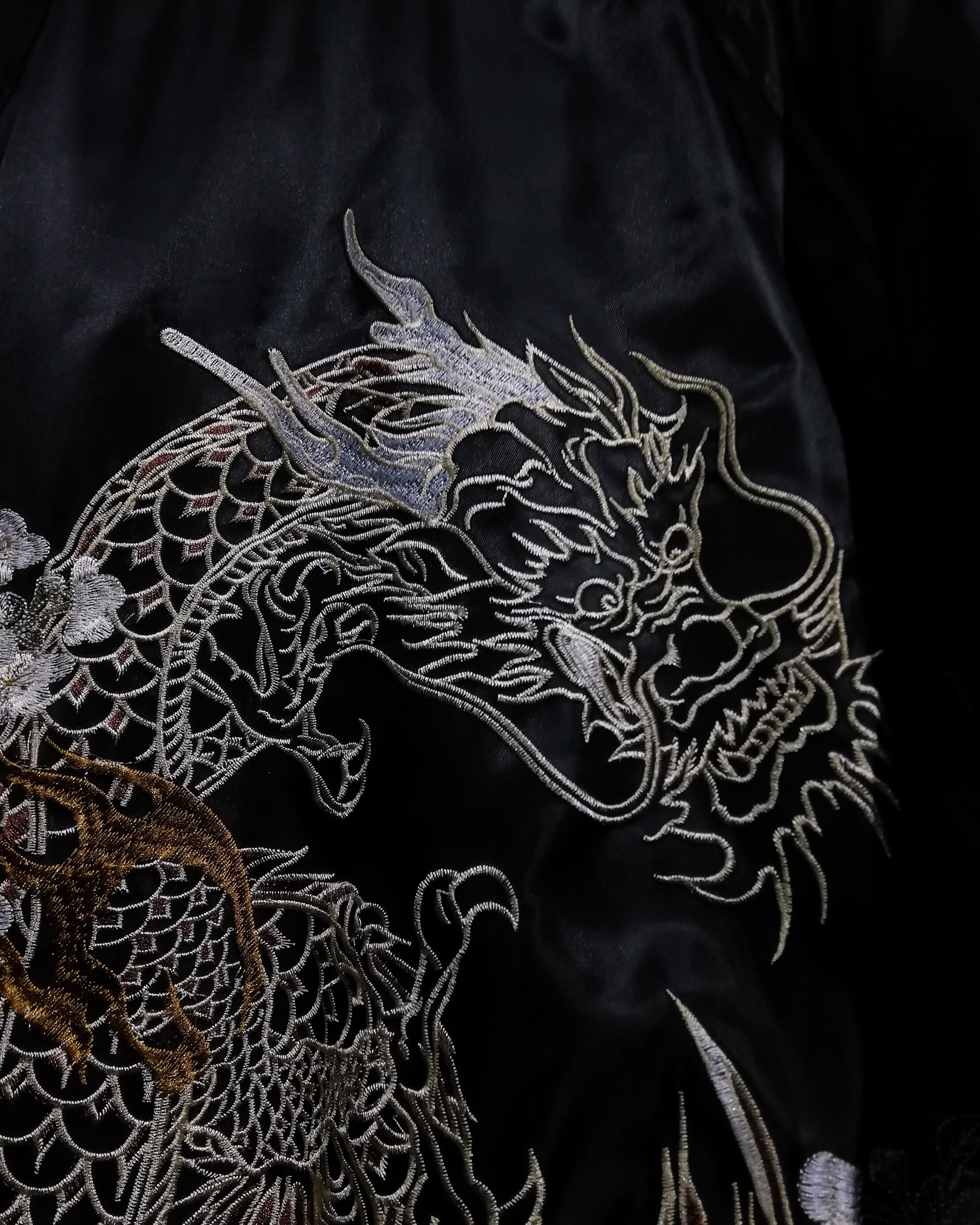 ツルッと滑らかな質感の黒×金の王道のカラーリングに、迫力のある龍を胸元とアームに刺繍で刻んだスカジャン。