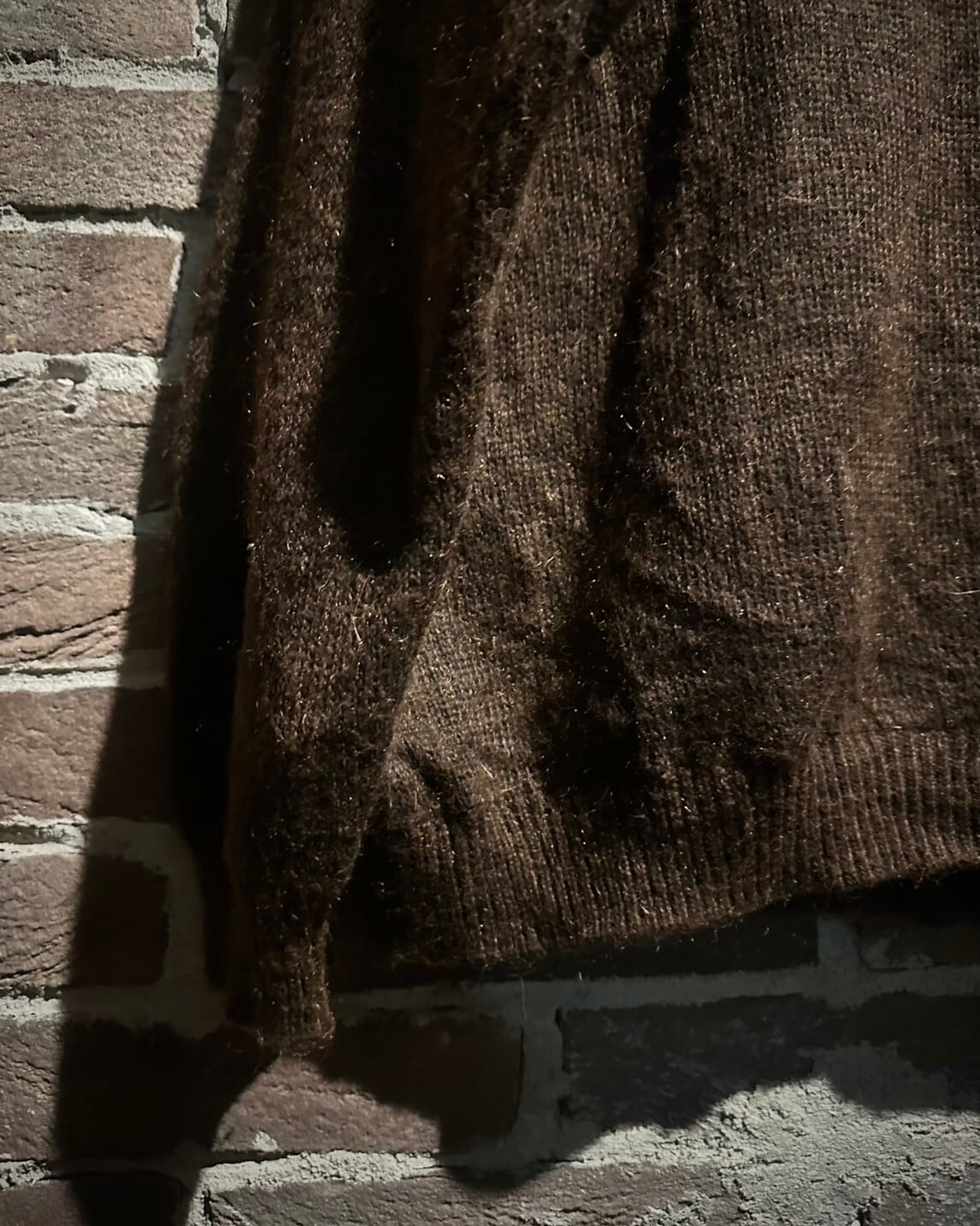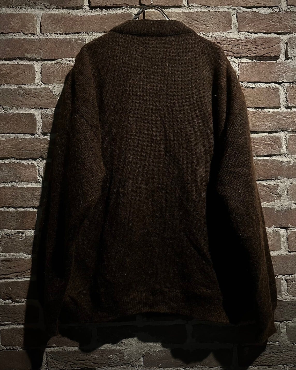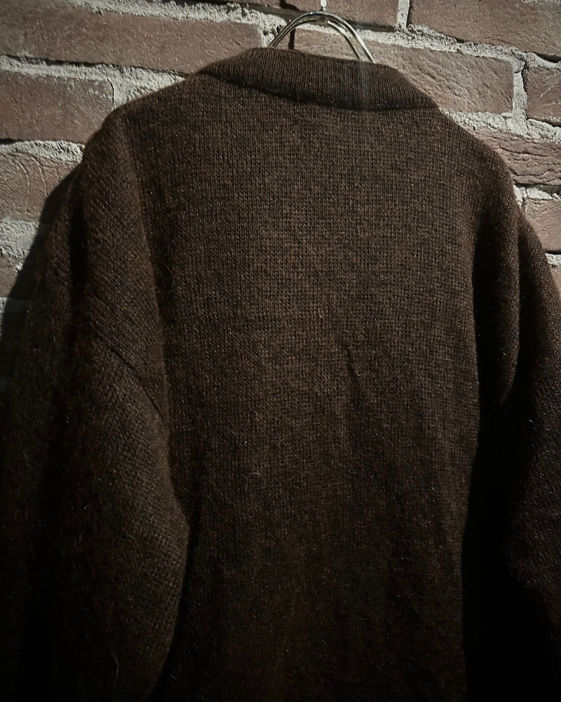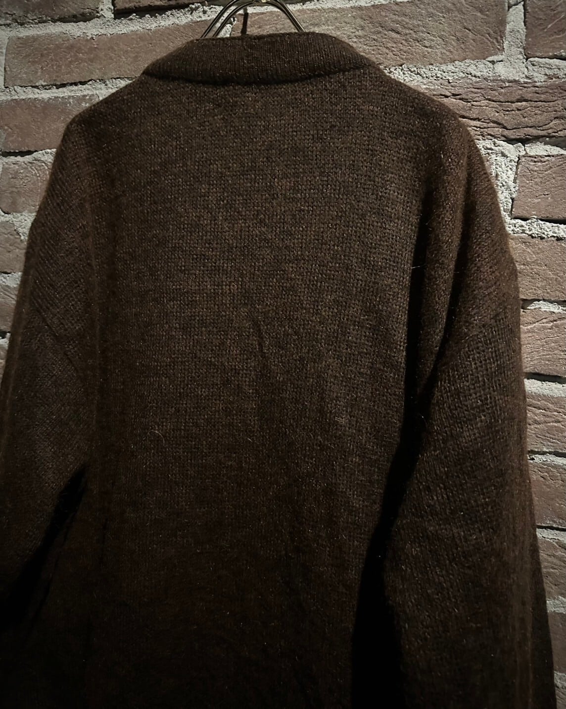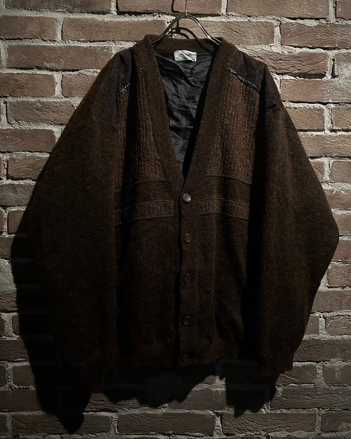 ブラウンの柔らかなニットのボディをベースに、肩周りにはスエードレザーを切り替え、さらにチェーンの装飾を施した当店らしいカーディガンジャケット。