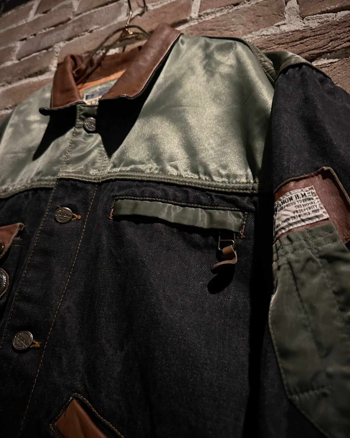 コシのある上質なブラックデニムをベースに、ヨークにはセージグリーンのナイロン、襟、ポケット口などにはレザーを切り替えた、正にこのブランドらしいデニムジャケット。