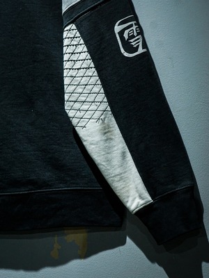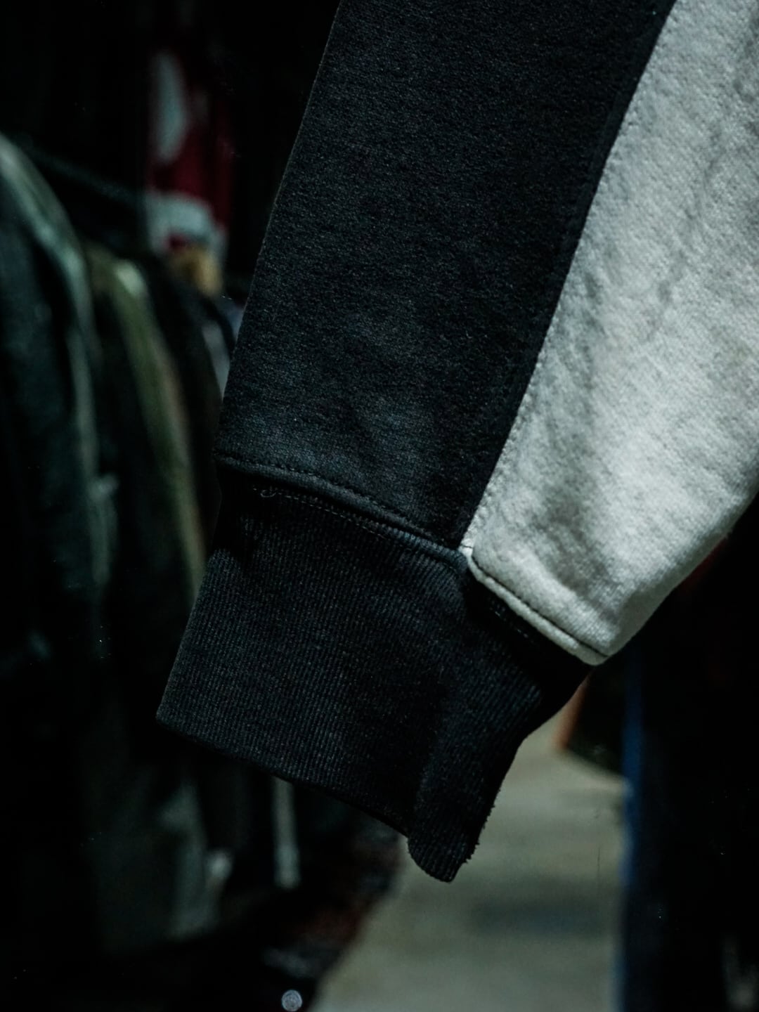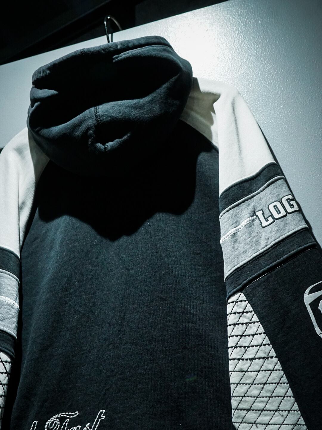 ブラックのボディをベースに、白、グレーを切り替え、フロントにブランドネームのワッペンを載せたジップアップフーディ。