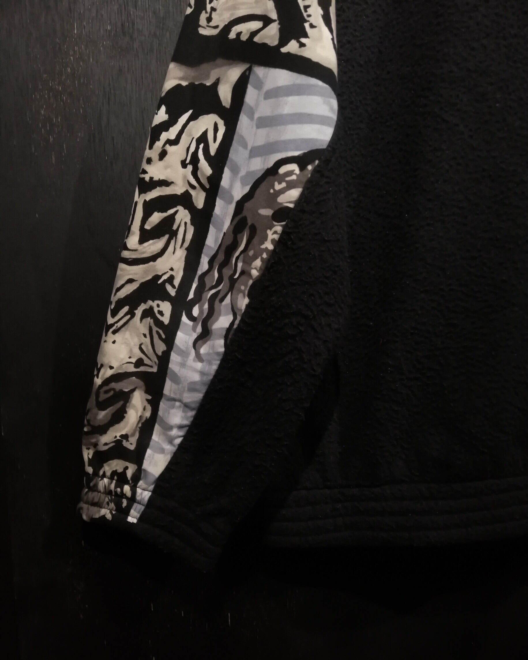 モフッと柔らかなブラックのボディに、かなり印象に残るアート柄を載せたハーフジップフリースプルオーバー。