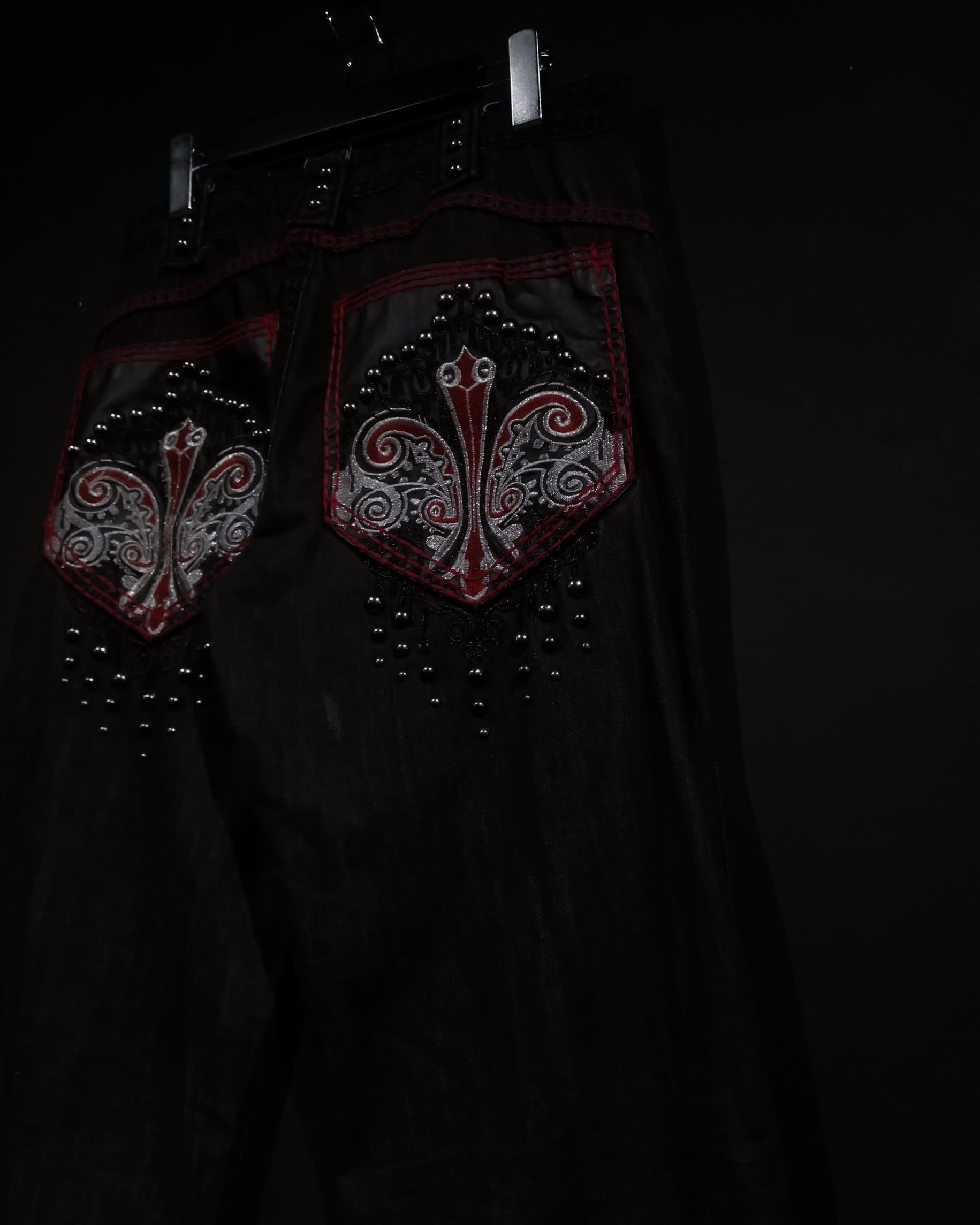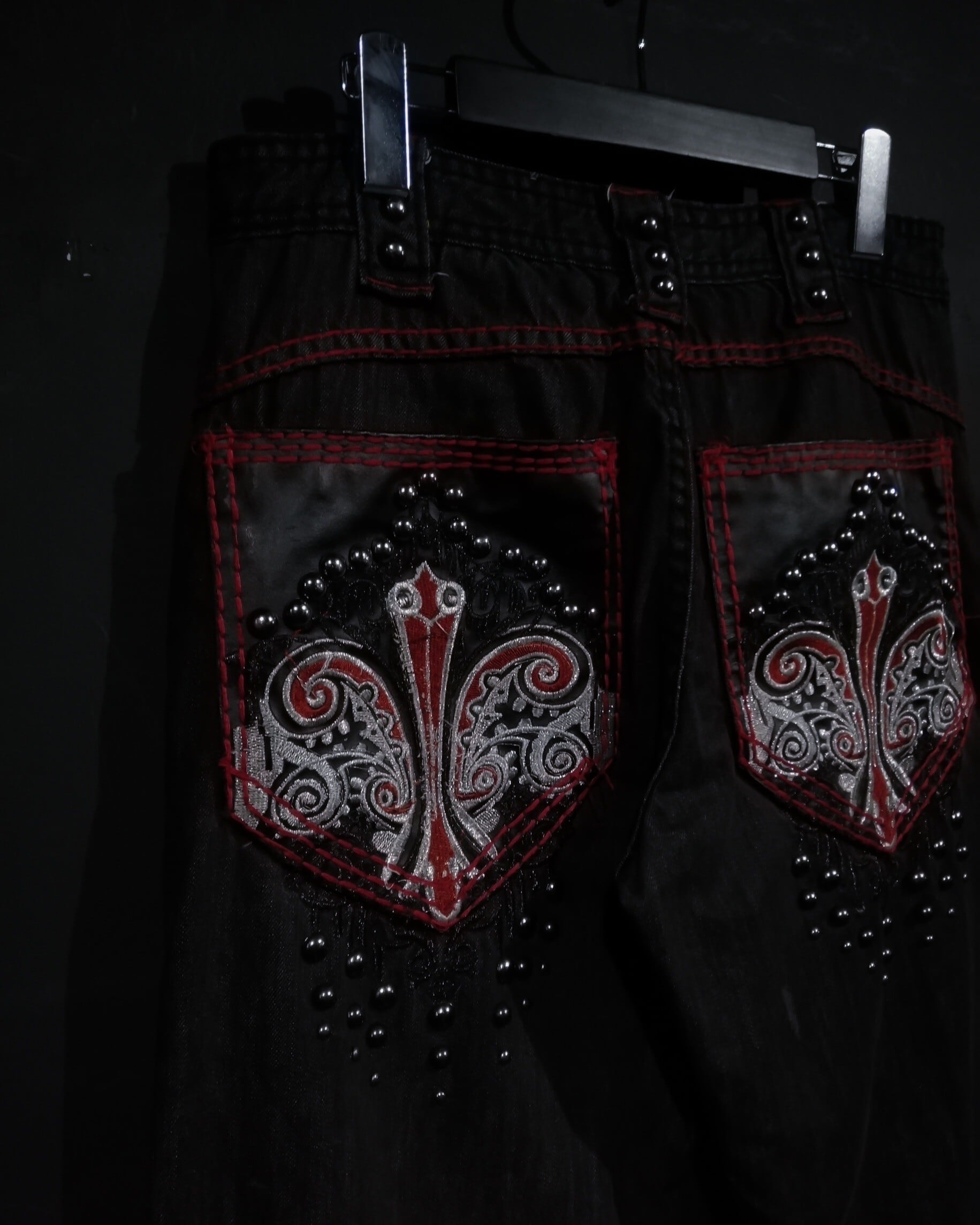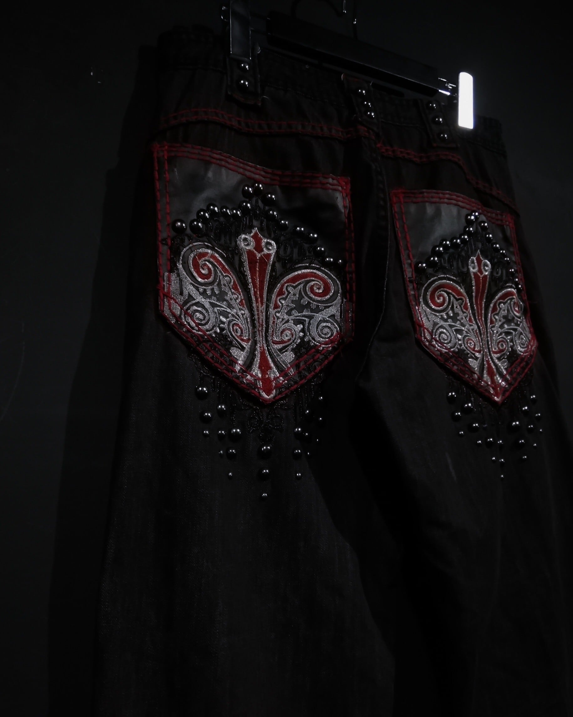鈍く光沢を放つメタリックブラックのボディのバックポケットにフェイクレザーを切り替え、Bling-Blingな刺繍を大胆に刻んだスペシャルなバギーデニムパンツ。