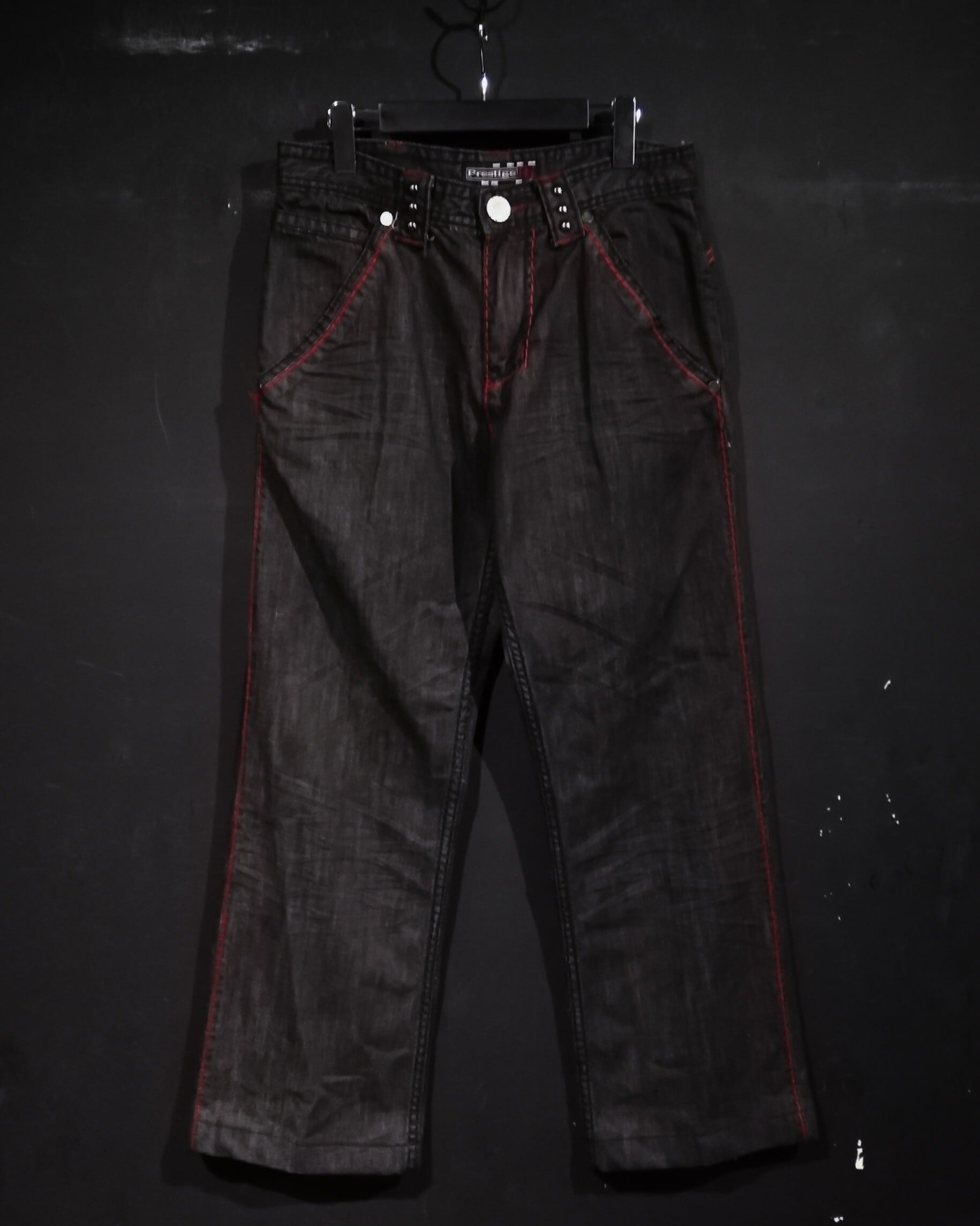 バックポケット、ベルトループには鋭い光沢を放つスタッズを施し、ボディの随所にはざっくりとした赤色のステッチ。バギーデニムの中でもかなりクオリティの高いデザインで、今の気分ドンズバですね。