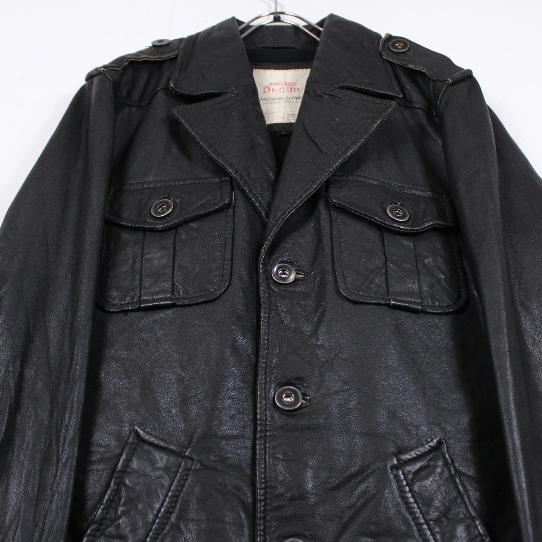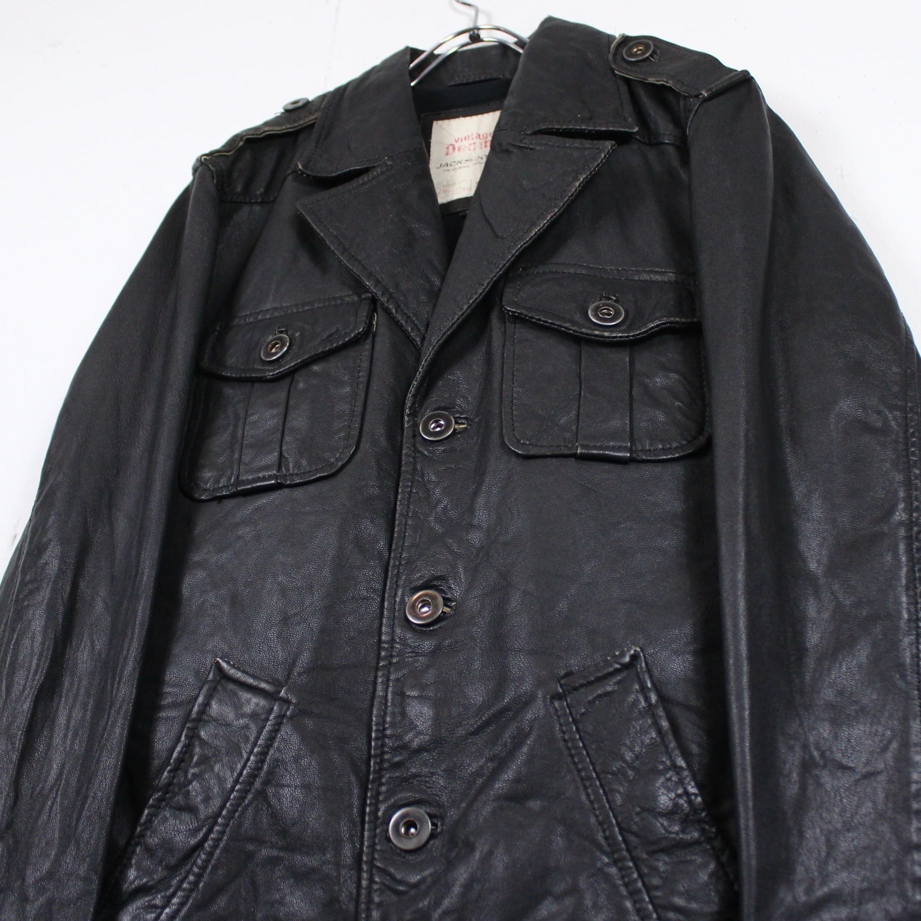 大ぶりな襟に肩のエポレット、両胸元の大きなフラップポケット、スッキリとした綺麗なAラインシルエット等、ミリタリーを彷彿とさせるディテールで仕上げられたレザージャケット。