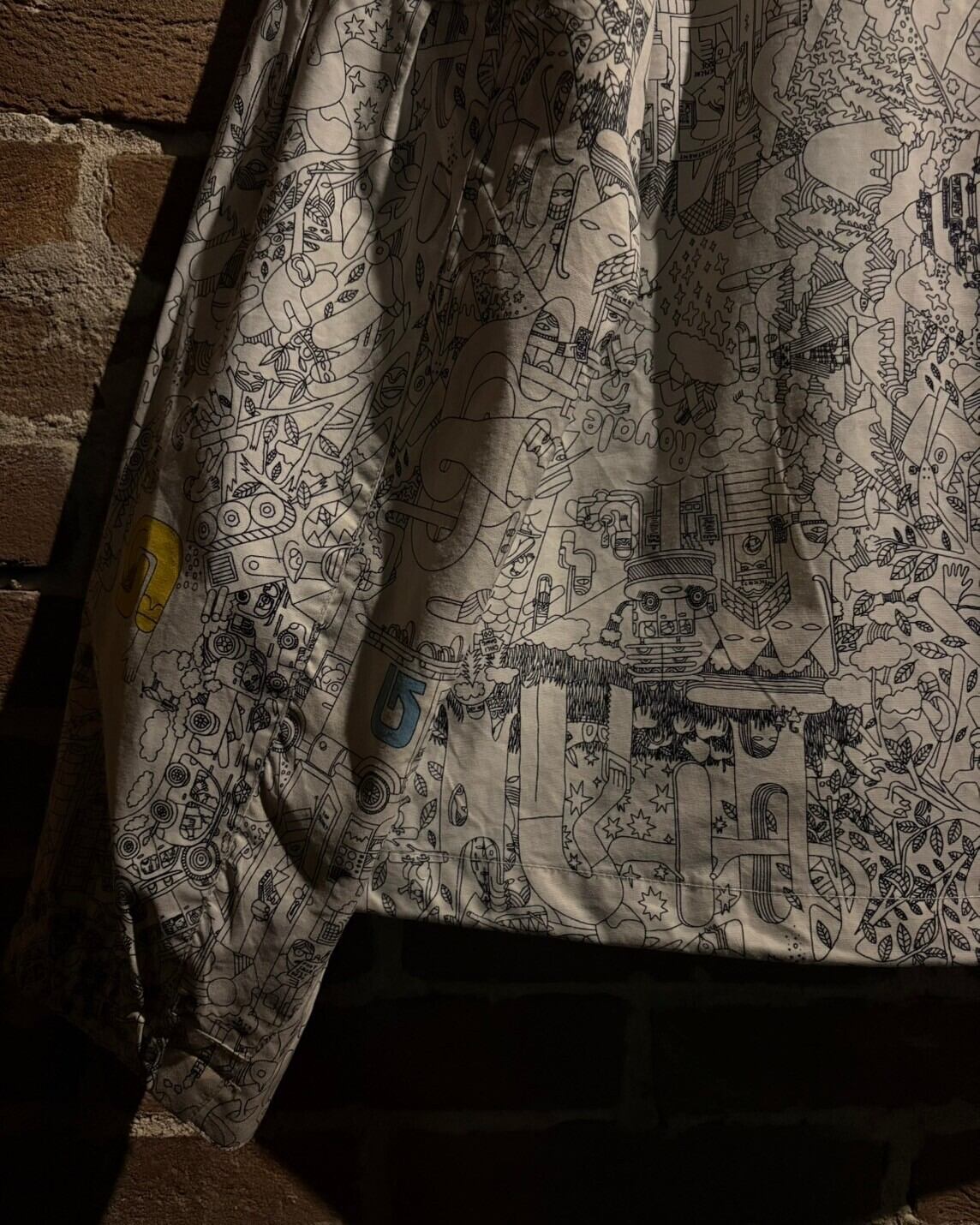 ハリのあるホワイトのボディをベースに、アート調の緻密なグラフィックが載せられたギアジャケット。
