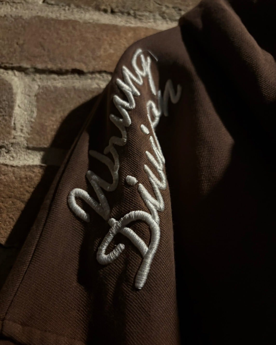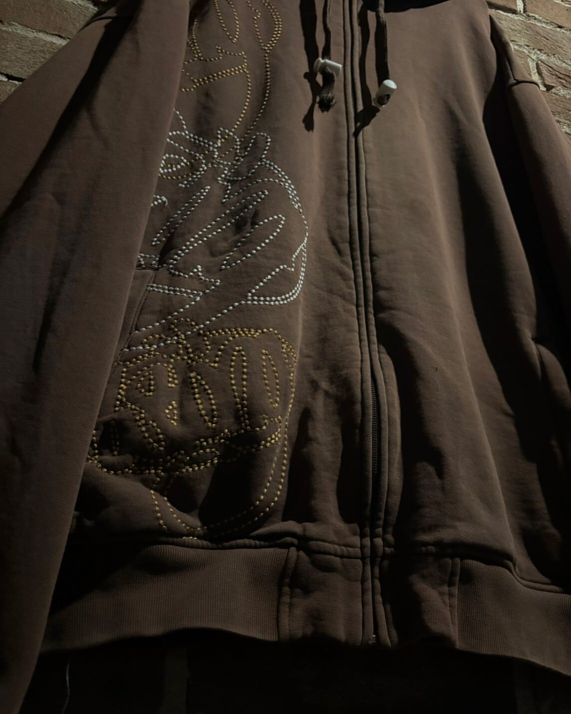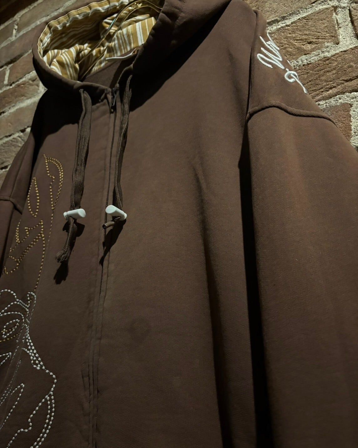 フェード感の良いブラウンのボディをベースに、右身頃にはブランドロゴを白×黄のステッチで、左肩には立体感のある刺繍でブランドネームを刻んだジップアップフーディ。