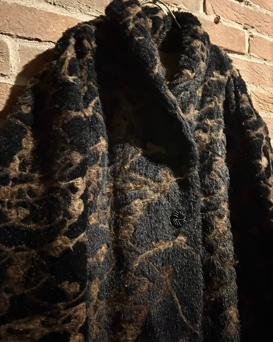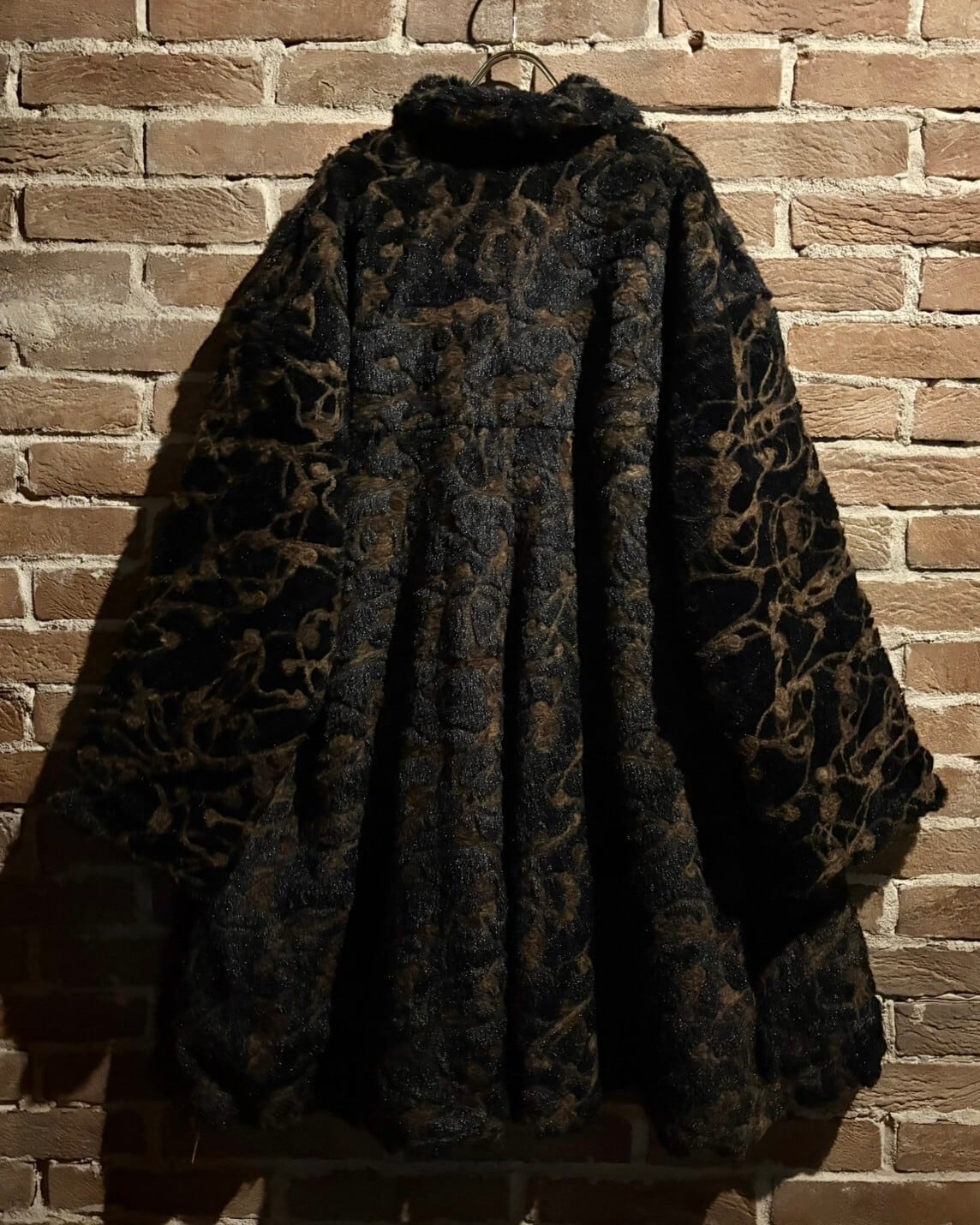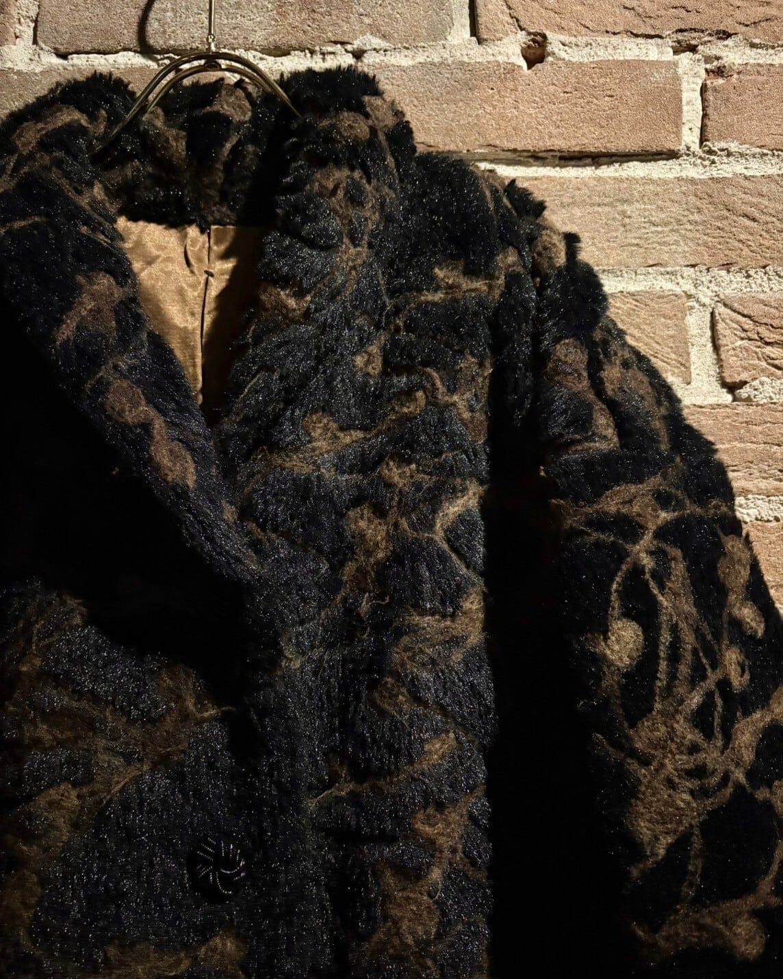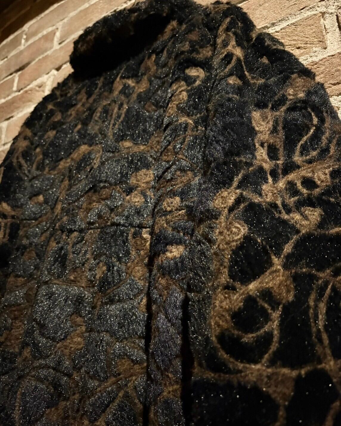 ブラック×ブラウンの上品なカラーリングに、毛足のあるフェルト生地を用いて全体にアーティスティックなデザインを載せたハーフコート。