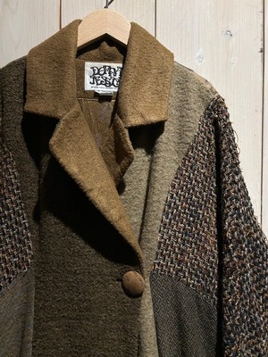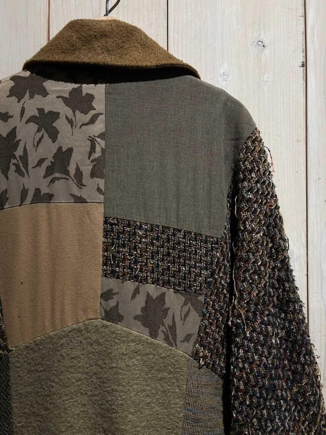 ツイードなど、織り方の異なる様々な生地をパッチワーク状に切り替えた、稀有なロングコートをご紹介致します。