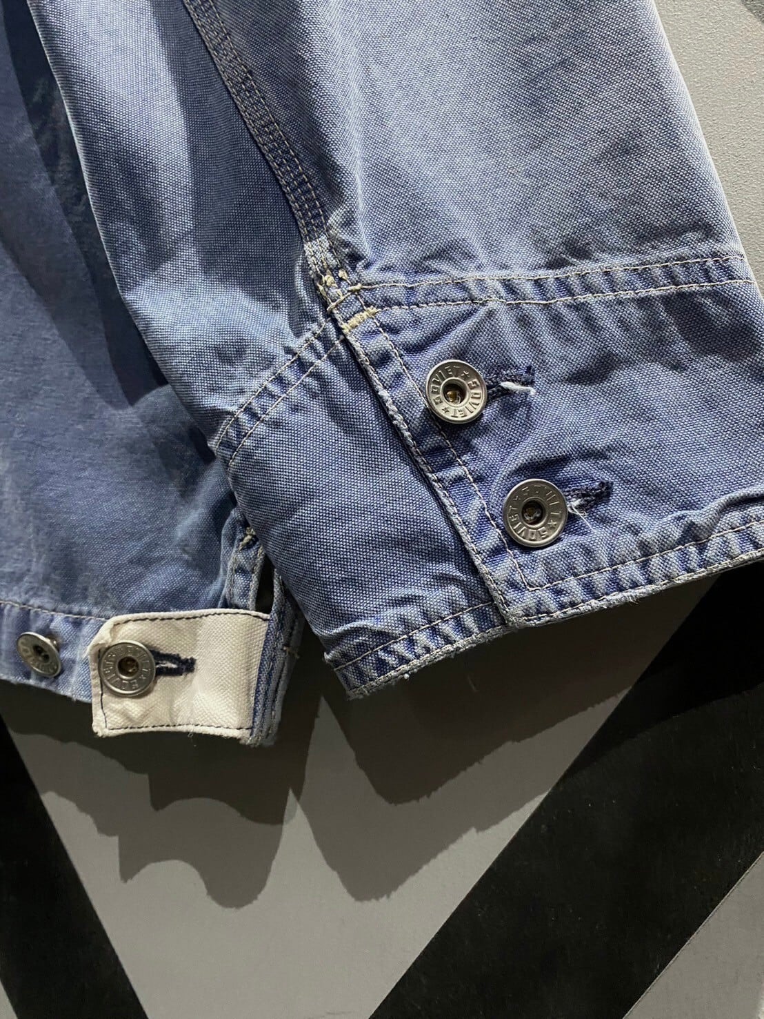 ブルーのと白のフェードしたダック地を切り替えたボディに、数多くの有名ブランドがサンプリングするファイヤーマンギミックを載せたジャケット。