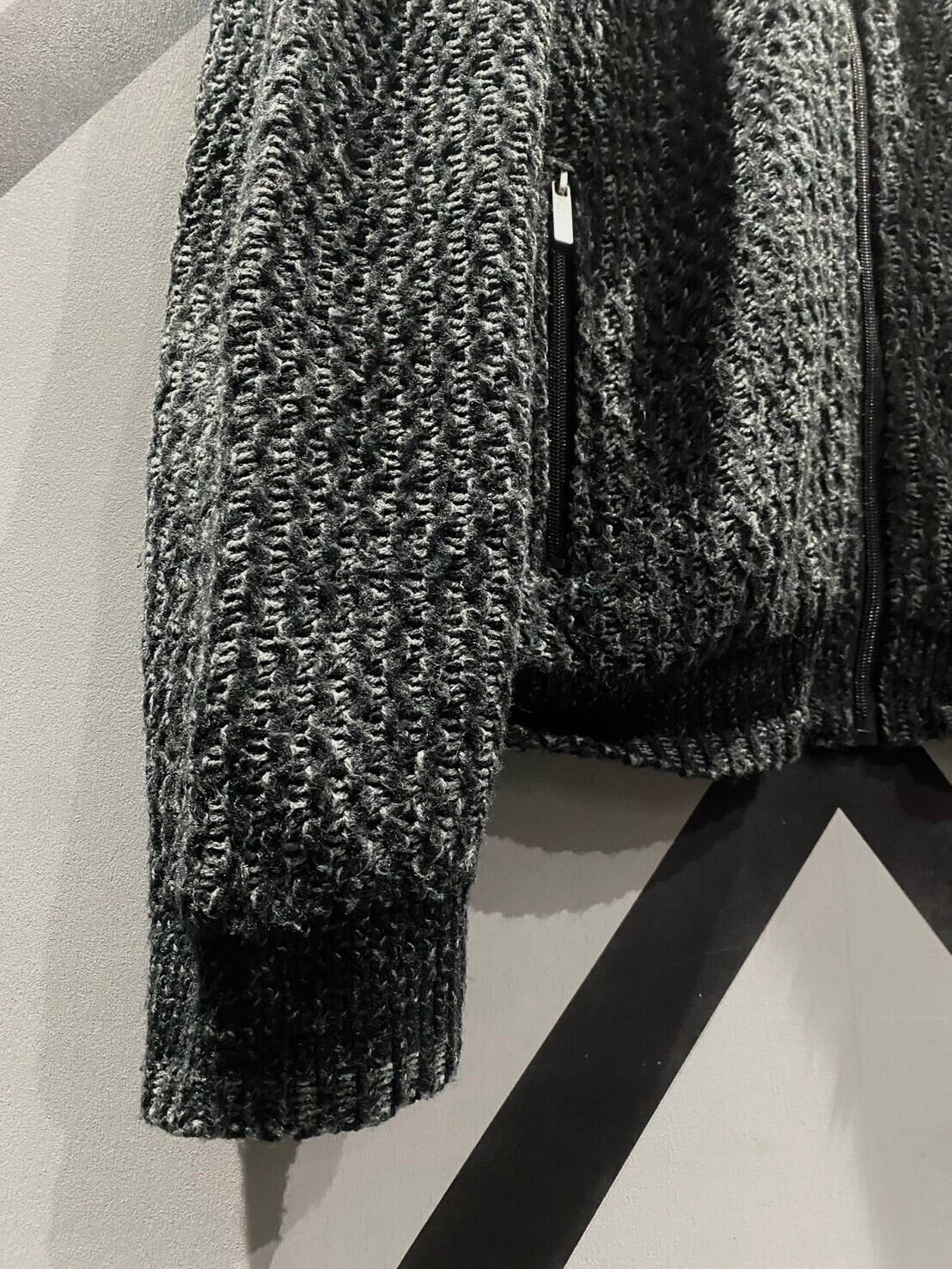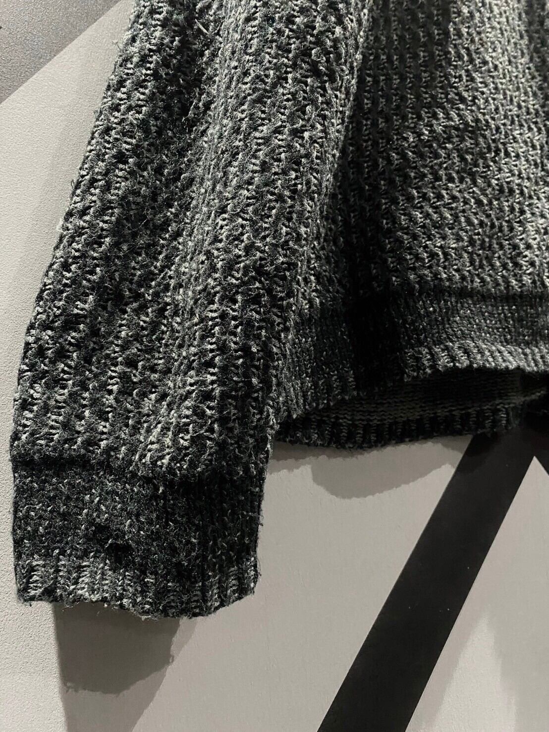 繊細なニッティングによって編み込んだグレーのボディをベースに、肩に濃いグレーの切り替え、裾、袖口にもライン状のデザインを施した1着。