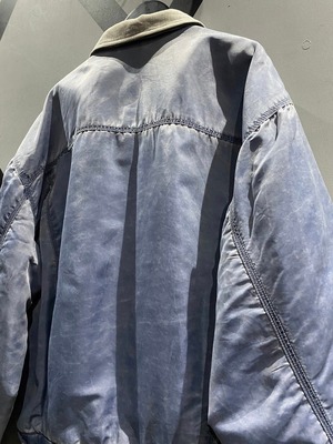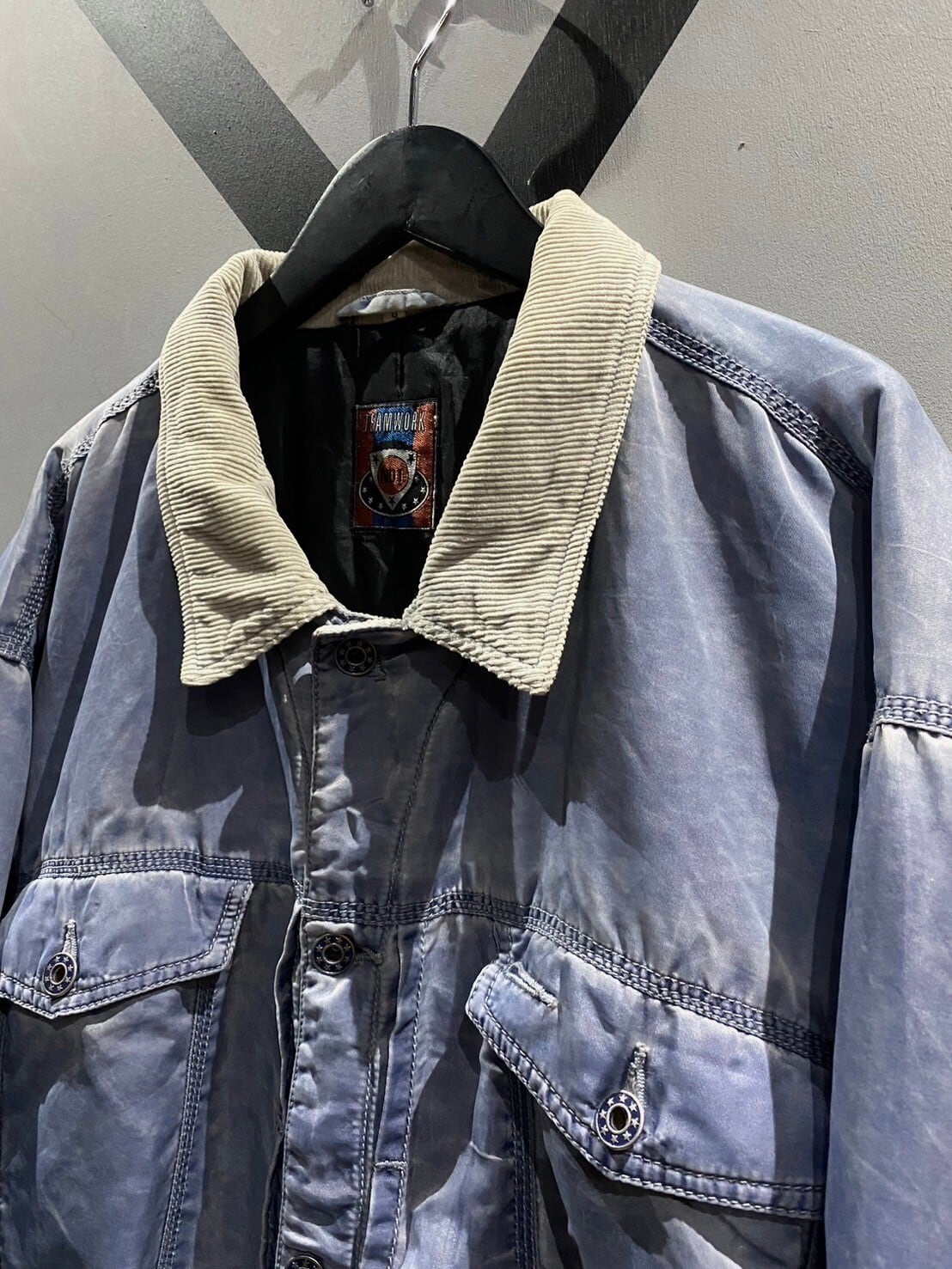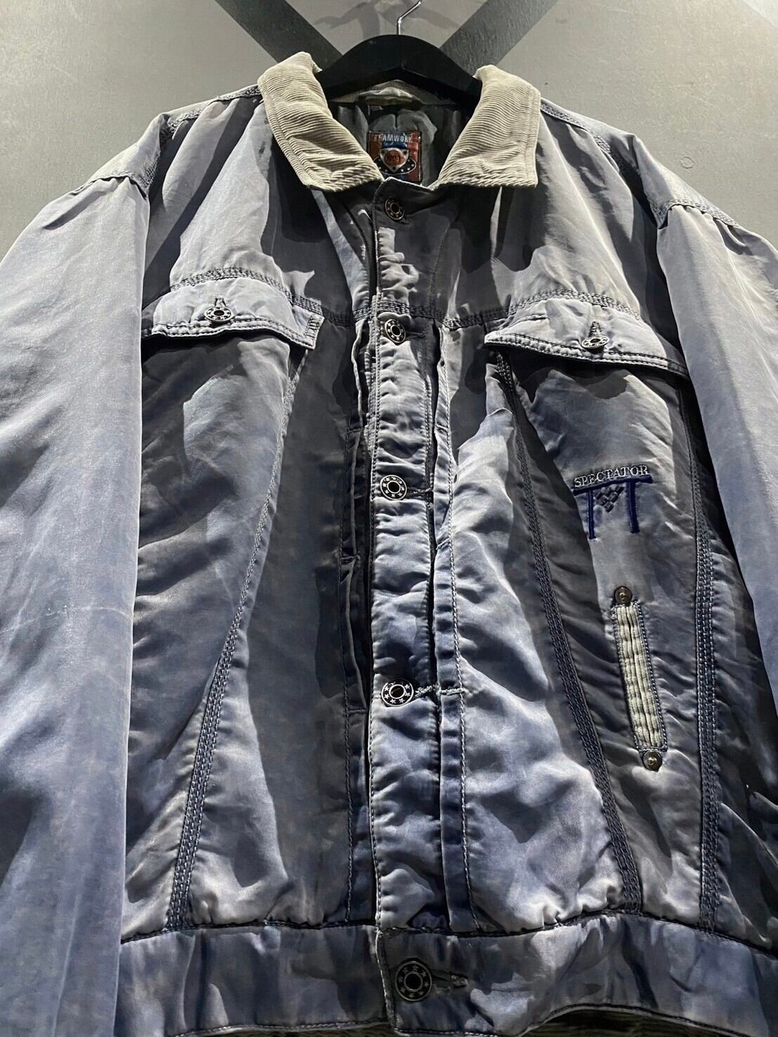 ストーンウォッシュのようなフェードを効かせたブルーのナイロンボディを用いて、古着でも定番のトラッカー型に落とし込んだジャケット。