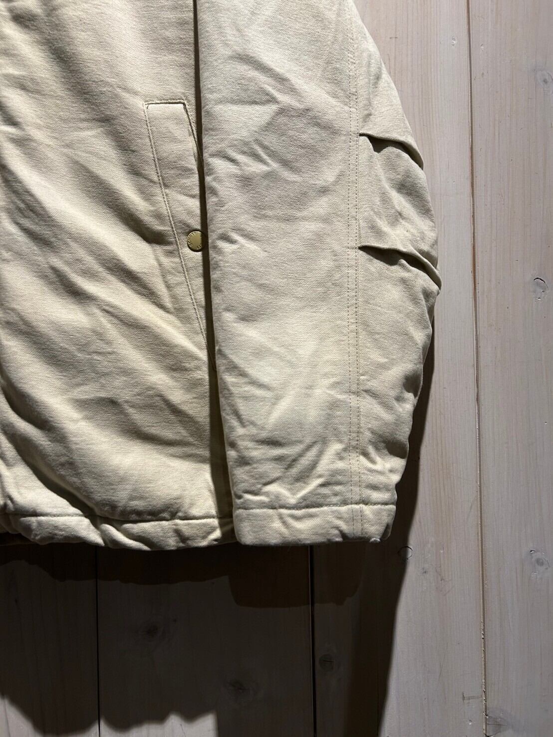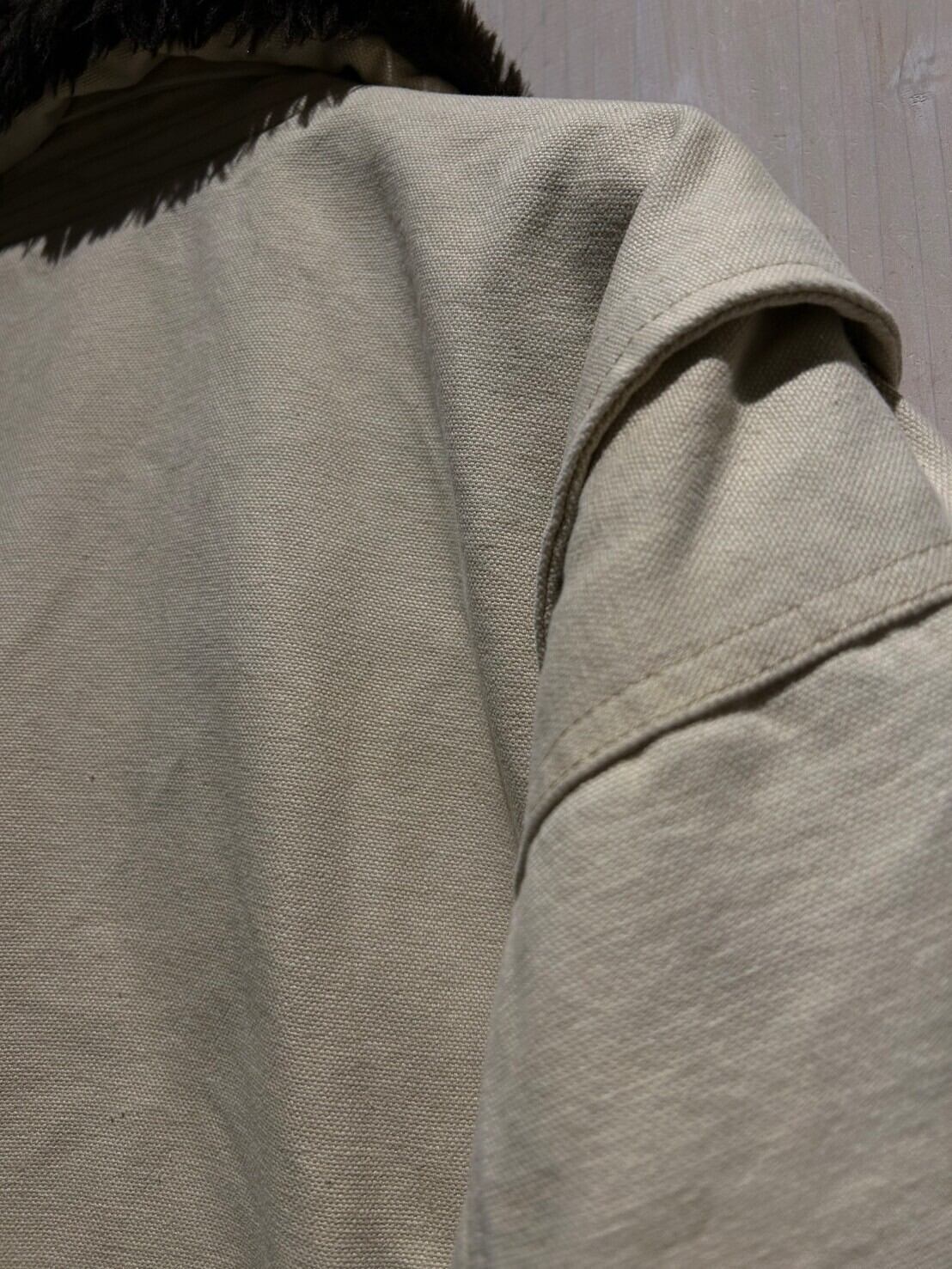 ハリのあるアイボリーカラーのダック地をボディに使用。襟にブラウンのボアを施した稀有なダックジャケット。