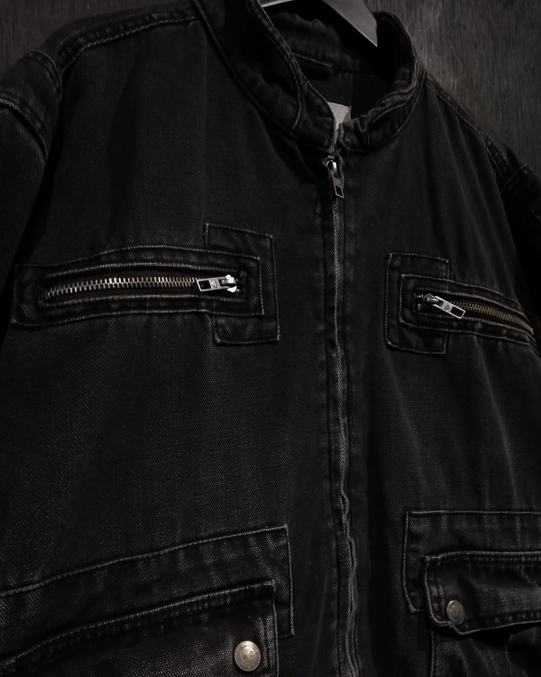 ガシッとタフなコットン素材を用いて、フロントには2つのフラップポケットに2つのジップポケット、バックにはブランドのロゴでもある鷲をシャギーのような立体的な糸によってデザインしたジャケット。