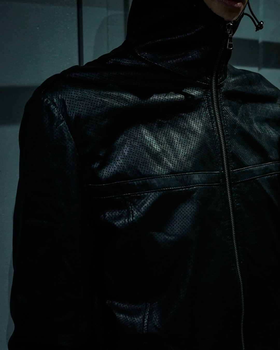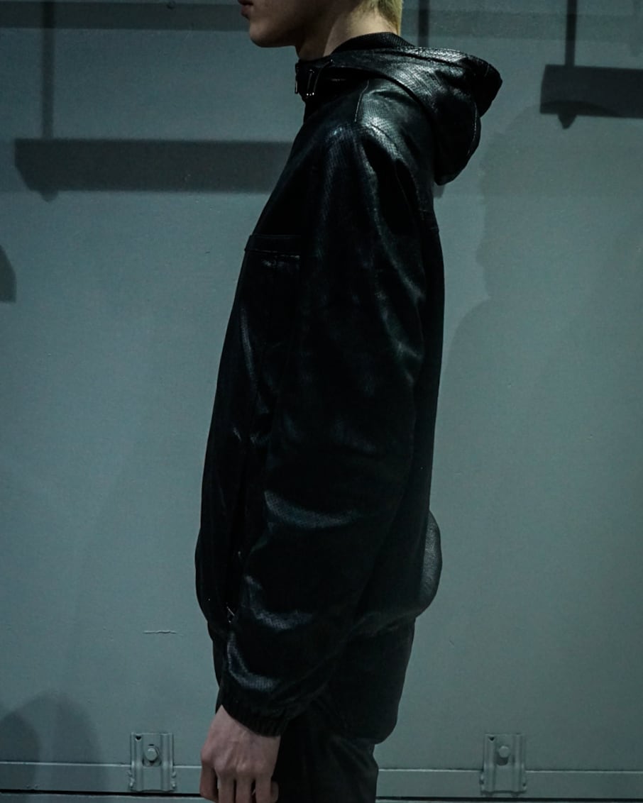 しなやかな質感の極上のラムレザーをボディに使用。全体に無数の穴が施された、パンチング加工を加え、ジップフーディー型で仕上げた稀有な1着。