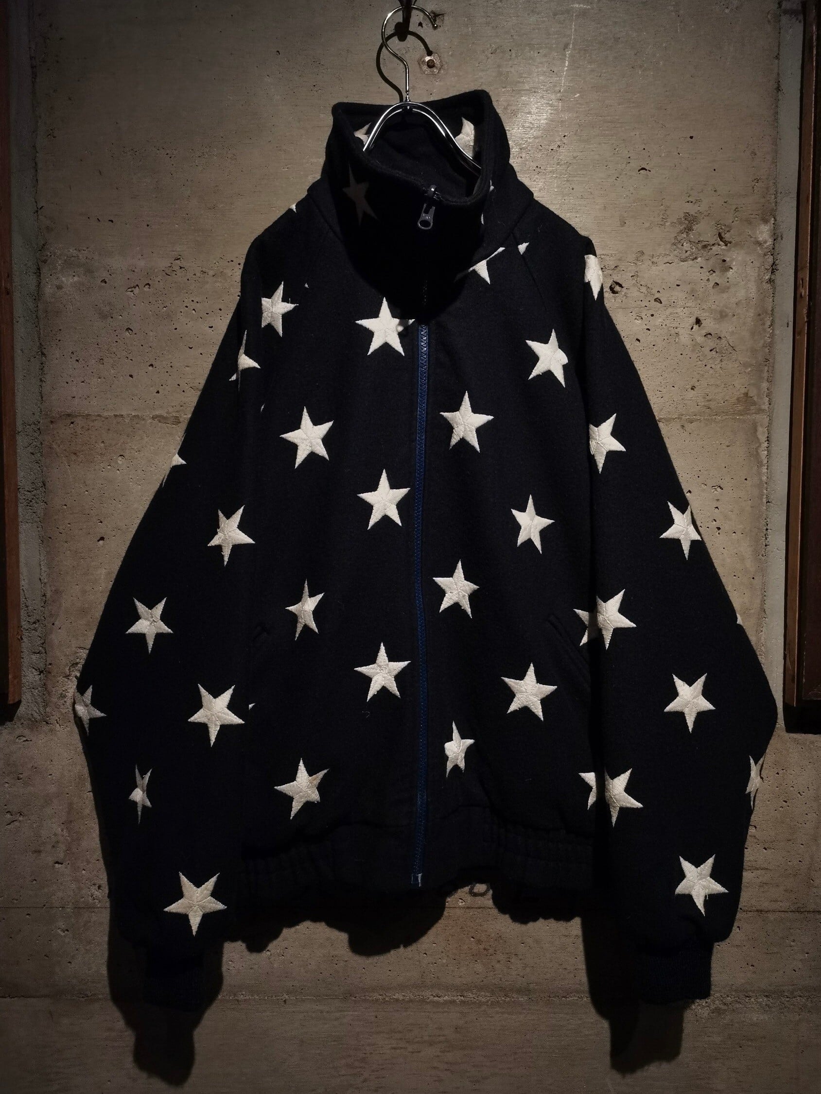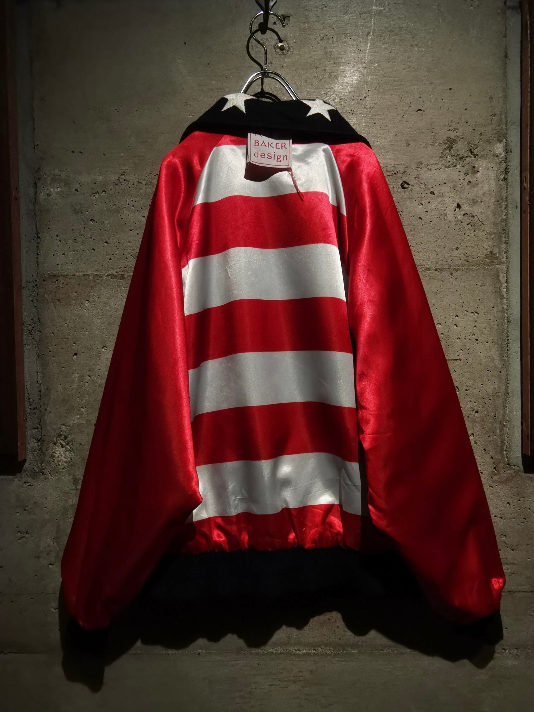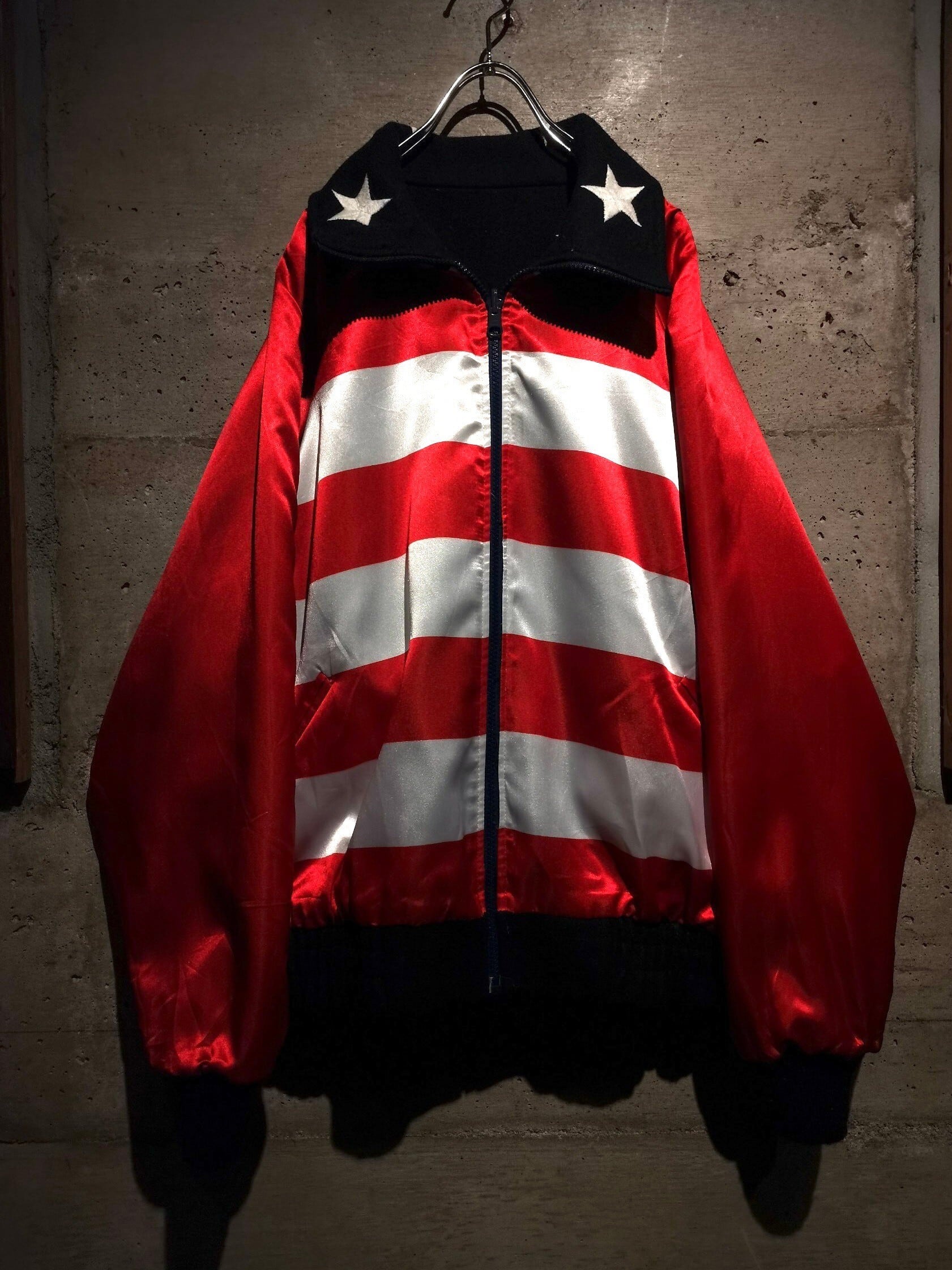 表面はネイビーのメルトン地にホワイトのの星の刺繍、裏面には光沢を帯びた滑らかな生地に赤×白のストライプを載せ、両面でアメリカの国旗である星条旗を表現したジャケット。