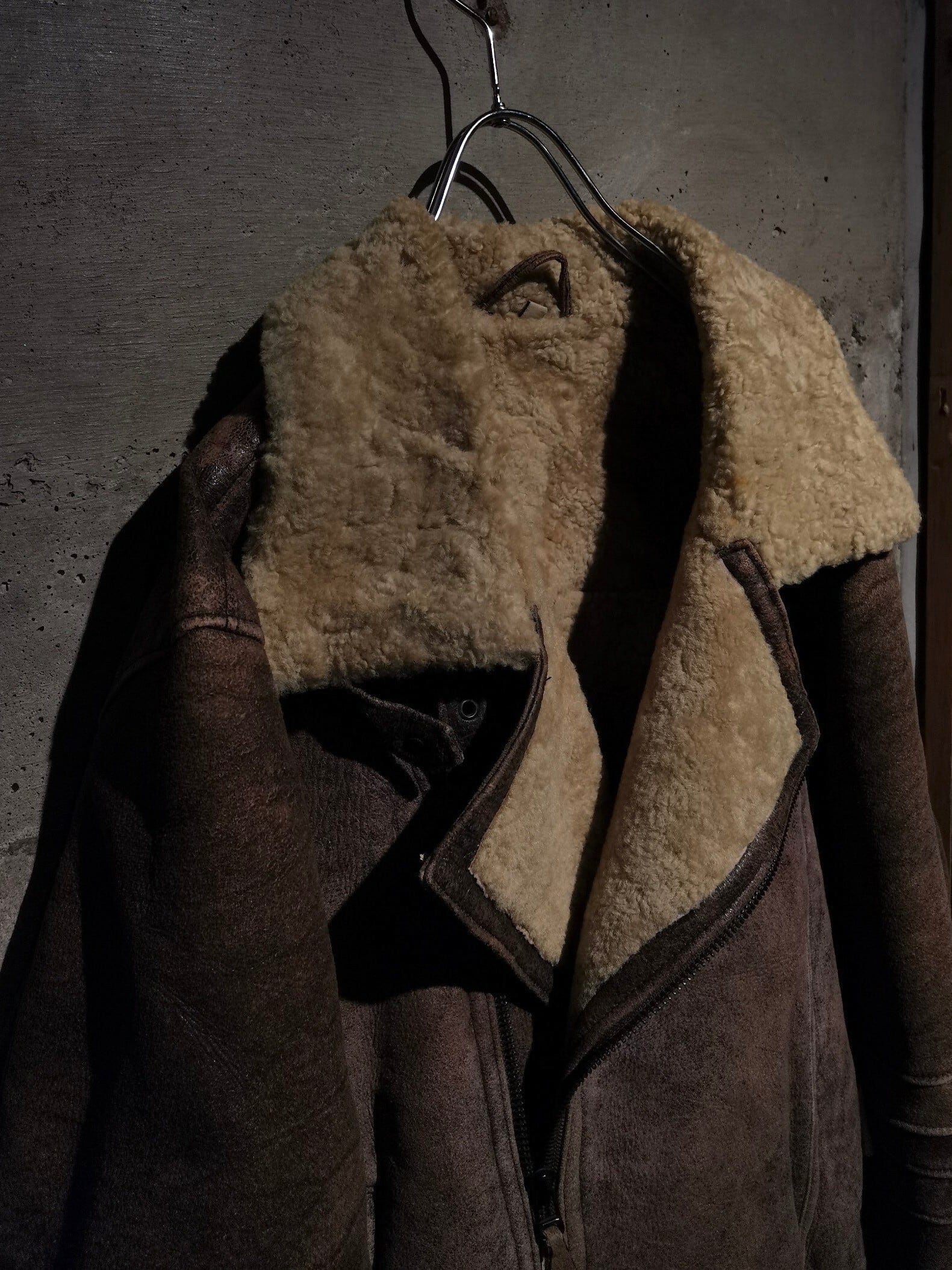 経年変化による美しいフェードの効いた、しっとりと柔らかなムートン生地をボディに使用し、ダブルライダース型をベースに仕上げた稀有かつスペシャルなムートンジャケット。