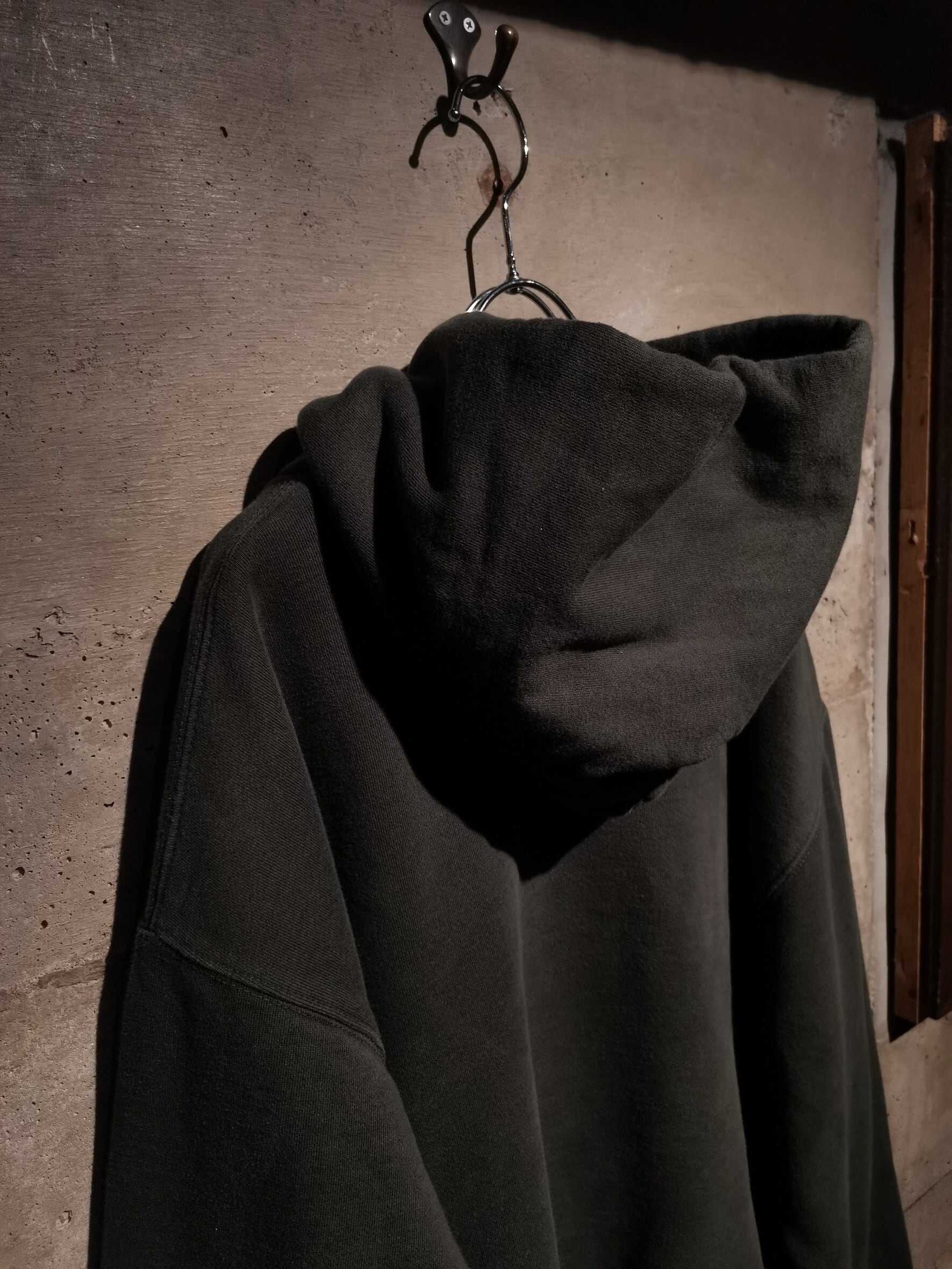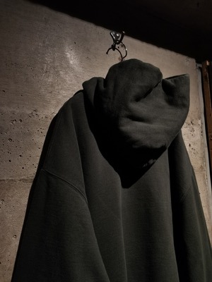フェードの効いたチャコールグレーのボディに、"ye must be Born again"の文字を立体的な発泡プリントによって載せたプルオーバーフーディー。