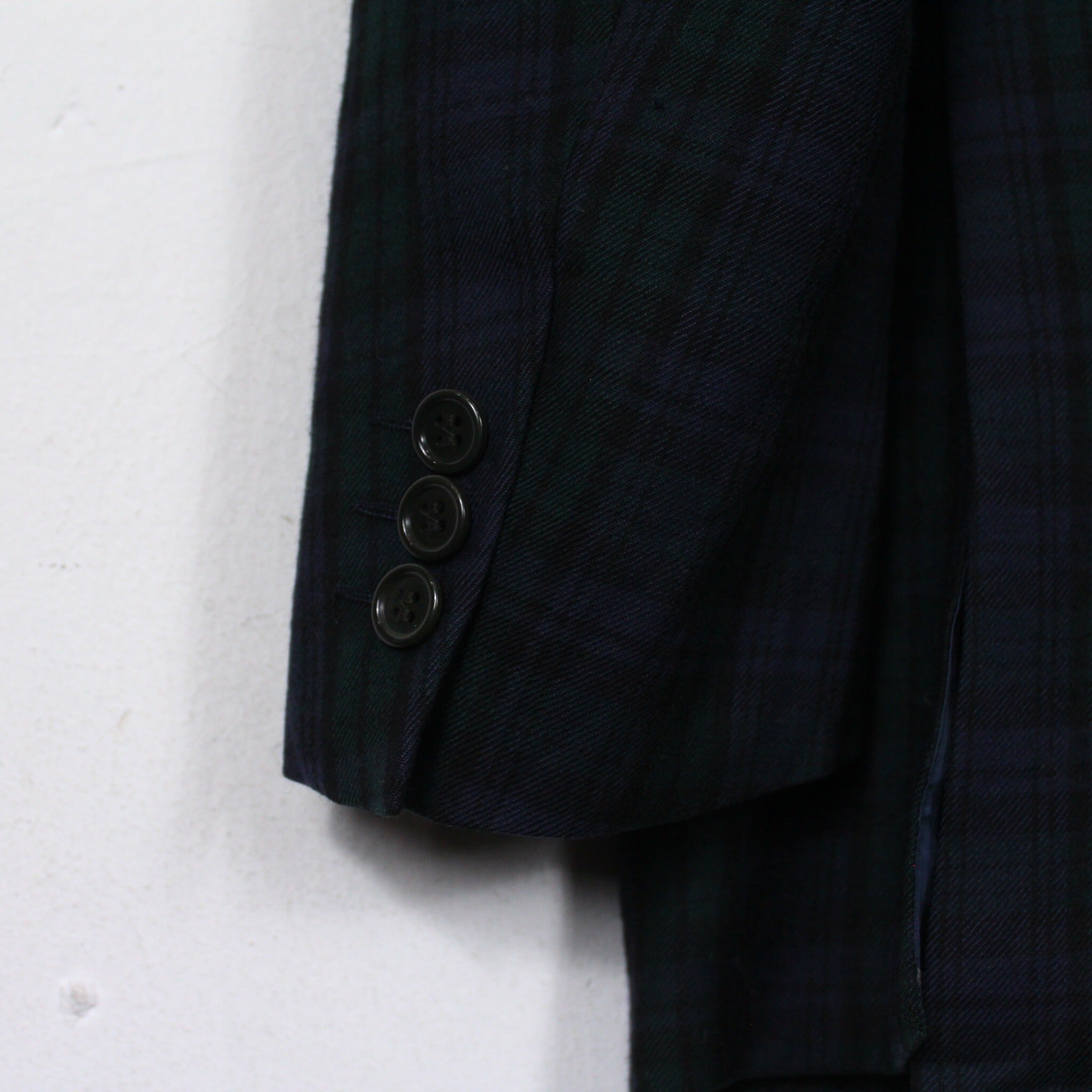 柔らかく上質なウール素材を用いたチェック柄を載せたボディに、チェック柄を載せたテーラードジャケット。