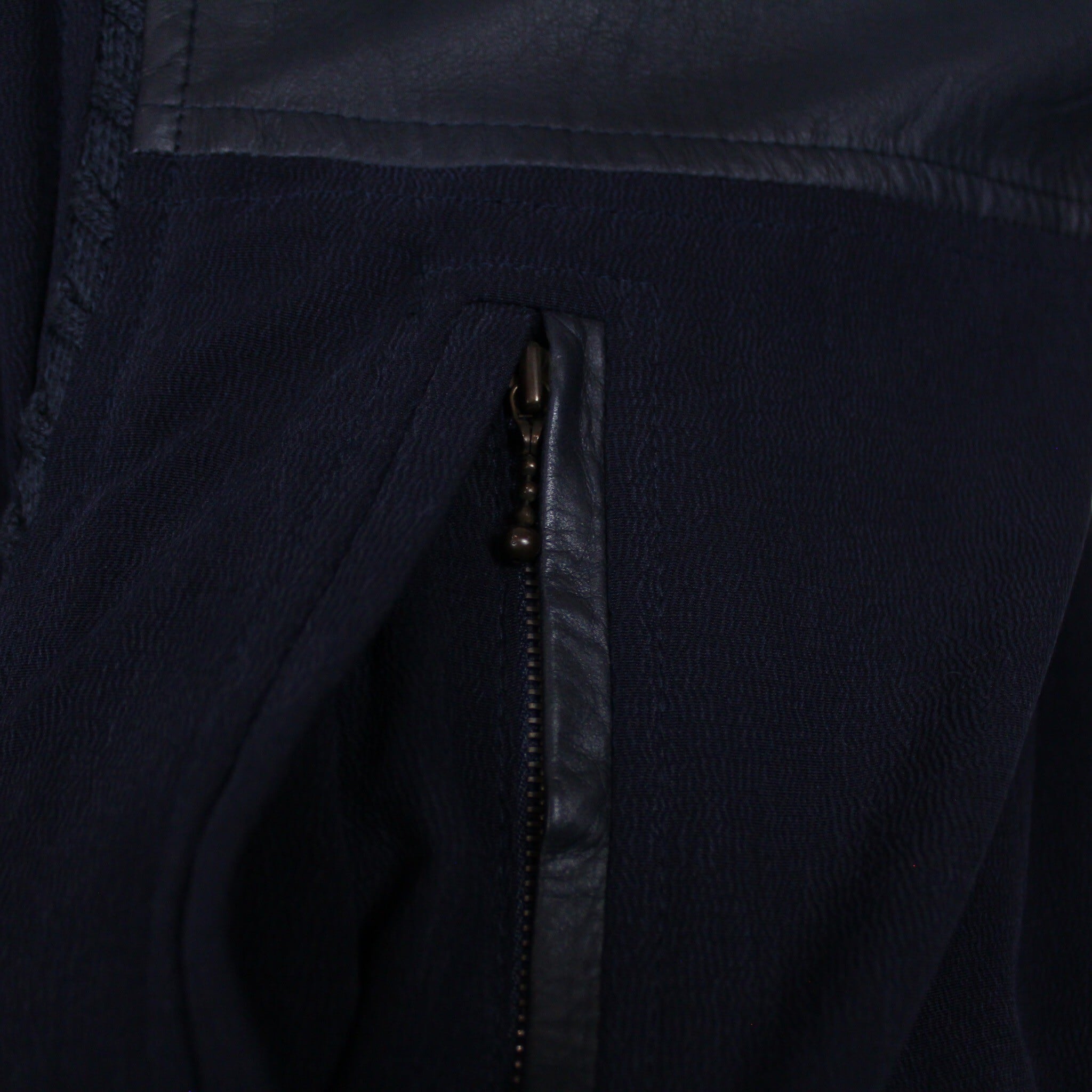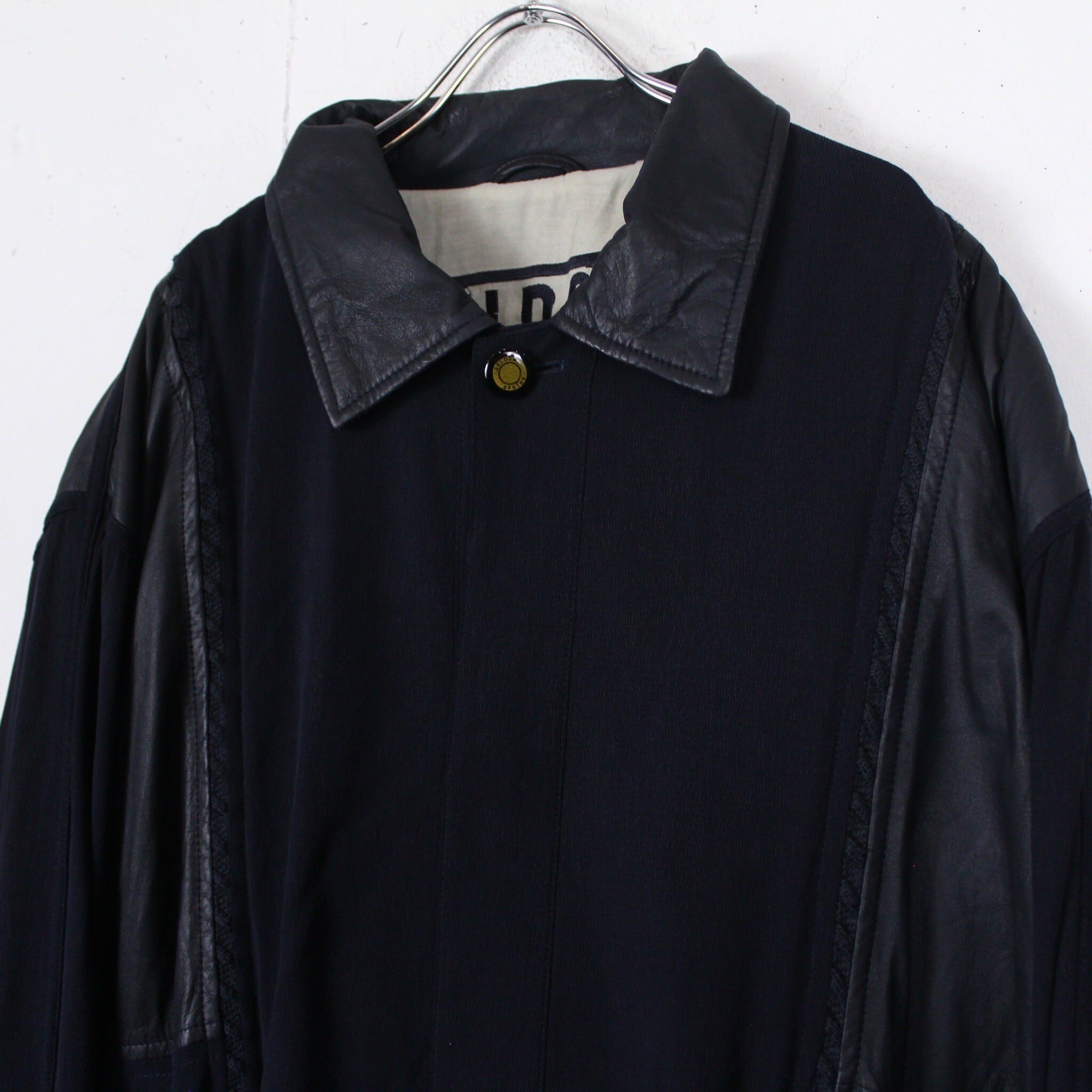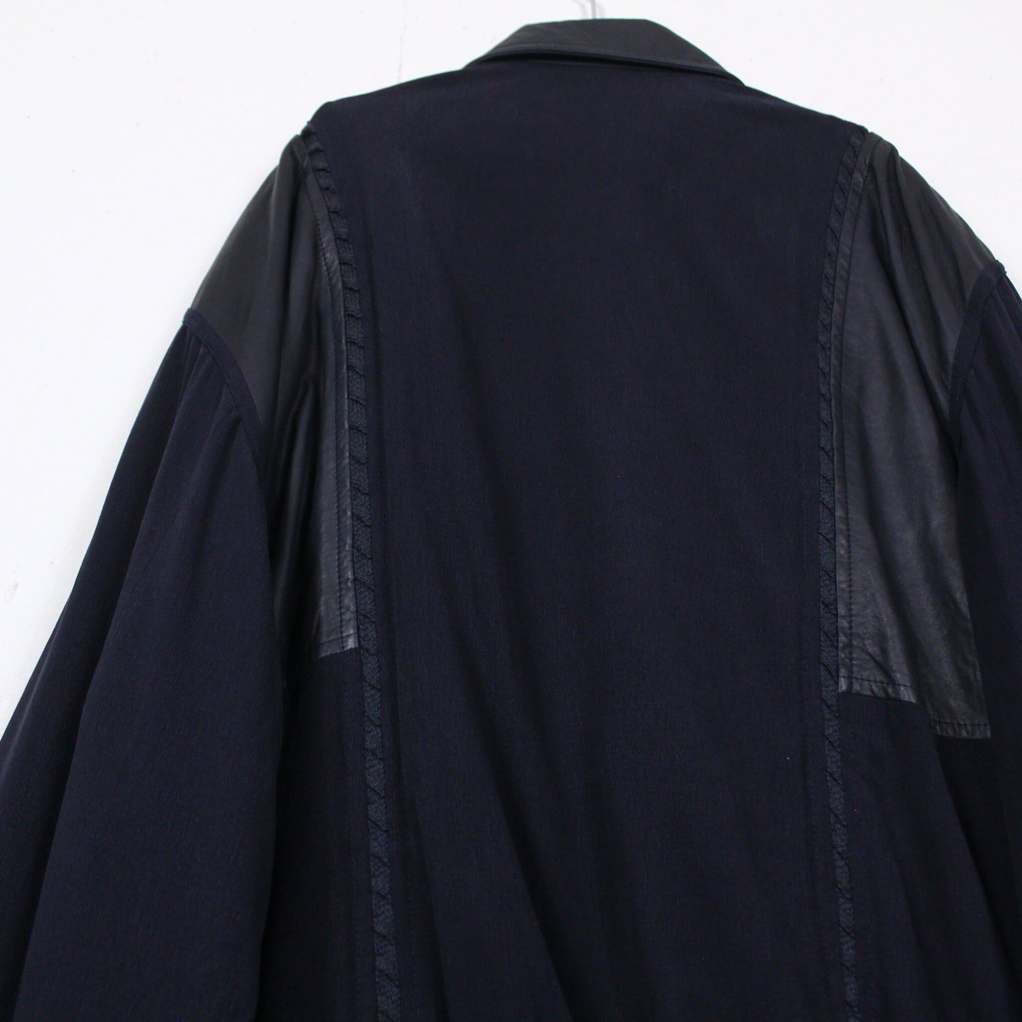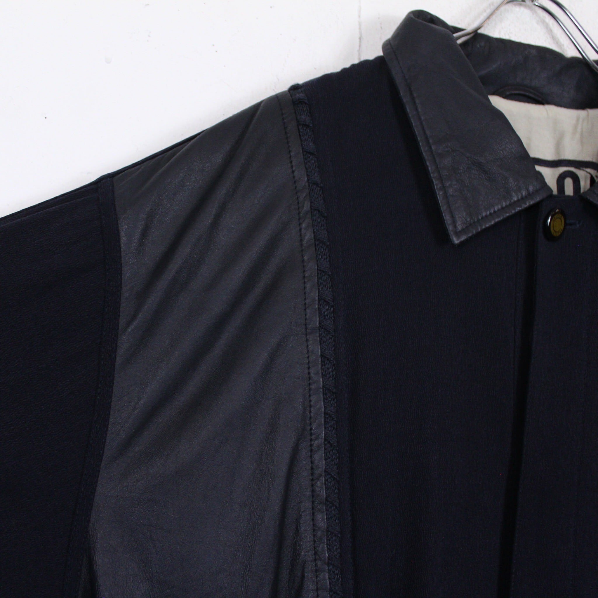 ネイビーのコットンポリ素材のボディをベースに、襟や肩周りにレザーを切り替えたジャケット。ポケット口にまでレザーが切り替えられ、細部までのこだわりを感じます。