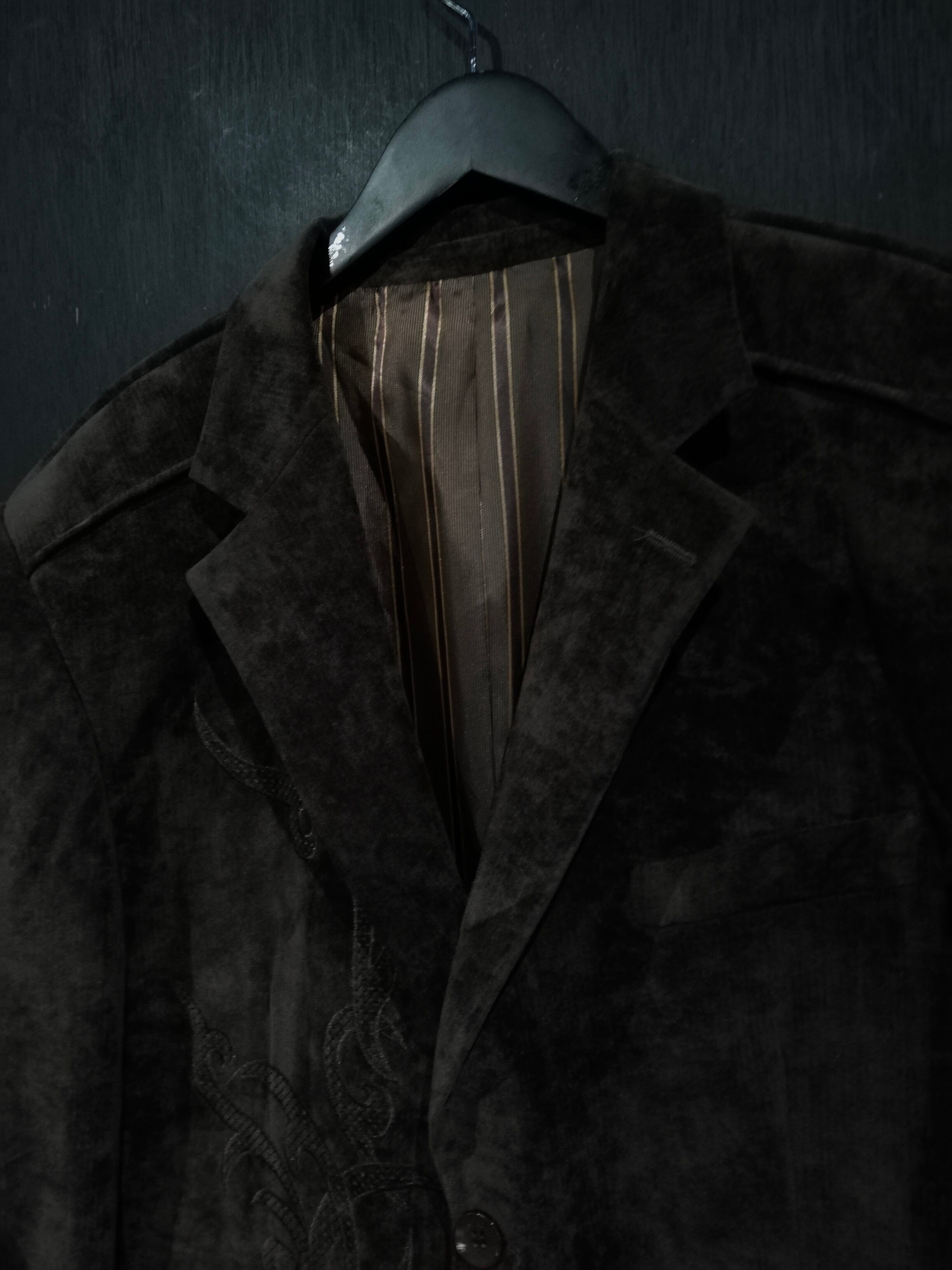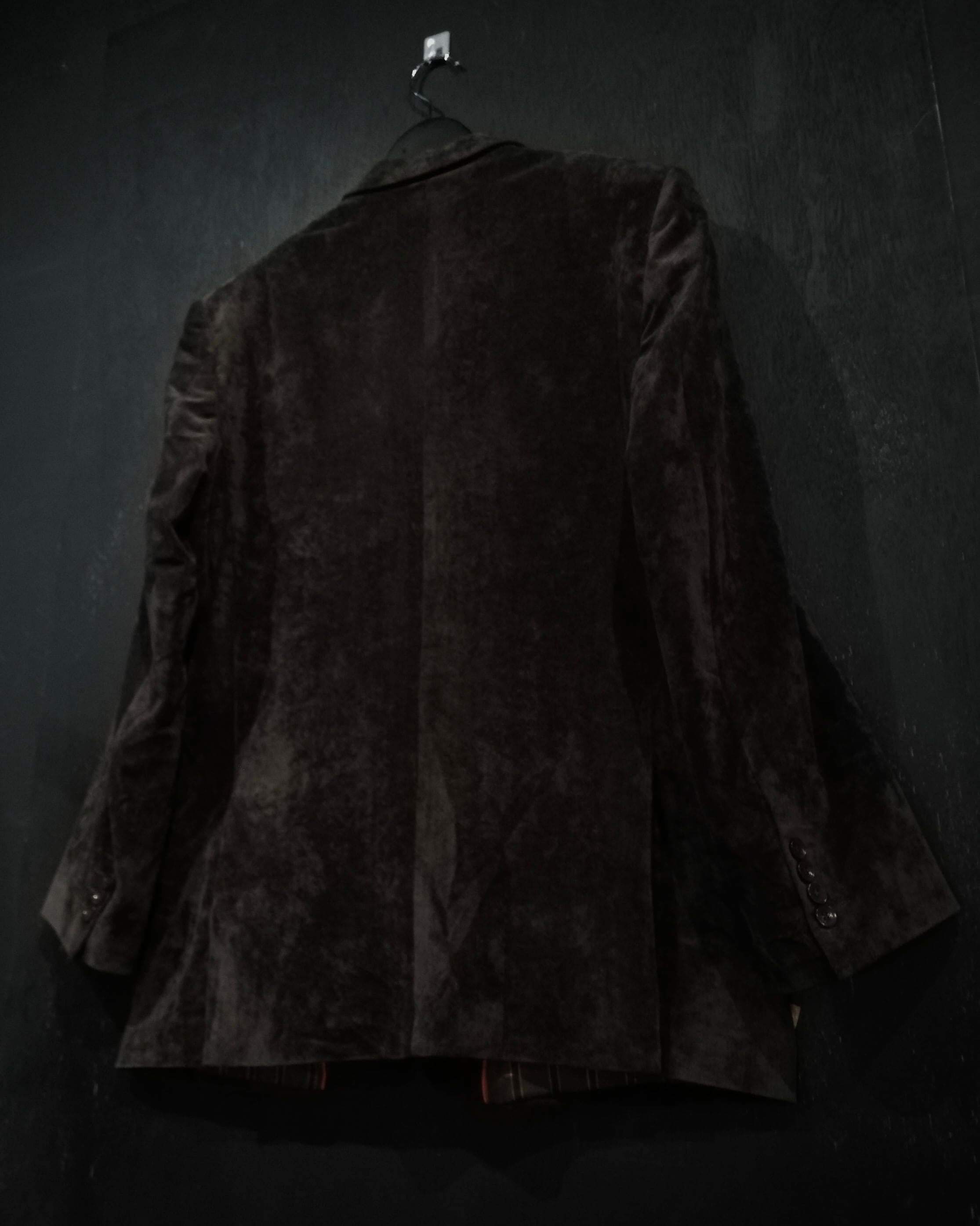ベロアの様に鈍い光沢を放つコーデュロイを用いたボディに、トライバルなデザインを載せた、当店らしいフレーバーを纏ったテーラードジャケット。