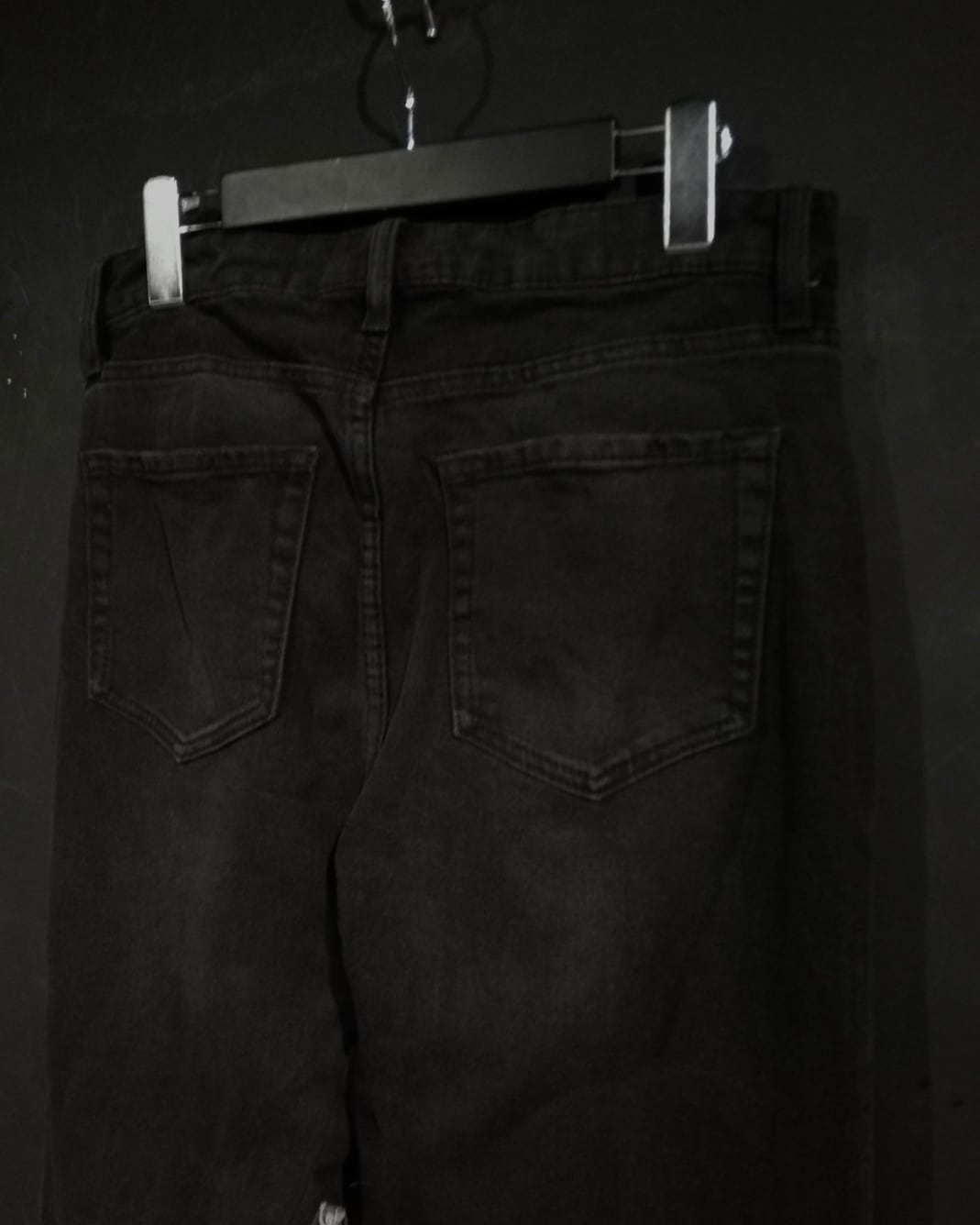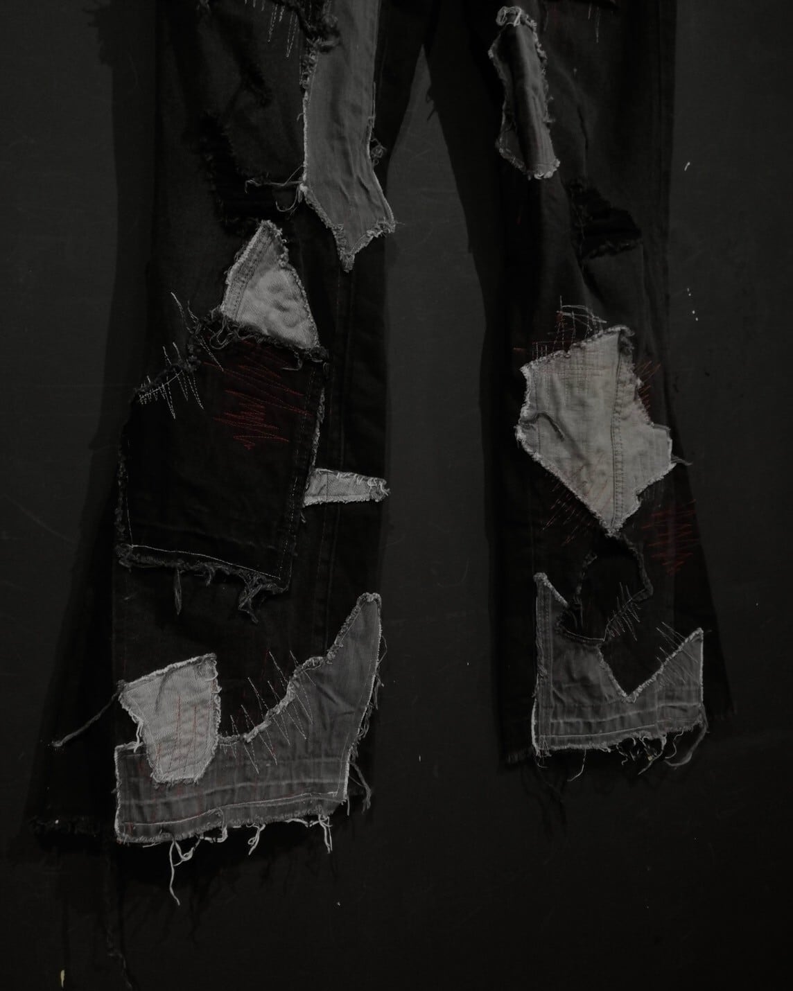 ブラックのボディをベースに、裾付近にランダムなパッチワークを施したふれあデニムパンツ。
