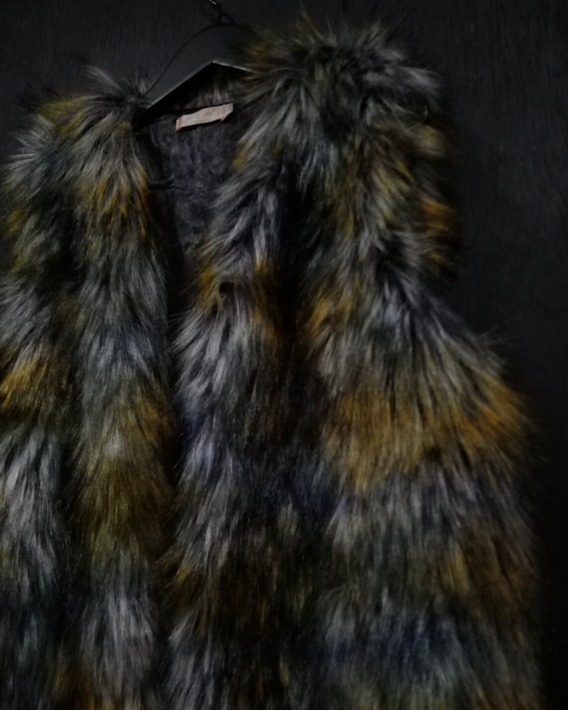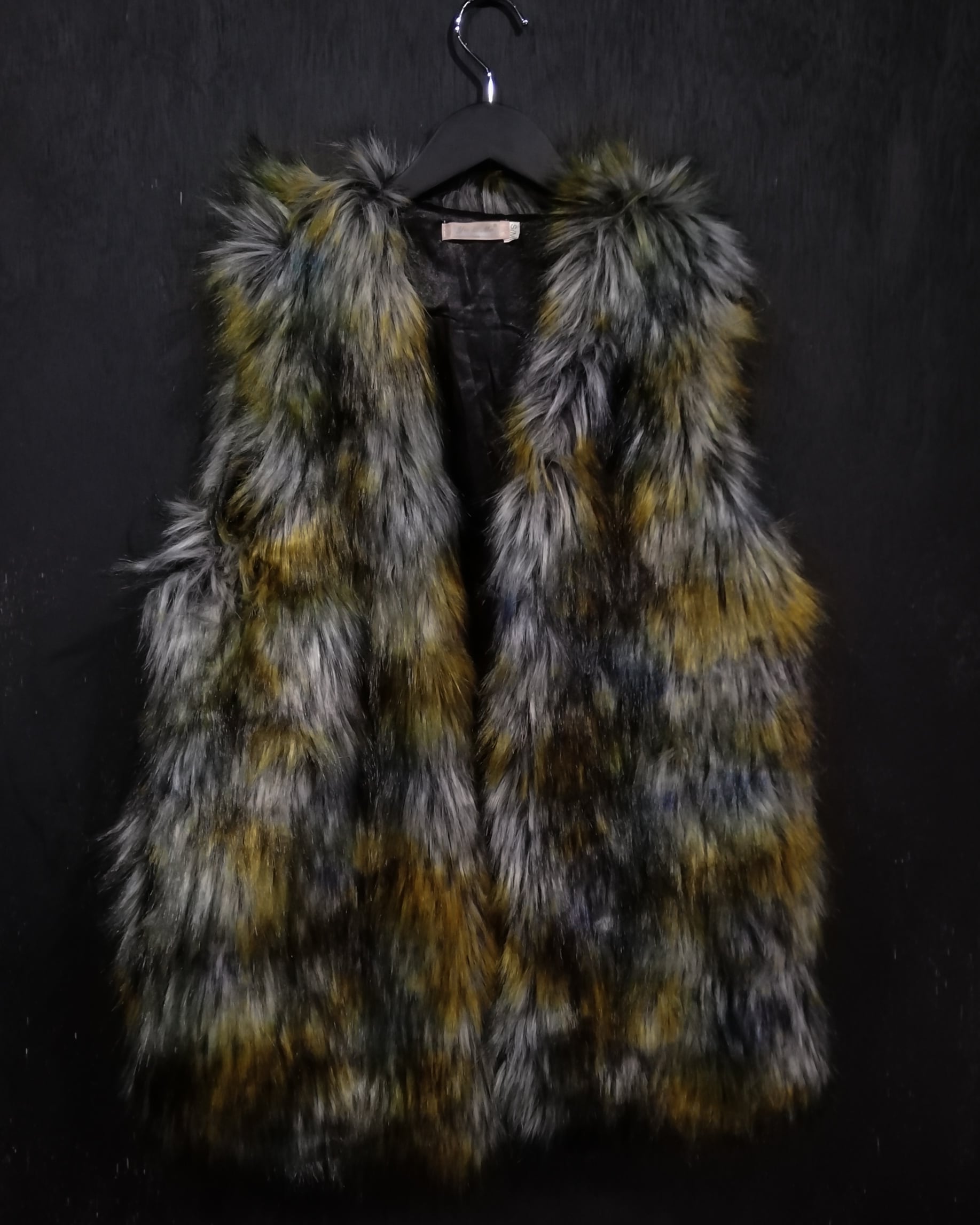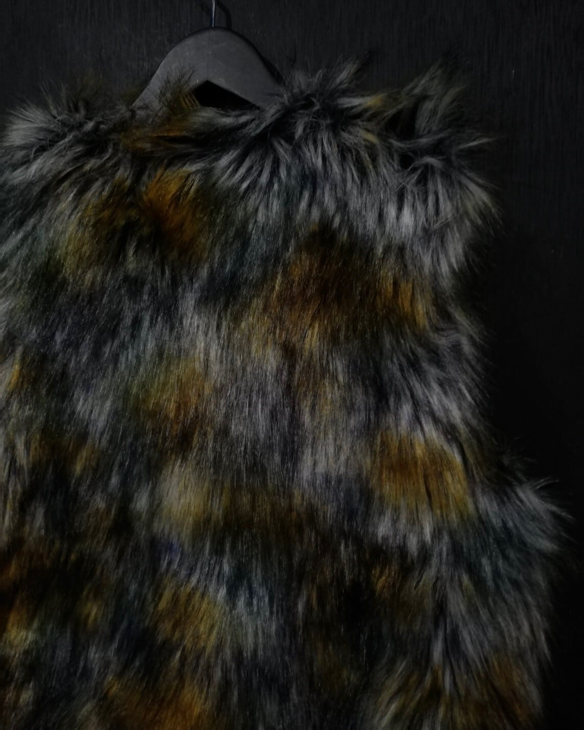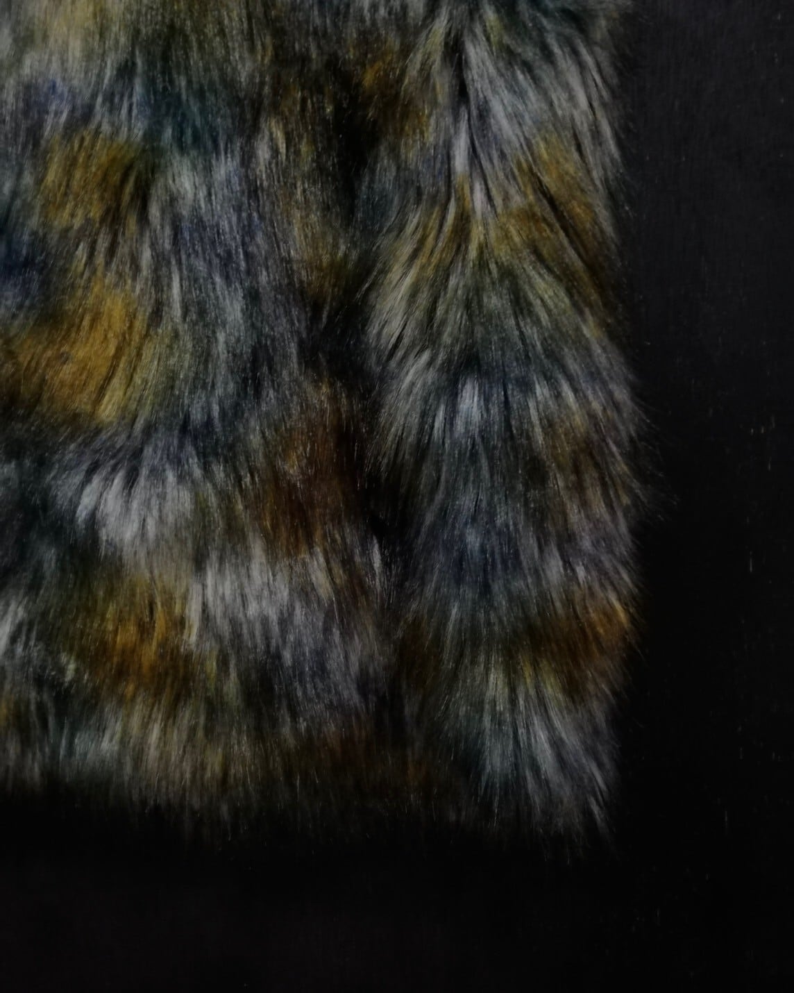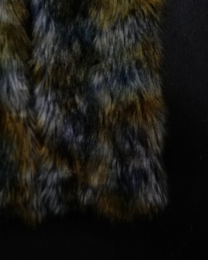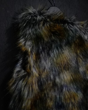 黒、黄、白、など配色の美しいグラデーションが表現されたカラーリングで、毛足の長いモッフモフのファーをボディ全面に配したベスト。