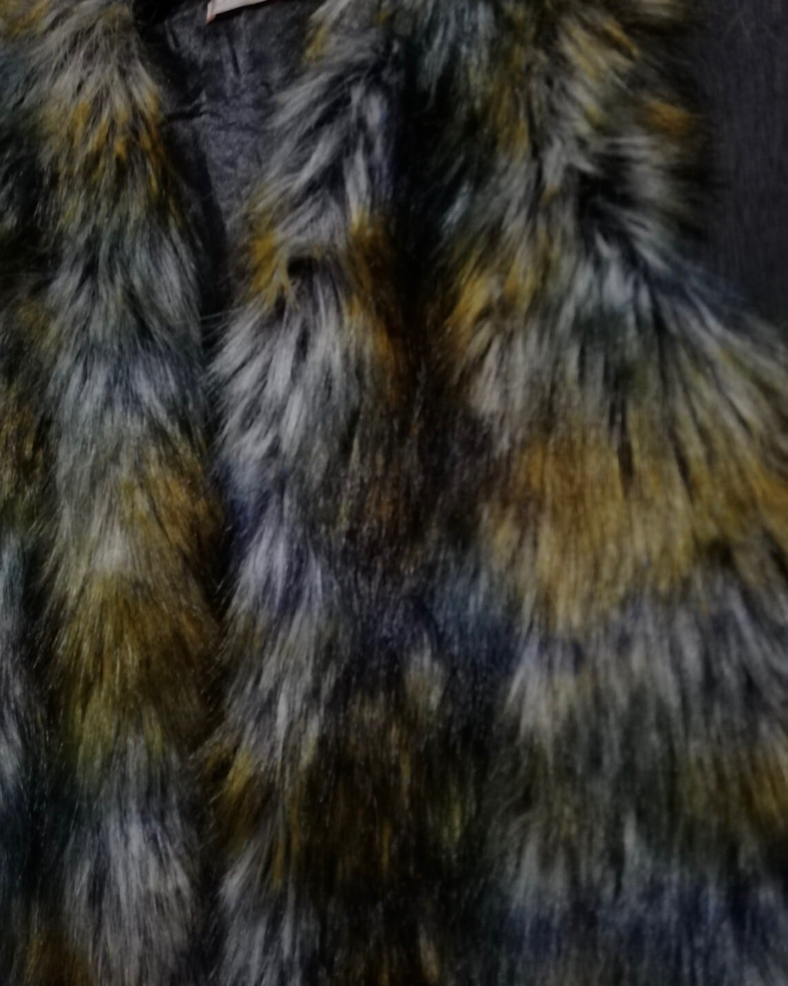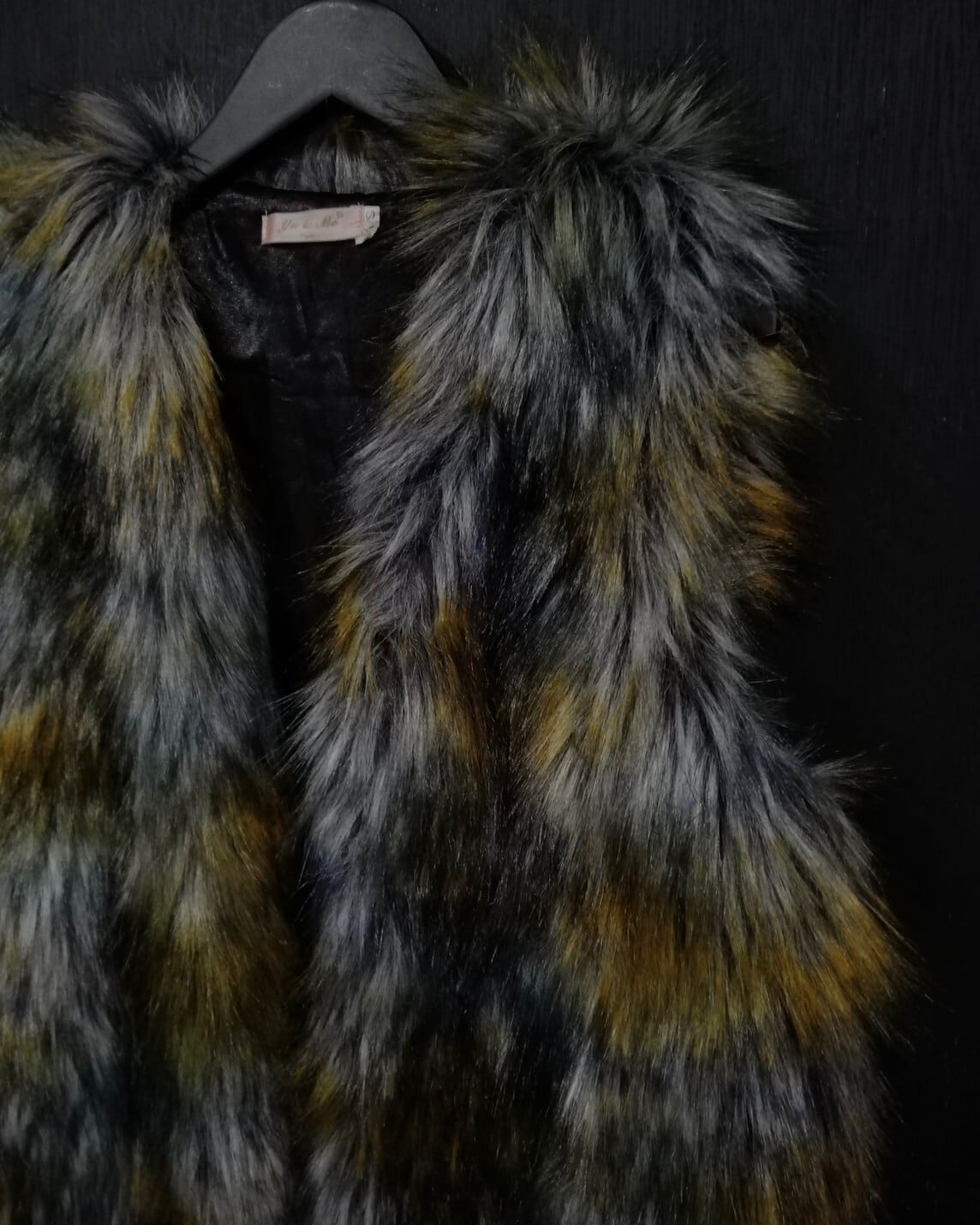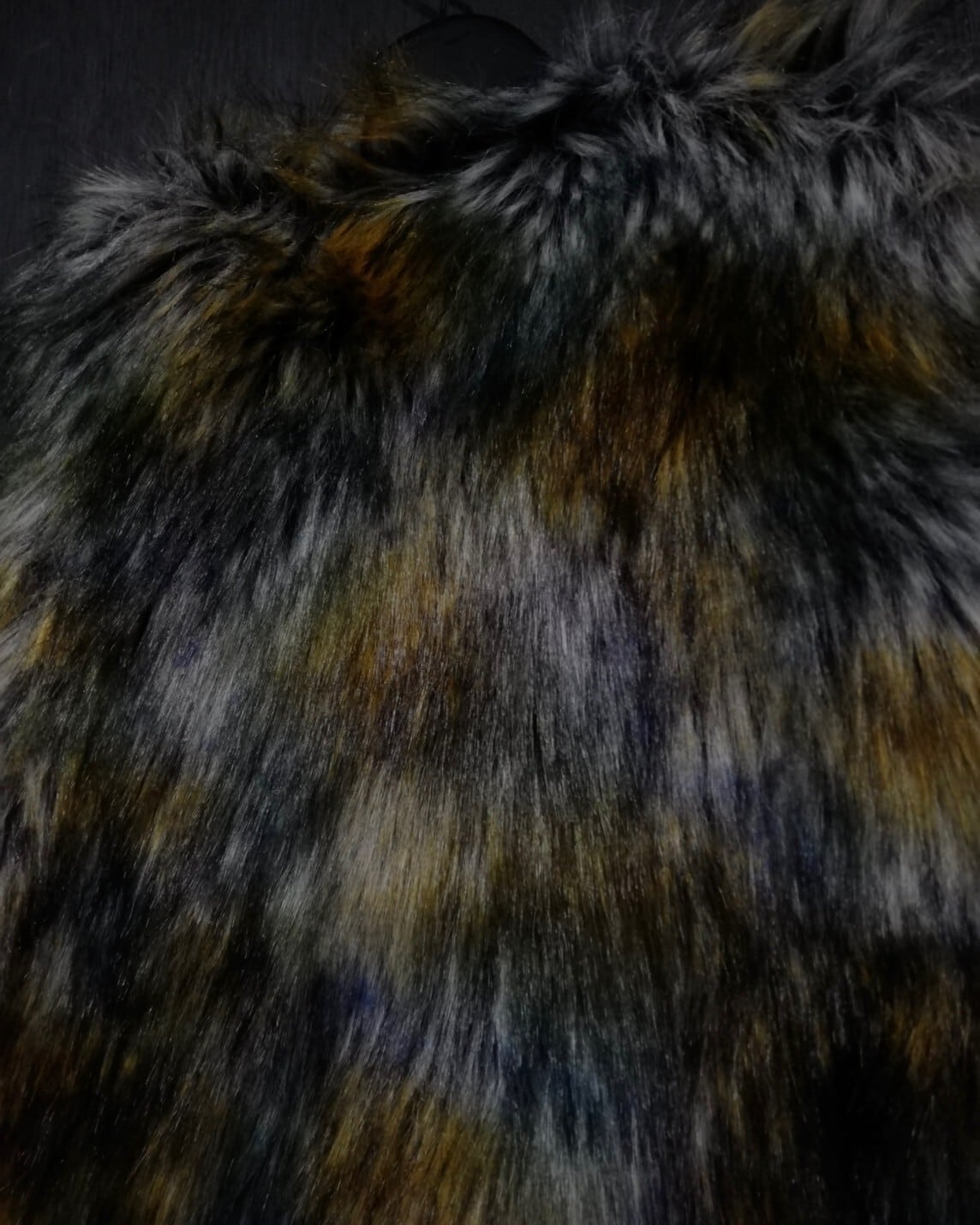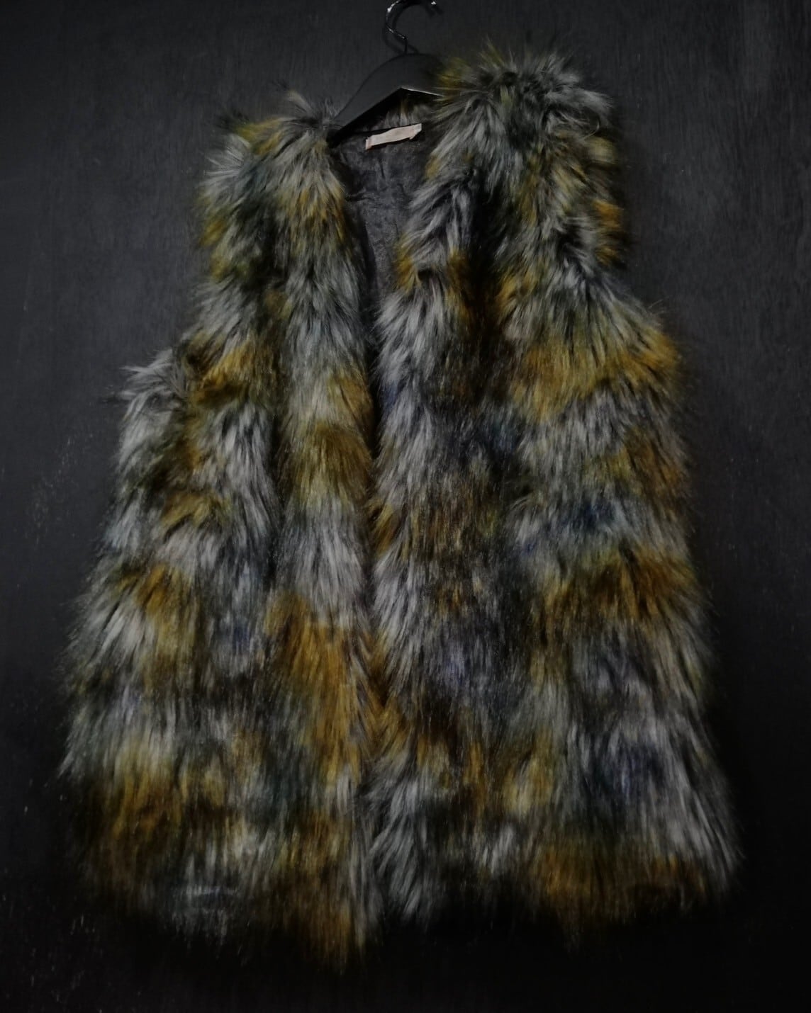黒、黄、白、など配色の美しいグラデーションが表現されたカラーリングで、毛足の長いモッフモフのファーをボディ全面に配したベスト。