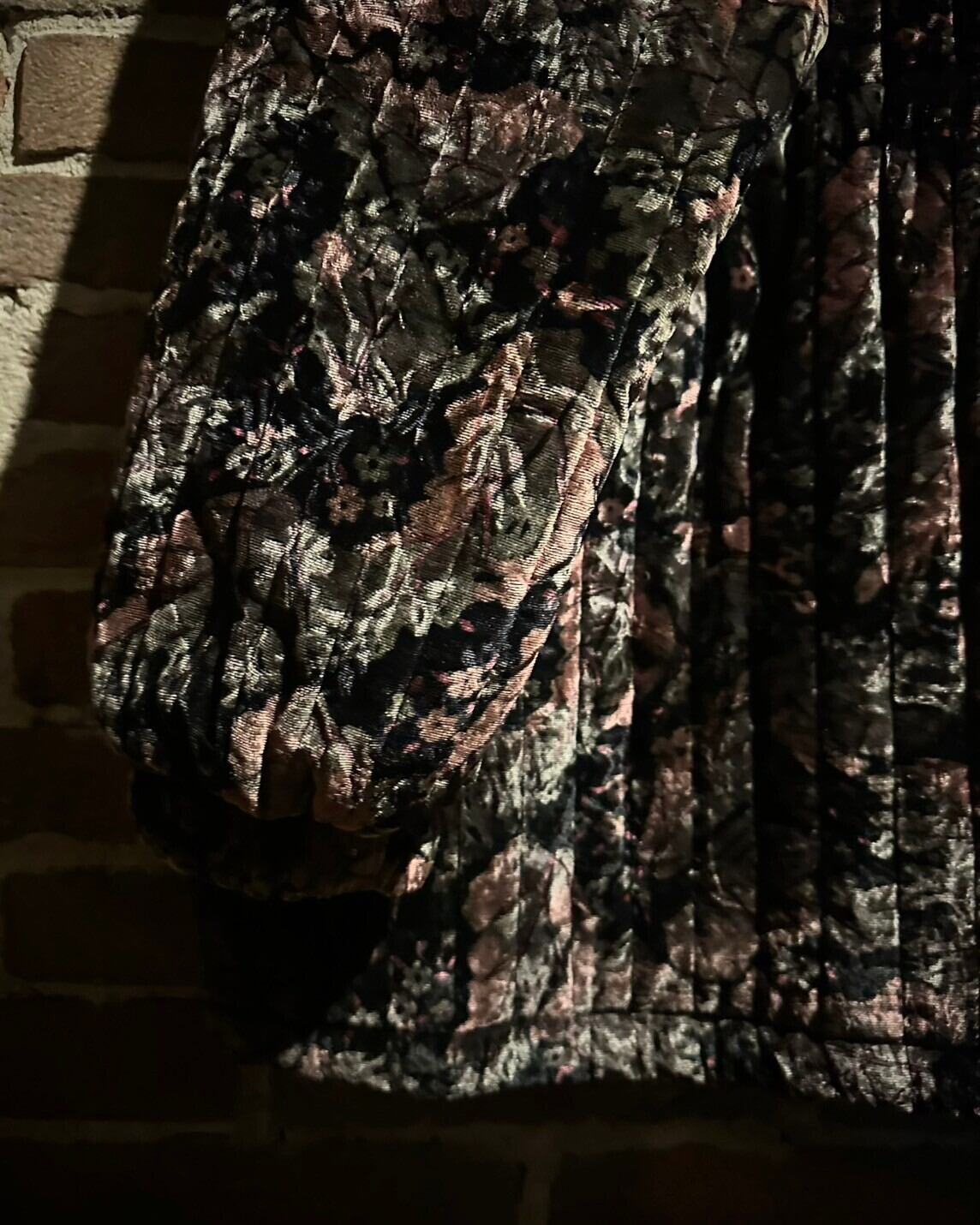 鈍く光沢を放つベロアのボディに、ボタニカル柄を載せたキルティングジャケット。