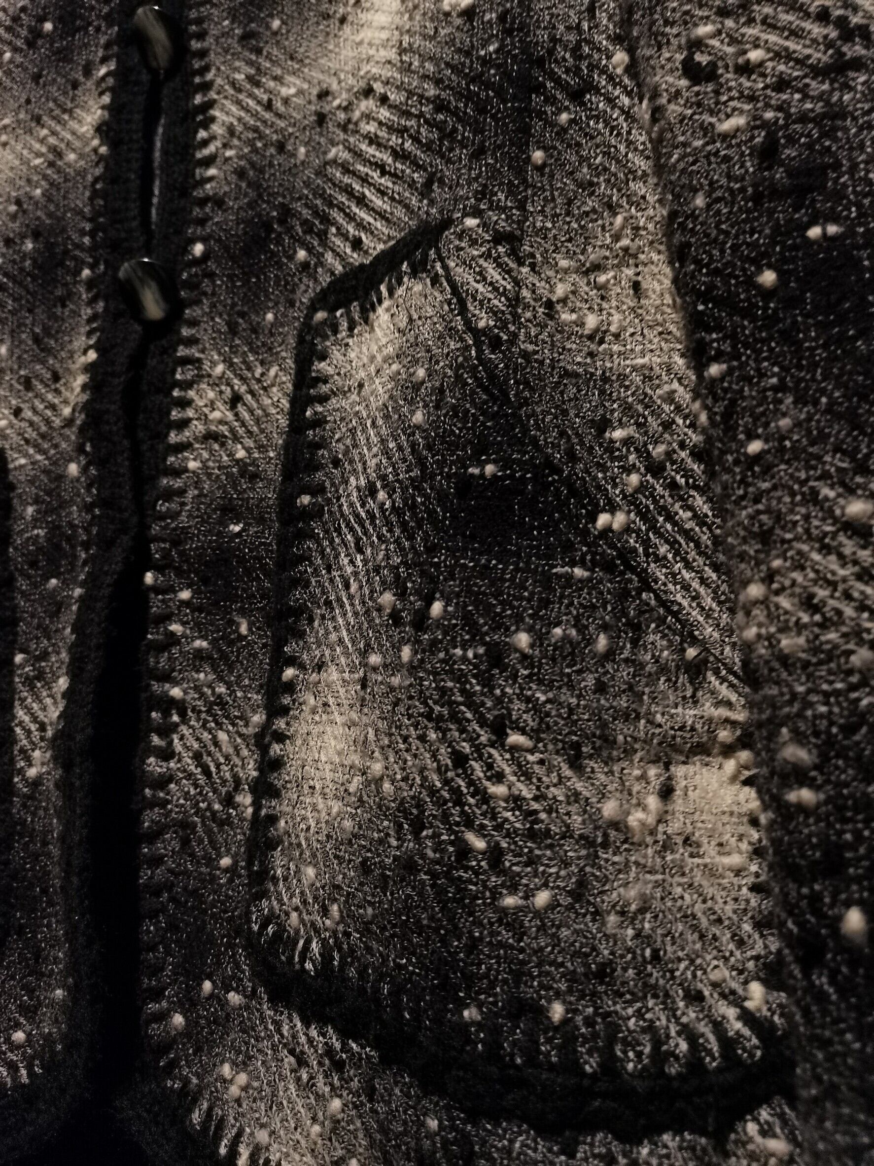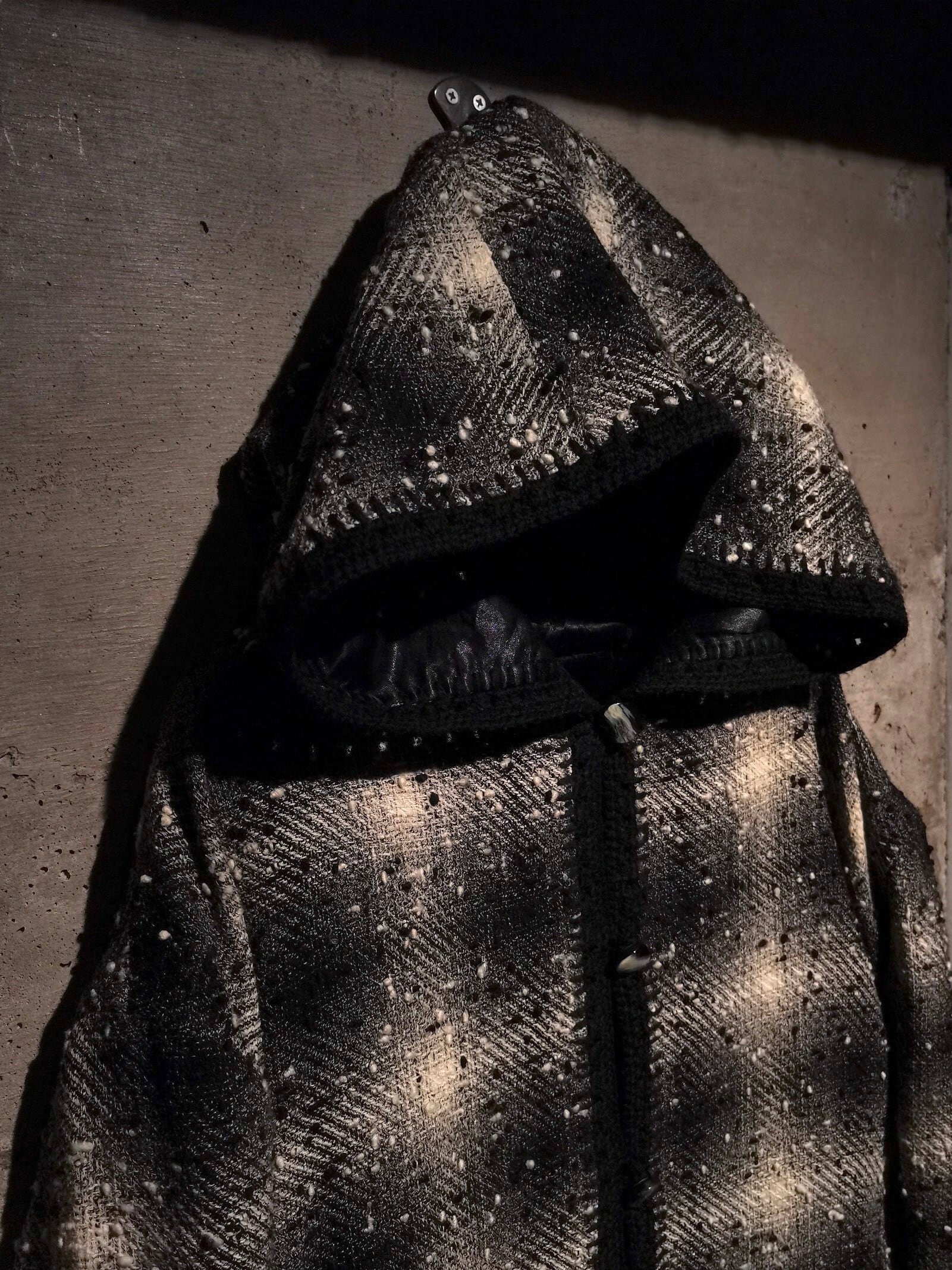 ネップツイードを用いて、白×黒のモノトーンのオンブレチェックをボディ全体に表現した、稀有なフーディシャツジャケット。
